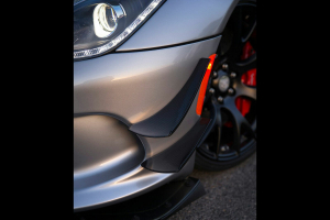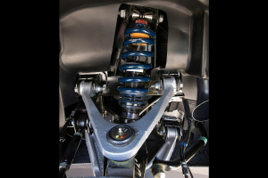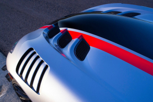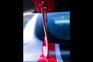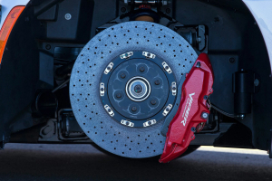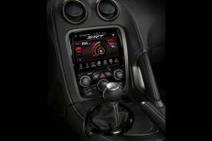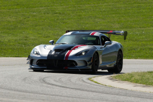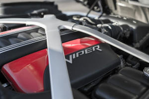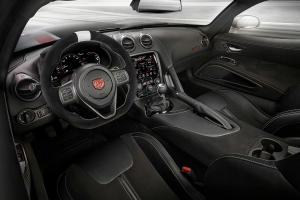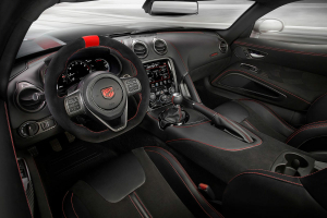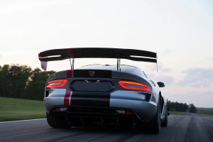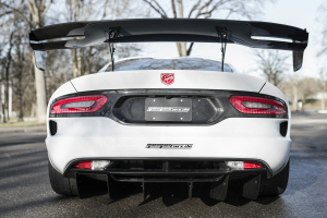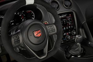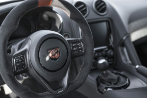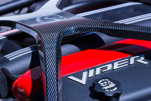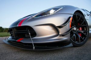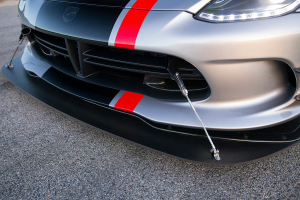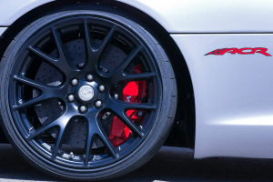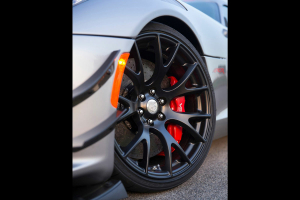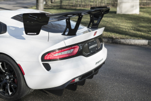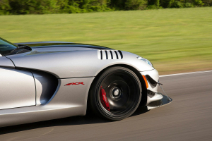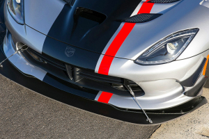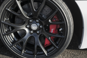 {1}Die Aerodynamik der Dodge Viper ACR allerdings lässt keine Frage offen und erklärt schon auf den ersten Blick, woher die spitzenmäßige Performance herrührt. Bestückt mit dem „Extreme Aero Package“ trumpft das Musclecar mit einem großen Frontsplitter, Flaps, einem 1,88 Meter breiten, einstellbaren Heckflügel, seitlichen Luftleitelementen sowie einem Carbon-Heckdiffusor. Hinzu kommen speziell entwickelte Reifen der Marke Kumo, die vorne das Format 295/25R19 und hinten 355/30R19 aufweisen. Sie sollen eine Querbeschleunigung von bis zu 1,5 g ermöglichen. Hinzu kommen ein einstellbaren Bilstein-Fahrwerk und eine Carbon-Ceramik-Bremsanlage mit 390 Millimeter messenden Scheiben und Sechs-Kolben-Sätteln vorn und 360er Scheiben hinten, die von Vier-Kolben-Sätteln in die Zange genommen werden.