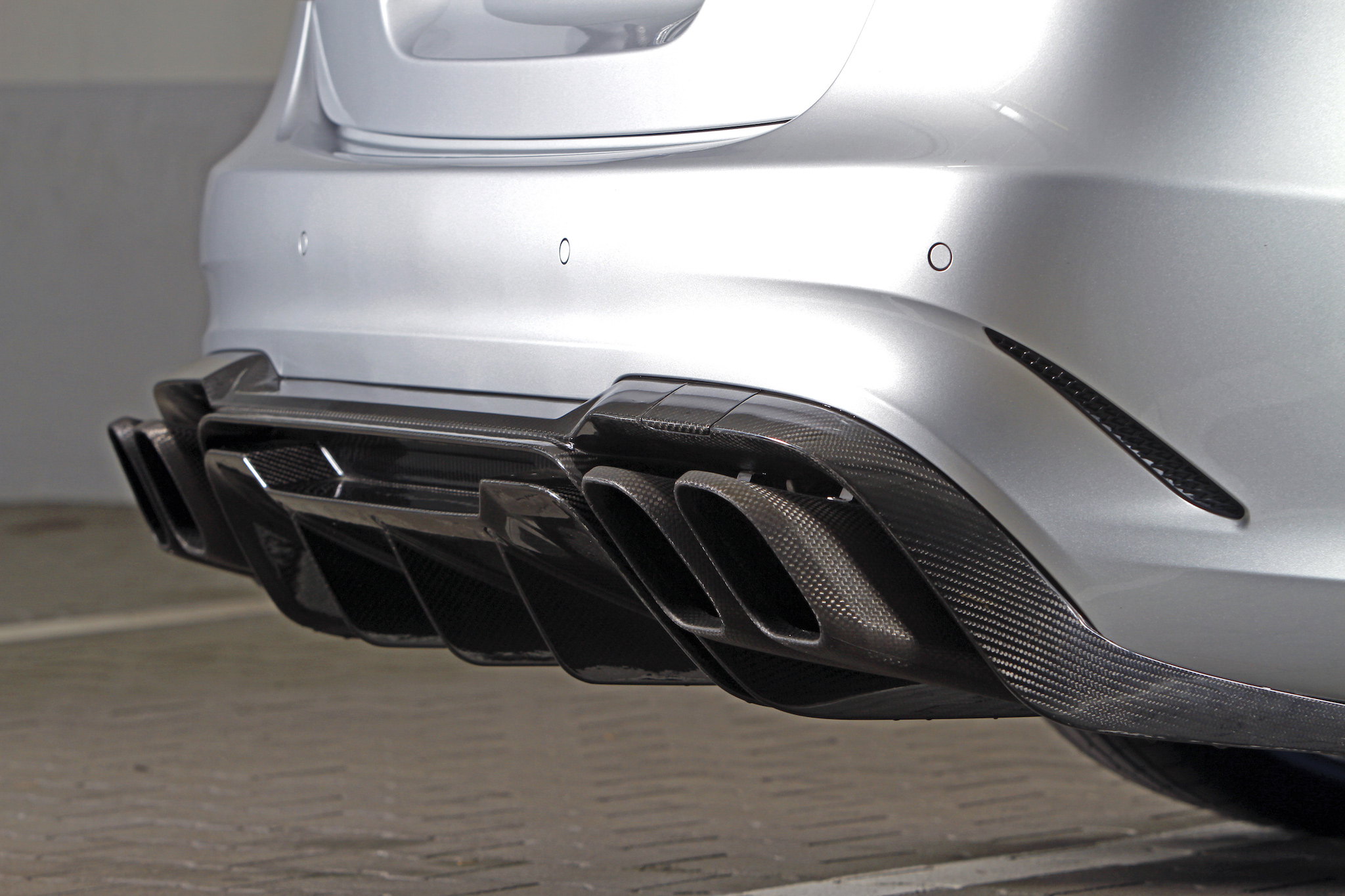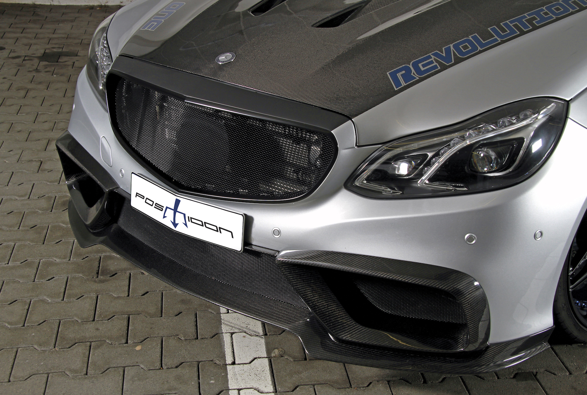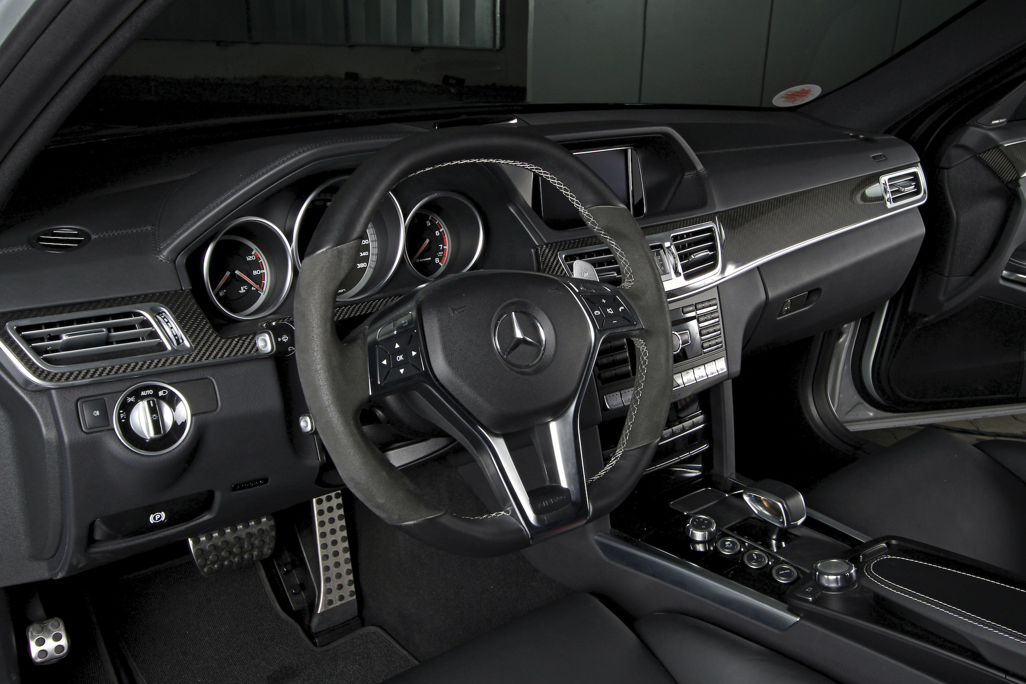 Eingangs sprachen wir ja schon von der Optik – wir haben selten eine martialischere E-Klasse gesehen. Motorhaube, Frontschürze, Endrohrblenden und die restlichen Anbauteile am Heck wurden aus Echtcarbon gefertigt, der Kühlergrill – ehemals mit Stern – besteht zugunsten von besserer Luftzuführung nur noch aus einem Gitternetz. Die 20-Zoll Felgen von ADV.1 verdecken eine Carbon-Bremsanlage, die mit vorne 420-Millimeter-Scheiben und Sechskolben-Sätteln auftrumpft. Damit die Negativbeschleunigung mindestens so beeindruckend ist wie die Leistungsentfaltung. Nach dem Preis für das Geschoss fragen wir aber lieber nicht.