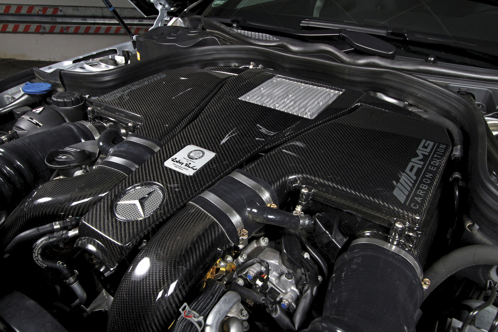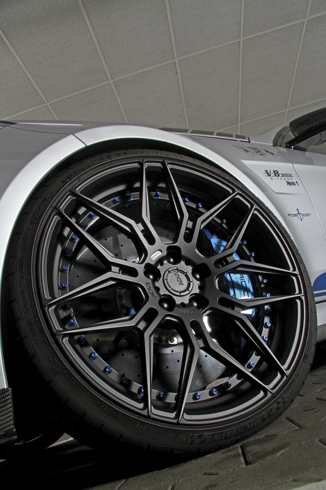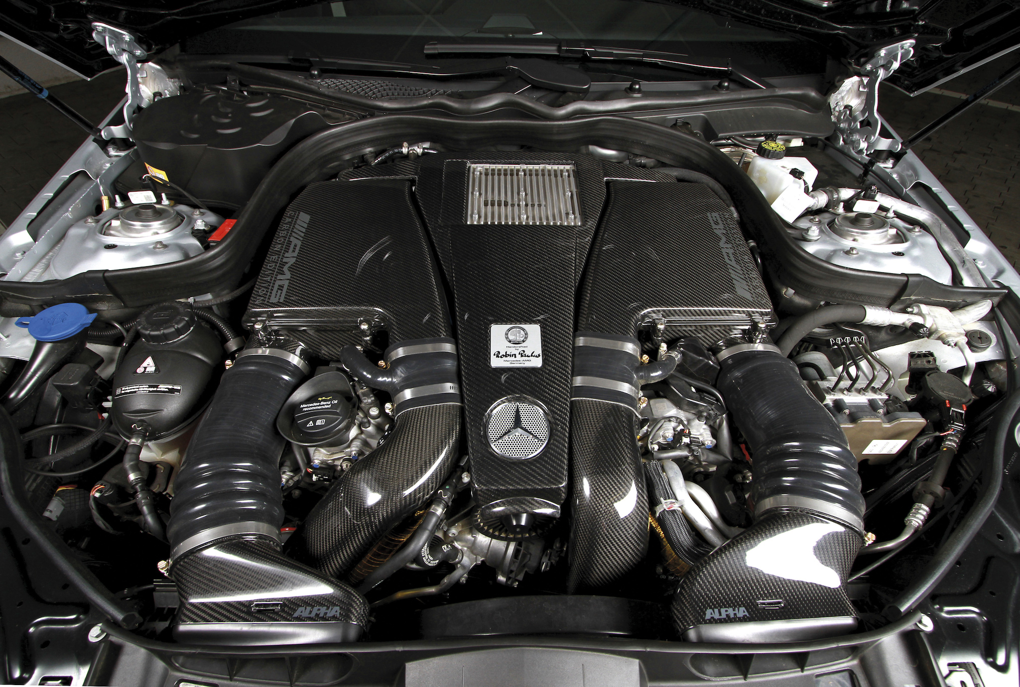 Eingangs sprachen wir ja schon von der Optik – wir haben selten eine martialischere E-Klasse gesehen. Motorhaube, Frontschürze, Endrohrblenden und die restlichen Anbauteile am Heck wurden aus Echtcarbon gefertigt, der Kühlergrill – ehemals mit Stern – besteht zugunsten von besserer Luftzuführung nur noch aus einem Gitternetz. Die 20-Zoll Felgen von ADV.1 verdecken eine Carbon-Bremsanlage, die mit vorne 420-Millimeter-Scheiben und Sechskolben-Sätteln auftrumpft. Damit die Negativbeschleunigung mindestens so beeindruckend ist wie die Leistungsentfaltung. Nach dem Preis für das Geschoss fragen wir aber lieber nicht.