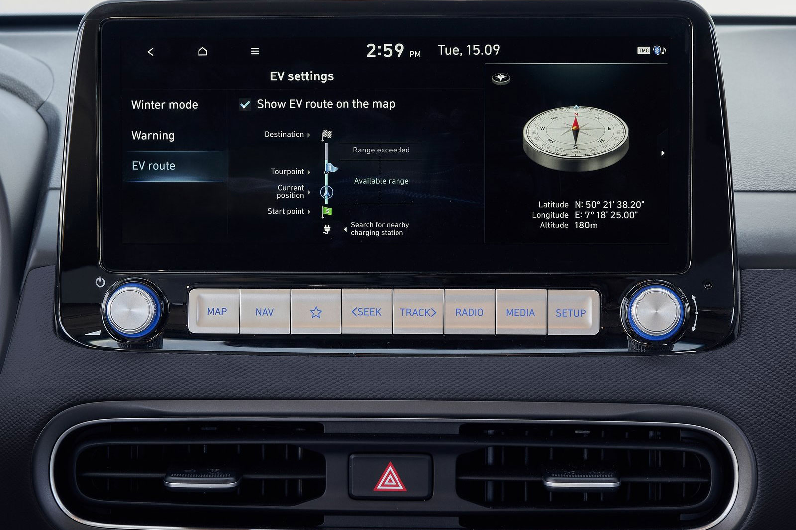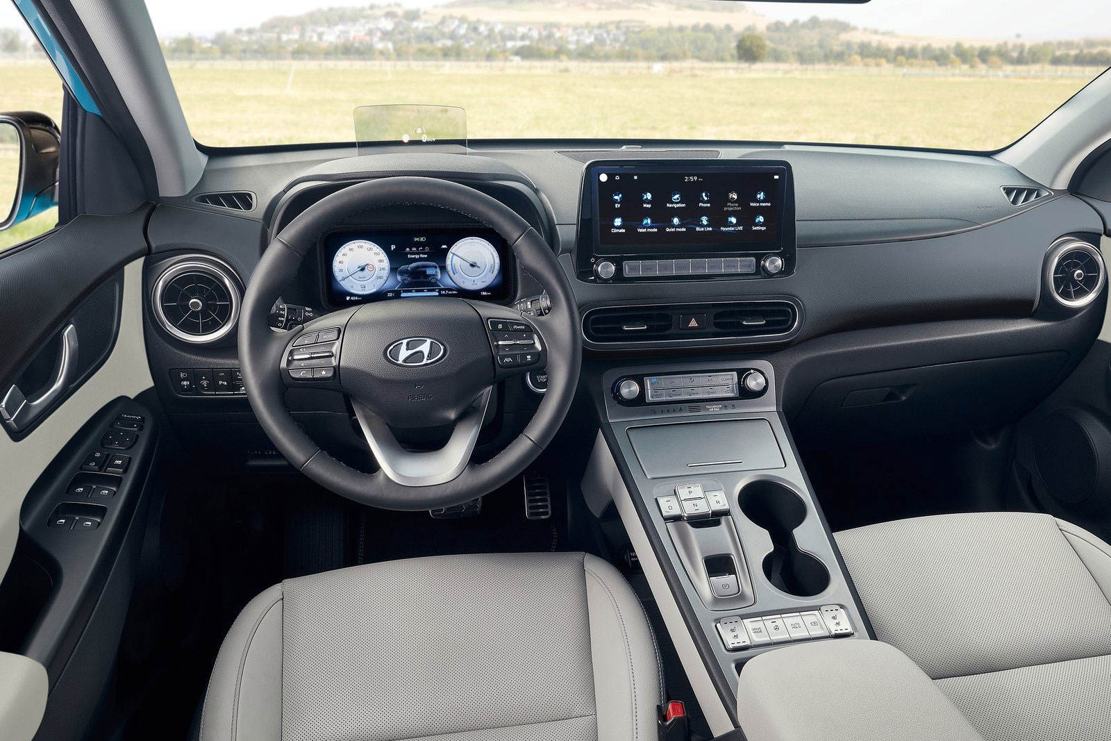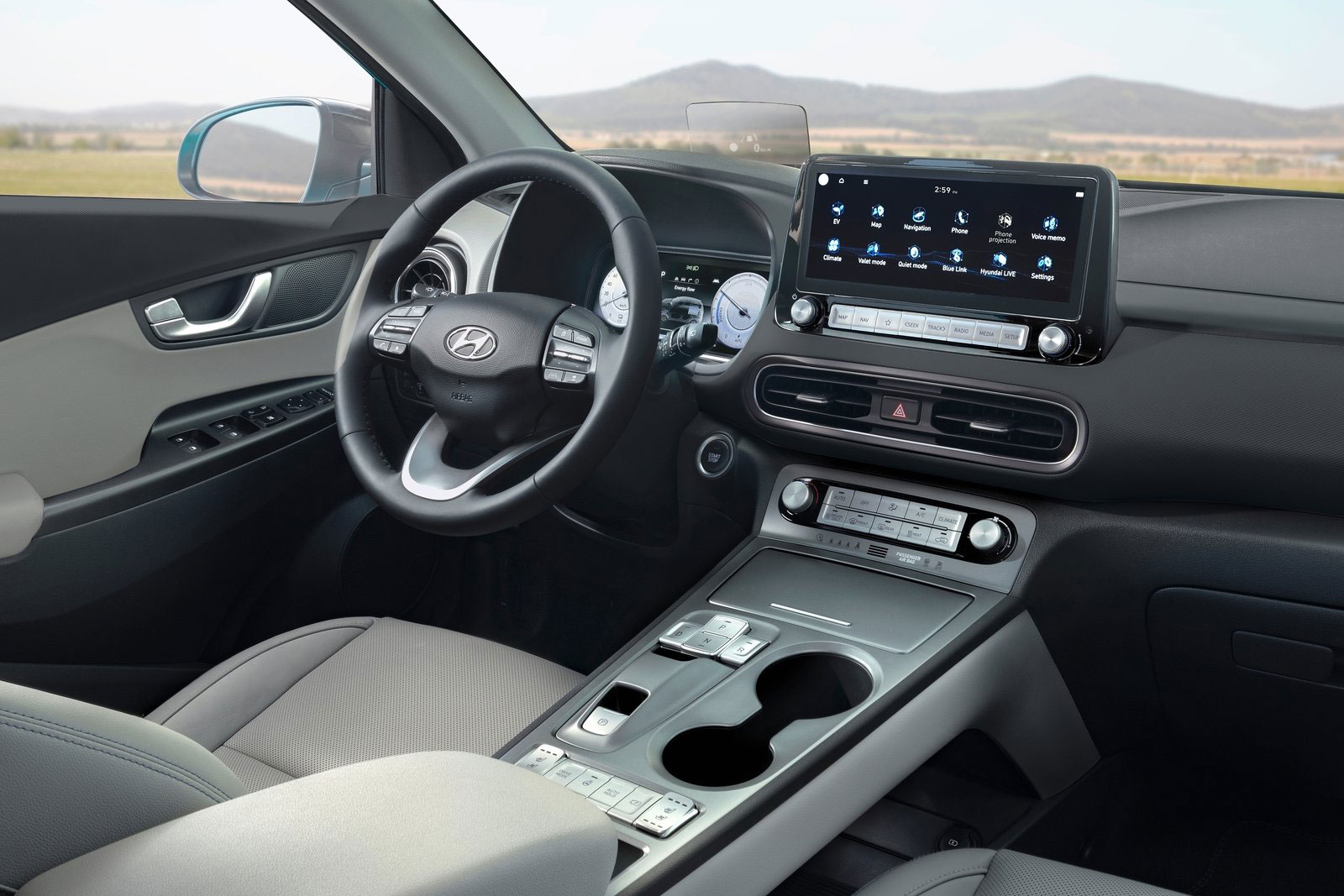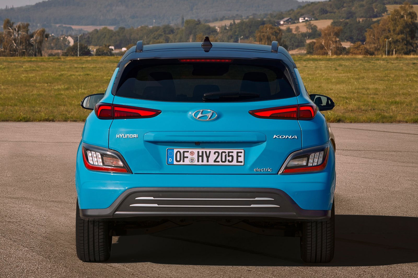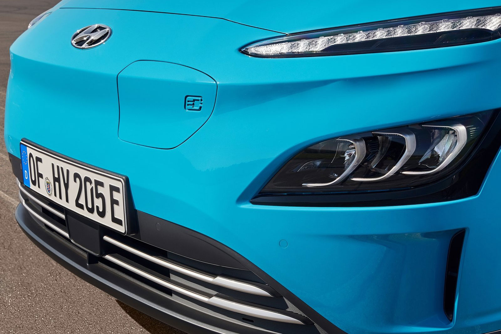 Vor allem an der nun vollständig glatten Front mit modifizierten Scheinwerfern ist der 2021er Kona Elektro zu erkennen. Wie bisher findet sich an der Front auch die Ladeklappe. Am Heck fallen fallen die neue Schürze sowie die neue Licht-Charakteristik der Heckleuchten auf. Im Cockpit bleibt bei auf ein neues, 10.25 Zoll messendes Display eigentlich alles beim Alten.