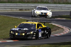 Doch dann begann die Dramatik: Um 21:33 musste der erste Audi R8 LMS das Rennen beenden. Der Bilstein-Renner hatte nach einem Überholmanöver eines defekten Fahrzeuges den Curb unglücklich getroffen und sich dabei sowohl Öl-, wie auch Wasserkühler beschädigt. Ohne Kühl- und Schmiermittel quittierte der 5,2-Liter-V10 schnell den Dienst und beendete die Titelträume des schnellsten Phoenix-Fahrzeuges. Die Abt-Startnummer 2 musste sich nach einem Reifenschaden ebenfalls aus dem Führungskampf verabschieden, wo jetzt die Startnummer 100 von Ekström, Jarvis, Scheider und Werner auf Platz zwei hinter dem Manthey-Porsche um die 25 Kilometer lange Strecke hetzte. Erstmals lag nun auch der BMW M3 GT2 mit der 25 auf Podiumskurs, wie auch der Farnbacher-Ferrari F430 GTC nach einem turbulenten Wochenende mit Platz 9 in der Top-Ten angekommen. Für noch mehr Spannung sorgte dann der Unfall des Führenden.