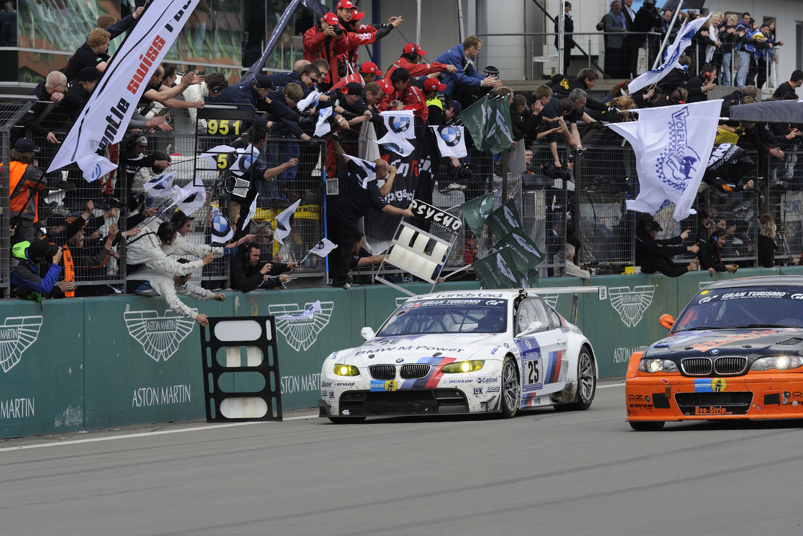Das Rennen dominierten in Folge der Hybrid-Porsche und der Abt-Audi mit der Nummer 2, wie auch der M3 GT2 und der Farnbacher-Ferrari das Quartett an der Spitze festigten. Fast schon unheimlich muteten dann die Fernseh-Bilder um 10:30 Uhr an, als man den Abt-Audi am Pflanzgarten am Haken des Abschleppwagens sah. Eine defekte Antriebswelle beendete die letzte Audi-Hoffnung auf den Traum des Rennsieges. Die Manthey-Mannschaft schien wie der sichere Sieger, nachdem der Hybrid-Porsche nun fehlerfrei und konstant schnell das Rennen nach Belieben dominierte. Doch die Ruhe währte nicht lange, denn schon kurz darauf fand sich der orange-weiße Öko-Renner unplanmäßig in der Box zur Reparatur eines defekten Krümmers. Zwar konnte der Porsche wieder auf die Strecke geschickt werden, um kurz nach 13:00 Uhr war das Rennen aber auch für die Startnummer 9 gelaufen, als sich der Hybrid-911 ohne Vortrieb an der Breidscheider Brücke einfand und das Rennen vorerst aufgeben musste. Das Fahrerlager stand Kopf, denn plötzlich zeigte die Zeitentafel die Startnummer 25 auf der ersten Position. Der Werks-BMW hatte sich also klammheimlich an die Spitze gearbeitet, nachdem das Team fehlerlos durch die vergangen 22 Stunden gekommen war.