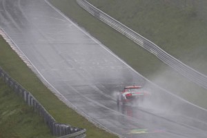 Weniger glücklich schaute das Nissan-Team drein, denn aufgrund eines geplatzten Kühlerschlauches musste man sich trotz der Wassermassen über Flüssigkeitsmangel Sorgen machen. Und so musste der vielbeachtete Nissan GT-R GT3 des Schulze Motorsport-Teams vom Piloten ohne Kühlwasser volle zehn Kilometer bis zurück zur Box gebracht werden. Resultat: Motorschaden und viel Arbeit für das Mechanikerteam. Die Mühen wurden kaum belohnt, denn gerade als der blaue Japaner wieder Fahrt aufgenommen hatte, wurde das Rennen unterbrochen. Zu stark der Regen in einigen Sektionen, zu schlecht die Sicht durch heftige Nebelbänke.