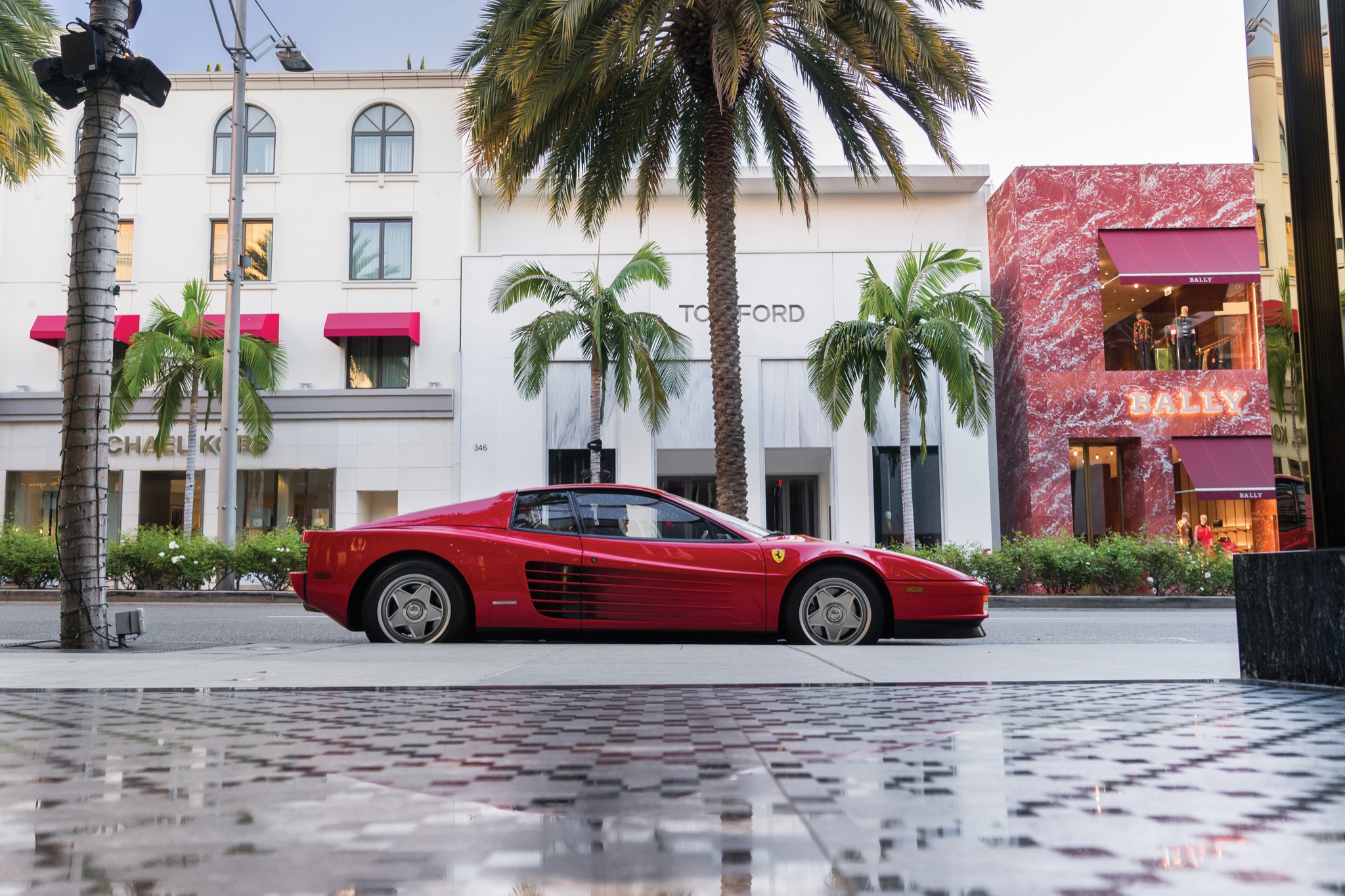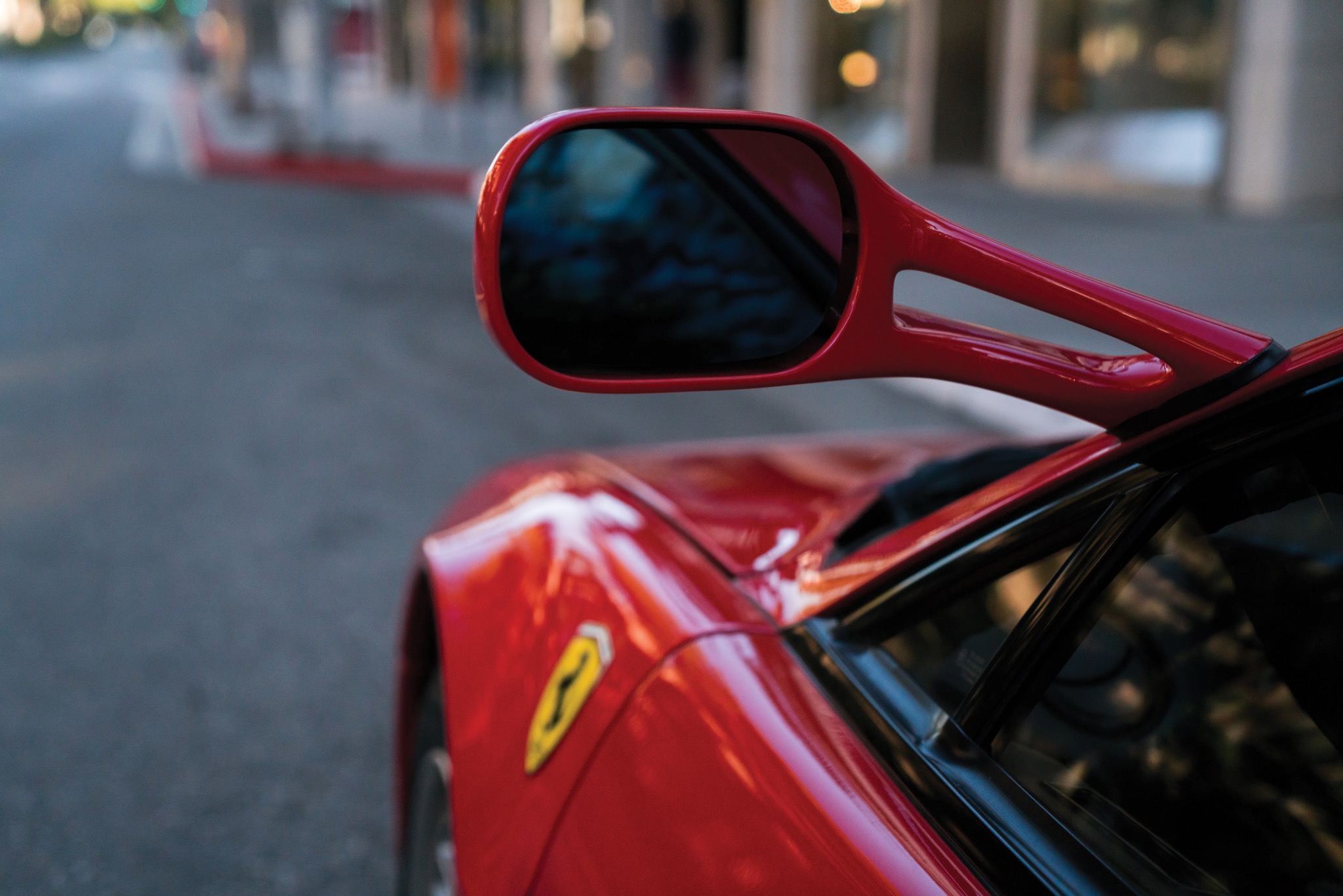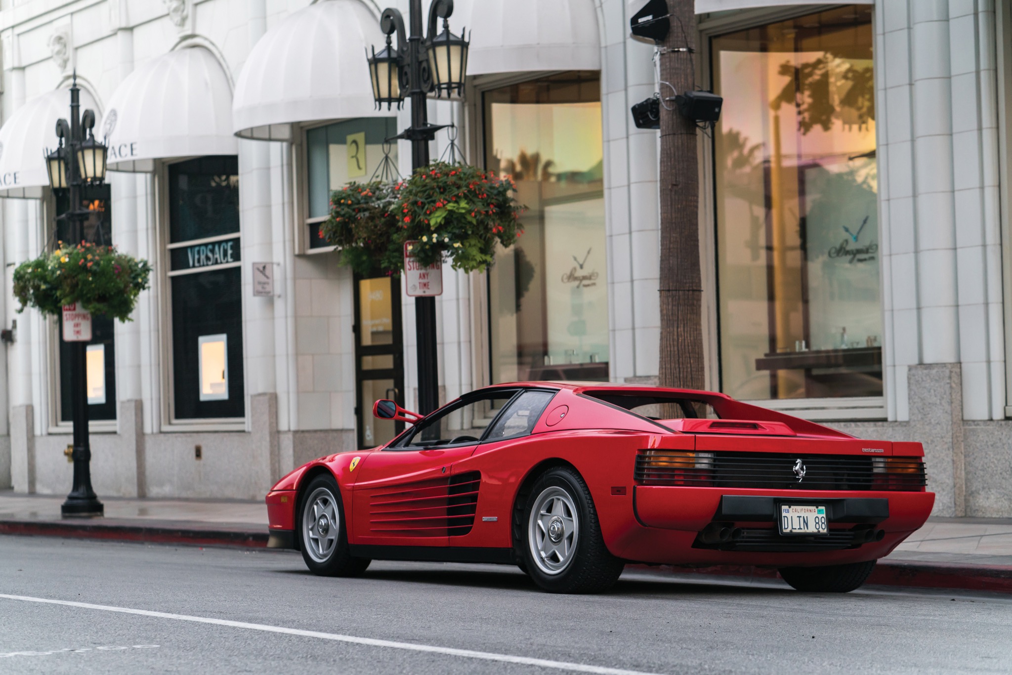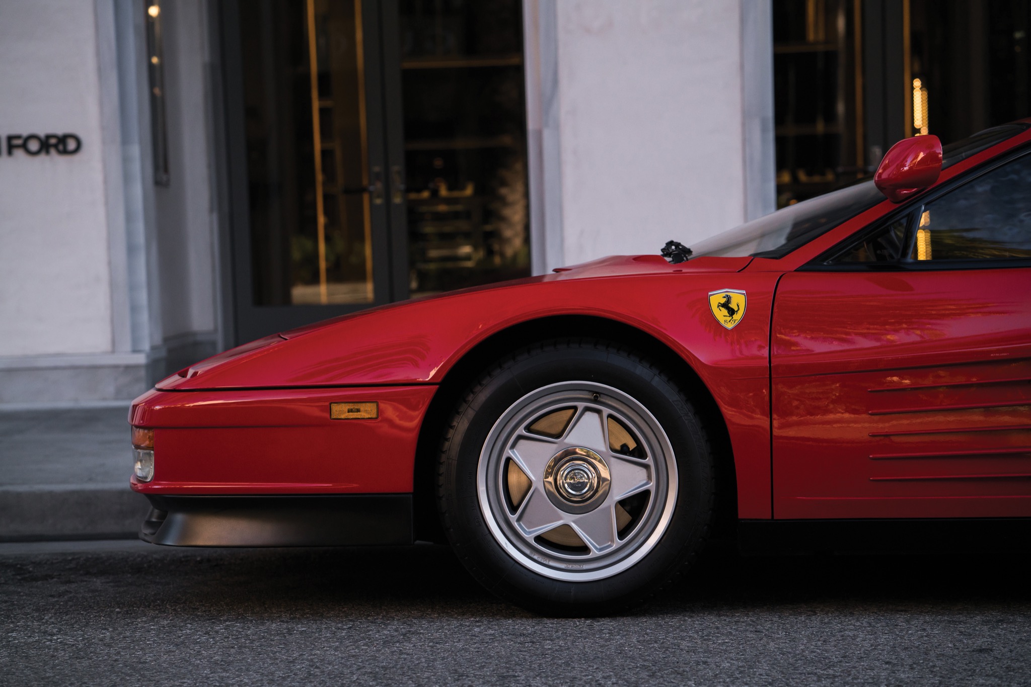 {1}Das lag nicht zuletzt am aufwendigen Fahrwerk, das man in Maranello ausgetüftelt hatte. Doppelquerlenker je Rad und zwei Federbeine an der Hinterachse sowie 255 Millimeter breite Reifen hinten sollten die überaus ungünstige Gewichtsverteilung von 40:60 ausgleichen. Von einer Servolenkung konnten damalige Besitzer trotzdem nur träumen, so viele Zugeständnisse wollte Enzo dann doch nicht machen. Interessanterweise errang der Testarossa seine größte Bekanntheit nicht in der Farbe Rot, sondern in weiß: Eine seltene „Monospecchio“-Ausführung (mit lediglich einem hoch angesetzten Außenspiegel auf der Fahrerseite, viele Besitzer rüsteten den zweiten nach) spielte die Hauptrolle neben Don Johnson und Philip Michael Thomas in der Serie Miami Vice.