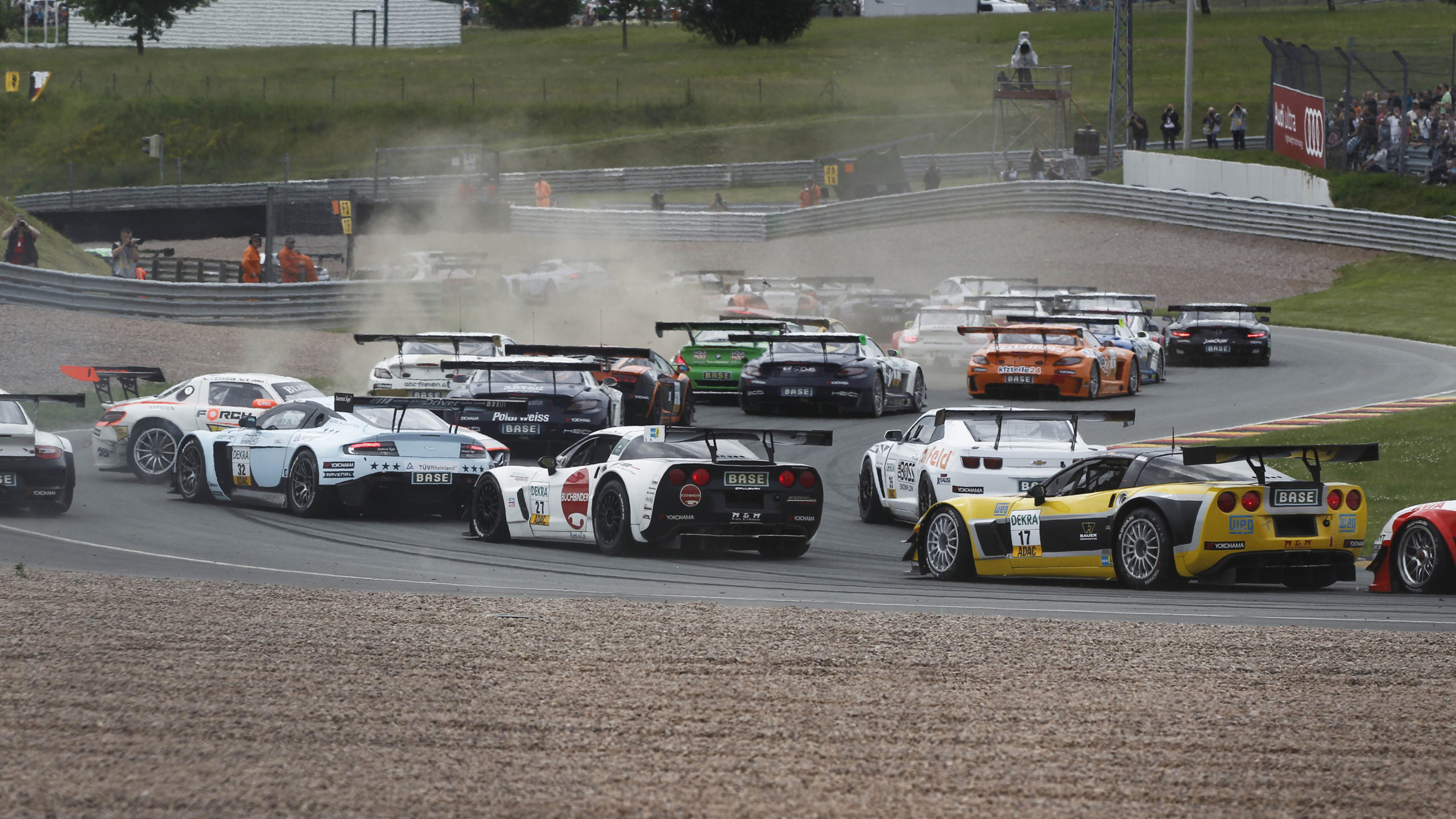 In einem spannenden Zieleinlauf mit den ersten Drei innerhalb von nur 1,4 Sekunden belegten Christopher Mies und Edward Sandström im Audi R8 Platz zwei. Einen starken Einstand in der „Liga der Supersportwagen“ gaben Formel-2-Champion Mirko Bortolotti und Abdulaziz Al Faisal im BMW Z4, die Dritte wurden. „Unglaublich! Respekt für Kristian, dass er dem starken Druck der Konkurrenz in den letzten Runden standgehalten hat“, lobte Nygaard seinen Landsmann Poulsen. Schon in der ersten Rennhälfte war das Sonntagsrennen hochspannend. Polesetter Daniel Keilwitz (Callaway Competition) setzte sich nach dem Start an die Spitze, gefolgt von Dominik Schwager (Schubert Motorsport) im BMW Z4 und Maxime Martin (ALPINA) im BMW-ALPINA. Schwager folgte Keilwitz im ersten Rennviertel mit weniger als einer Sekunde Rückstand, musste sich dann allerdings von allen Sieghoffnungen verabschieden, als der BMW-Pilot eine Durchfahrtsstrafe nach einem Regelverstoß beim Start antreten musste. Auch der drittplatzierte Martin hatte Pech, der Belgier musste nach einem Reifenschaden einen unplanmäßigen Boxenstopp einlegen.