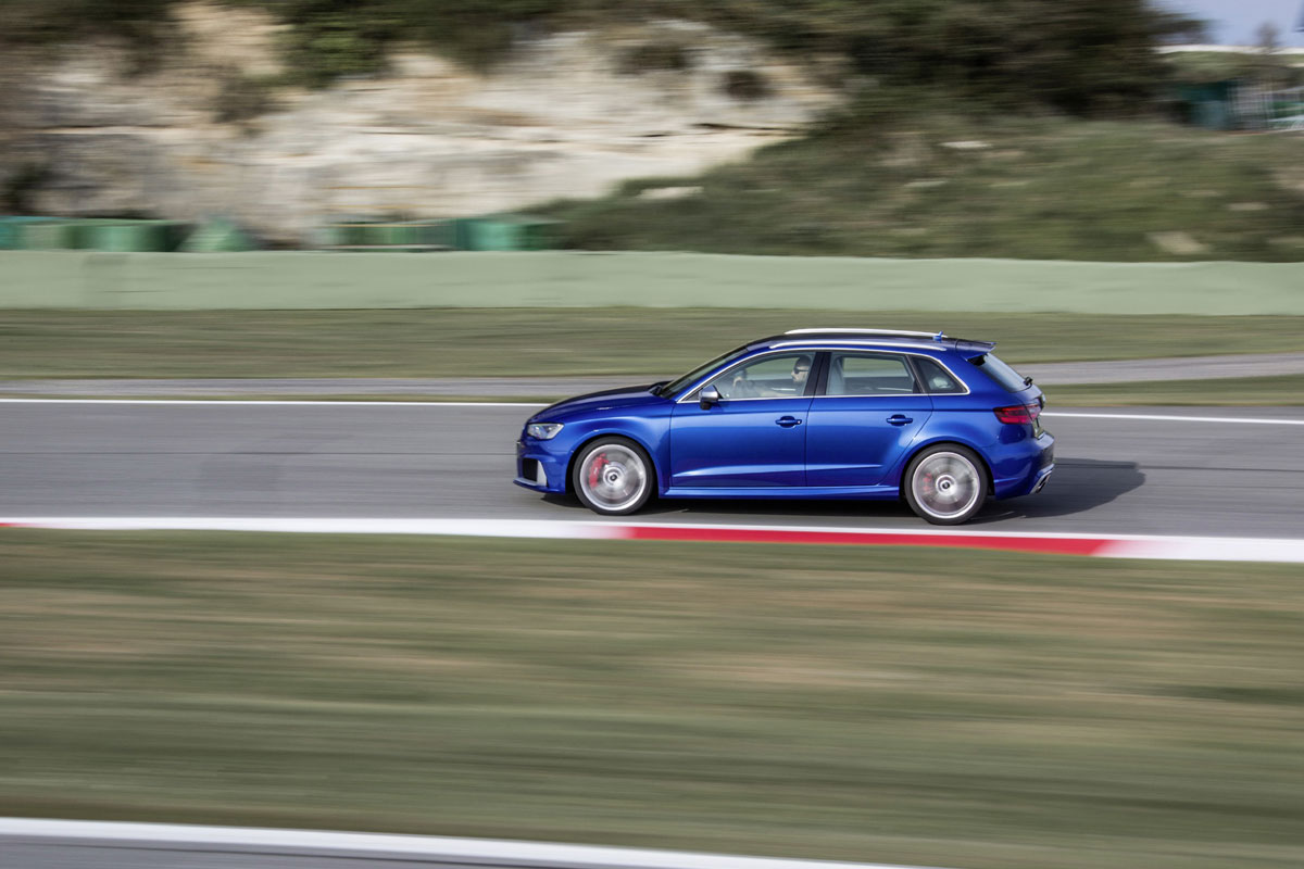 Befeuert wird der Fünftürer vom bekannten 2,5-Liter-Fünfzylinderturbo, der seine Kraft über ein Sechsgang-DSG abgibt. Damit soll’s dann in 4,3 Sekunden auf Tempo 100 und weiter bis zum abgeregelten Topspeed von 250 km/h gehen. Optional kann natürlich wieder bis Tempo 280 angegast werden. Um die Schose auch wieder zackig zum Stillstand zu bekommen, kann der RS3 auf Wunsch auch mit einer Carbon-Keramik-Bremse bestückt werden. Den Kontakt zur Straße stellen 235/35er Gummis ringsum her. Optional kann wieder eine Mischbereifung mit 255/30er Reifen vorn und 235/35ern hinten bestellt werden.