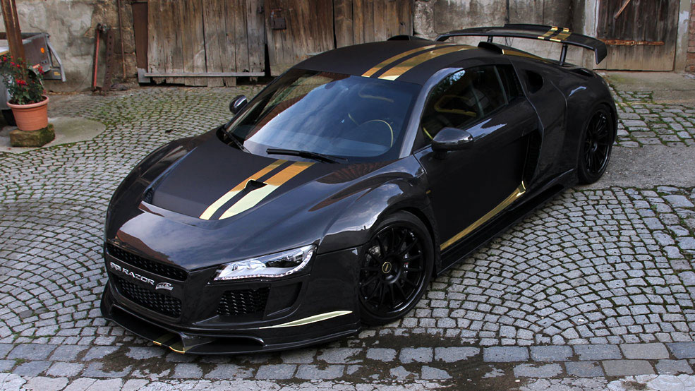 hließlich schafft der um immerhin 250 Kilogramm erleichterte Tuning-R8, dem Einsatz von reichlich Carbon-Fiber sei Dank, den Sprint auf Tempo 100 in beachtlichen 3,2 Sekunden und mit 335 km/h Höchstgeschwindigkeit ist er immerhin 15 km/h schneller als der Audi R8 GT. Neben der Gewichtsreduktion auf 1375 Kilogramm sind die Fahrleistungen vor allem auf die gestiegene Leistung des 5,2-Liter-V10 hinter den Insassen zurückzuführen. Mittels optimiertem Ansaugtrakt (inkl. Lufthutze), neuer Steuersoftware und durchsatzfreudigerer Abgasanlage bringt es der Saugmotor nun auf 601 PS bei 7400 Umdrehungen und 565 Newtonmeter bei 6400 Umdrehungen. Der Leistung angepasst wurde auch die verbaute Automatik (R-tronik).