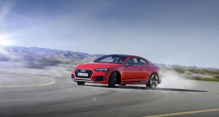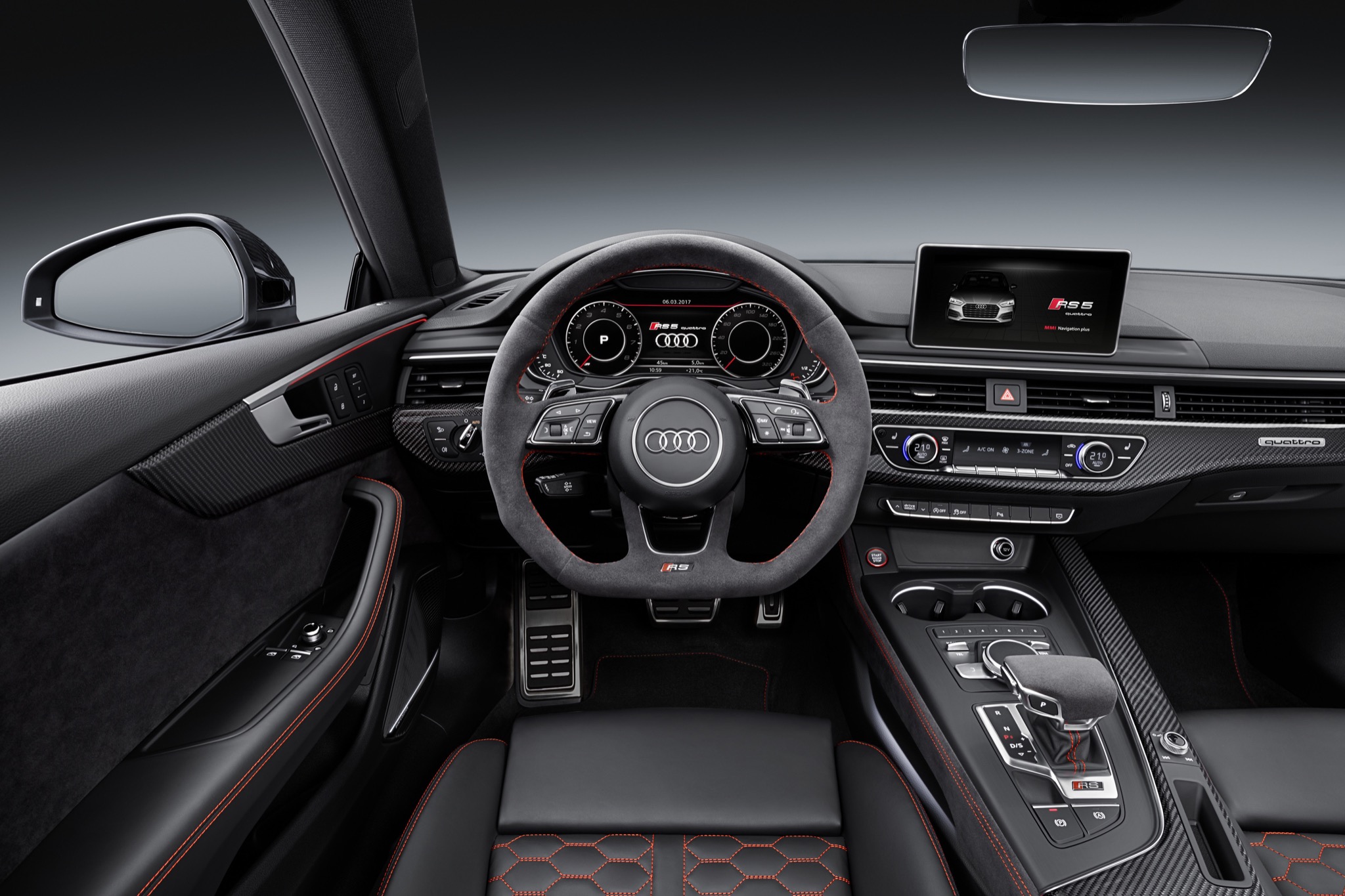 Audi betont außerdem die Gewichtsreduktion im Vergleich zum Vorgänger, die mit 1.655 Kilogramm Leergewicht immerhin 60 Kilogramm beträgt. Das Dach besteht optional aus Sichtcarbon. Die Kraftübertragung erfolgt wie gewohnt auf alle vier Räder mit einer Verteilung von 40:60 zugunsten der Hinterachse. Ebenso optional liefert Audi das sogenannte Sportdifferential an der Hinterachse, diese wird nun auch als Fünflenkerachse anstelle der bisherigen Trapezlenker ausgeführt und hierdurch soll die Agilität laut Audi nochmals gesteigert werden. Serienmäßig trägt hierfür außerdem das tiefergelegte RS-Sportfahrwerk Sorge, wer möchte, kann auch ein adaptives (DRC: Dynamic Ride Control) RS-Sportfahrwerk plus und eine Dynamiklenkung mit spezieller Abstimmung für den RS5 ordern. Eine Keramikbremse steht ebenfalls auf der Aufpreisliste.