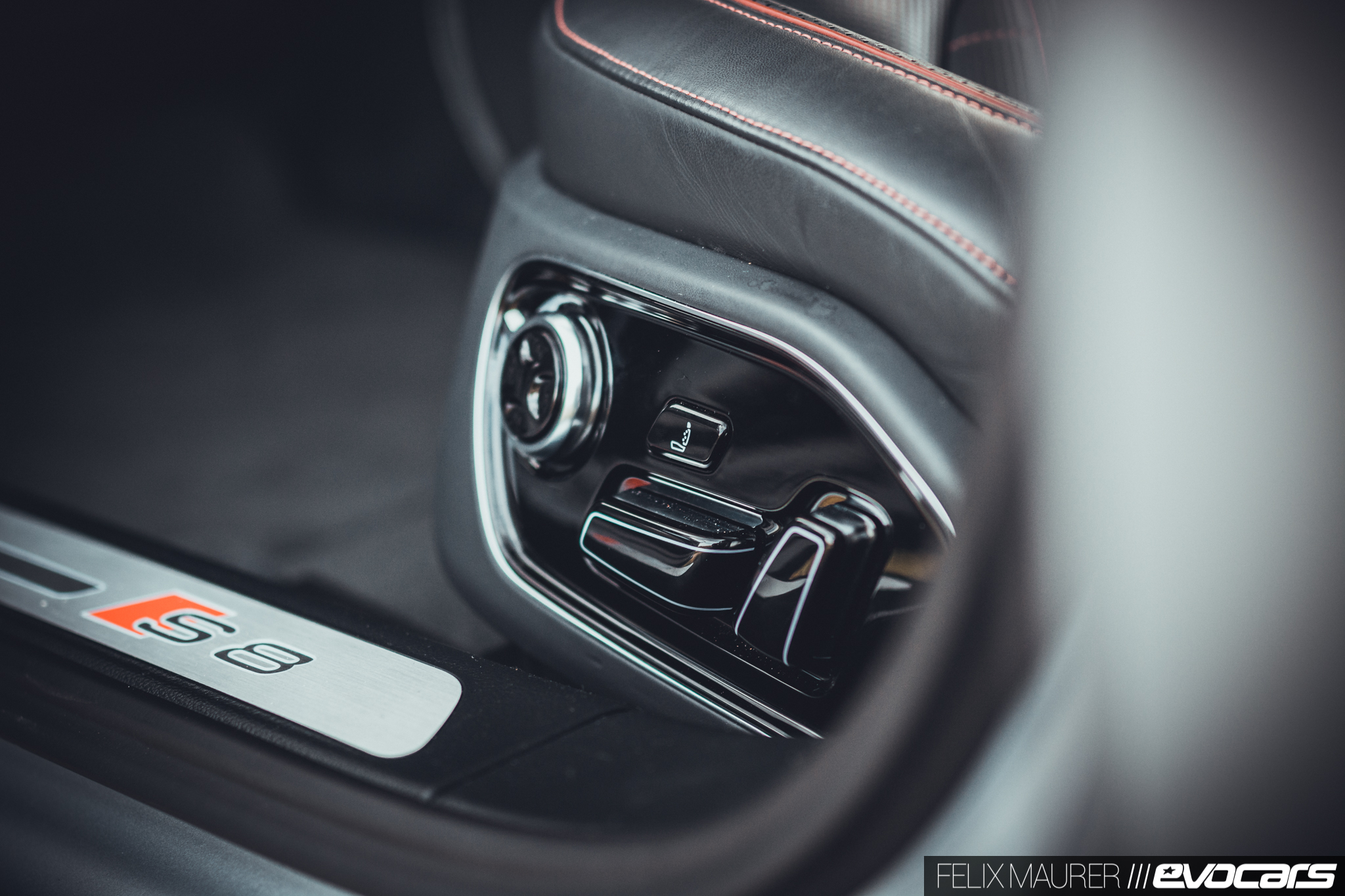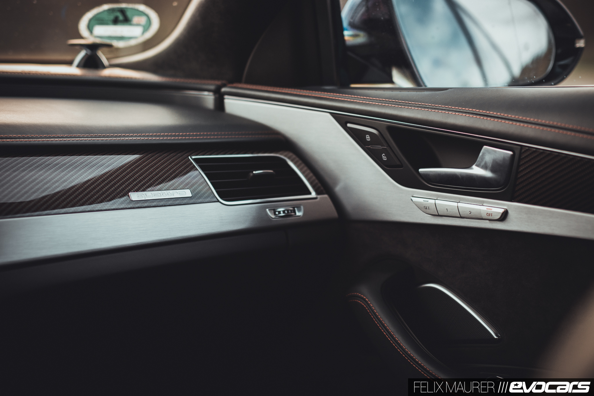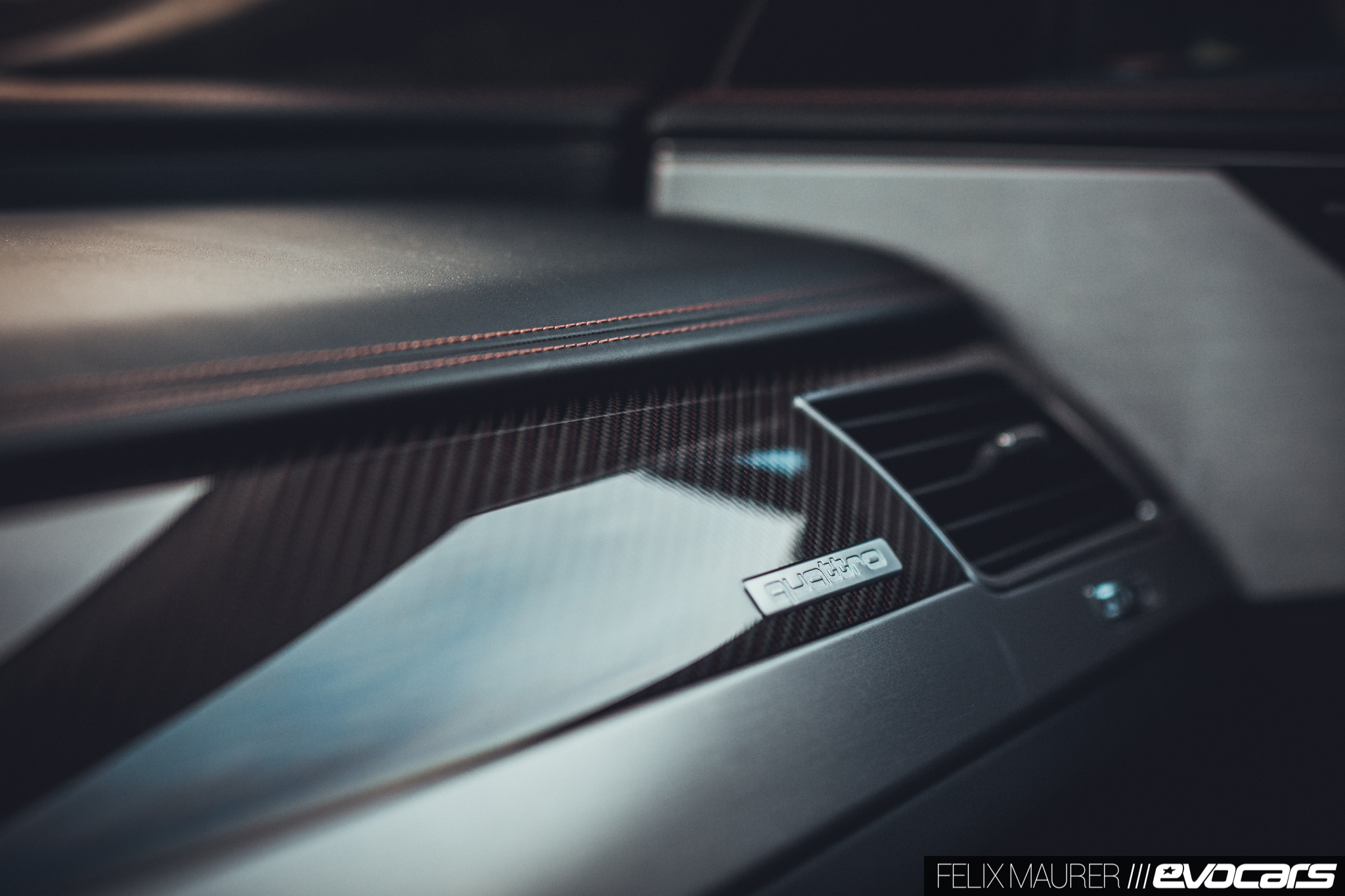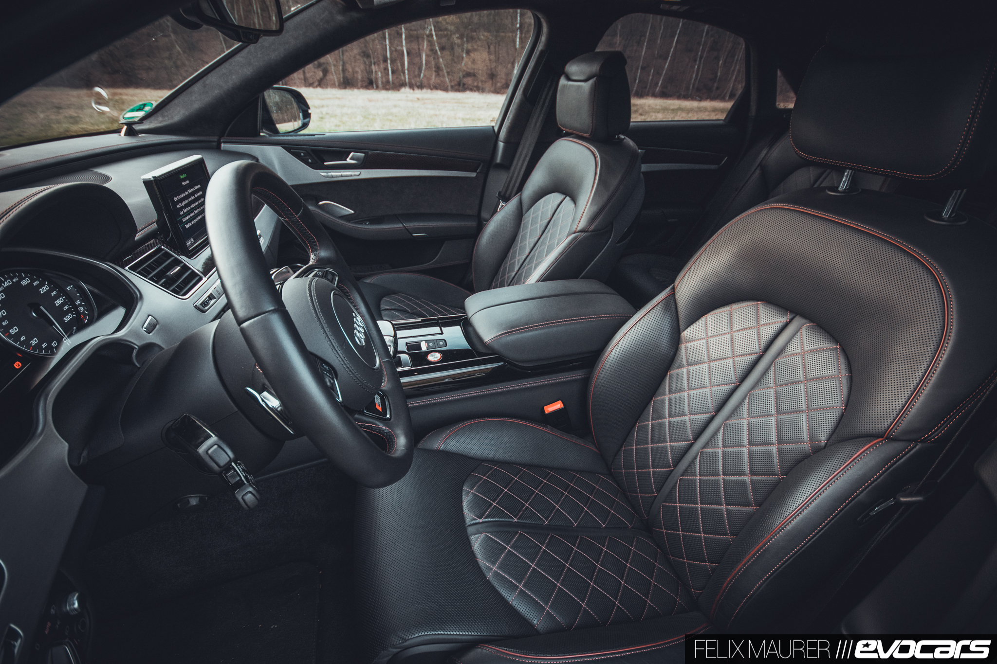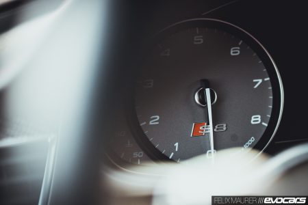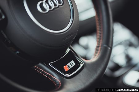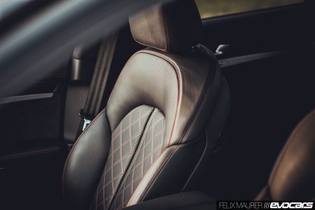 Der Kenner entlarvt das Modell mit den 85 Zusatz-PS womöglich erst im Innenraum, wo serienmäßig rote Ziernähte auf dem voll belederten Armaturenbrett und den vorzüglichen Sportsitzen mit Kreuzsteppung sowie Carbon mit eingelassenem roten Faden auf die Passagiere warten. Wir erinnern uns: auch der erste S8 hatte als Standardausstattung Zierleisten aus Carbon – damals mit blauem Faden – doch nach unserem Empfinden passt ein ordentliches Pfund Holz besser in einen Wagen dieser Klasse. Nicht zuletzt, um dem unsäglich kratzempfindlichen Mitteltunnel in Lack Schwarz zu entgehen. Dem sollte man sich besser nur mit weißen Stoffhandschuhen nähern.