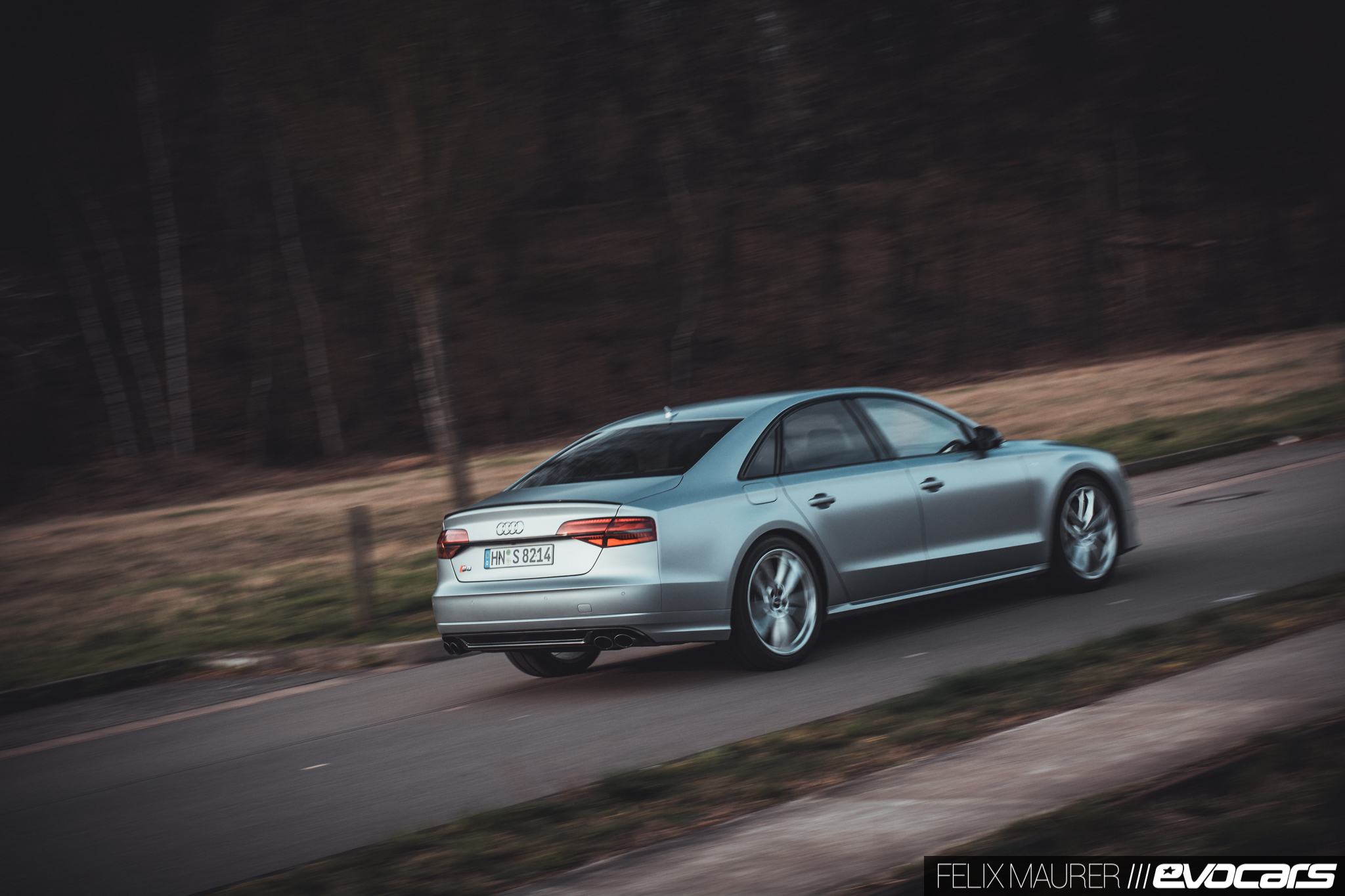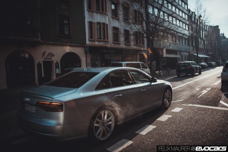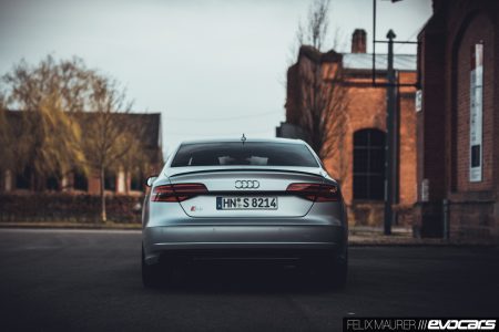 Allzu häufig soll es auf unserer Abschiedstour ohnehin nicht zurück gehen. Deshalb gibt es am Ortsende das bekannte Spiel: pedal to the metal! Und wie der im Vergleich zum normalen V8 im S8 mit größeren Ladern bestückte Vierliter-Achtzylinder die gut 2,2 Tonnen Limousine samt Inhalt nach vorne katapultiert, ist wahrhaftig beeindruckend. Während man beim Standard-Vierliter-Biturbo stets das Gefühl hatte, einen etwas zu kleinen aber dazu umso größer aufgeblasenen Motor zu bewegen, existiert dieses im S8 plus nicht mehr. Fast unmerklich und beinahe so schnell wie ein Doppelkupplungsgetriebe sortiert die ZF-Achtgangautomatik die Gänge, ab 1.800 Umdrehungen pro Minute stellt der Biturbo sein maximales Drehmoment von 750 Newtonmetern zur Verfügung. Der Druck, der auf den Gasbefehl folgt, lässt keinen Mund so lange trocken. Wir maßen eine Beschleunigung von 3,6 Sekunden auf Landstraßentempo, aber auch auf der Autobahn findet man im S8 plus so gut wie keinen Gegner, der bei dieser motorischen Übermacht nicht kleinbeigeben muss. Und die Gegner, die es damit noch aufnehmen könnten, fahren viel zu selten auf der Autobahn umher. Stellt sich mal wieder einer der notorischen Linksfahrer in den Weg, ist man froh um die serienmäßige Keramikbremse, die mit überaus guter Dosierbarkeit und enormer Bremsleistung beim kräftigen Tritt auf das linke Pedal glänzen kann.
