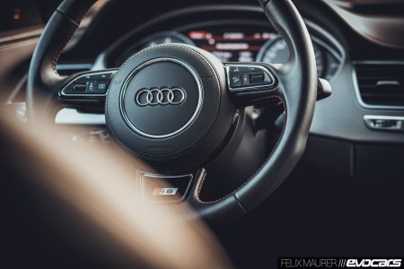 Die Bundesautobahn ist dann auch das Revier, in dem der S8 plus seine Überlegenheit am souveränsten ausspielen kann. Das Getriebe hält die hohen Gänge verhältnismäßig lang und spielt so mit dem beträchtlichen Drehmoment, was eine ordentliche Portion Gelassenheit versprüht und nichtmal zwingend animiert, ständig die Höchstleistung abzurufen. Auch das in zwei Stufen verstellbare Fahrwerk ist über jeden Zweifel erhaben, in der sportlichen Einstellung „dynamic“ ist es ordentlich straff, doch wir erwarten bei einem S8 auch keine Sänfte. Den „comfort“-Modus sollte man tunlichst vermeiden, wenn man eine kurvige Autobahn ein wenig schneller nehmen möchte: hier wird der große Audi schnell schwammig und der Vorderwagen lässt unerwünschte Horizontalbewegungen zu, die wenig Sicherheit vermitteln. In „dynamic“ hingegen sind wir wieder zufrieden: auch bei Tempi über 250 zieht der Allradler stoisch seine Bahn.