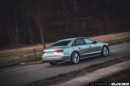 Was wir jedoch erwarten, ist ein ordentlicher Spagat zwischen souveränem Autobahnauftritt und Spaß bei der Hatz auf der Landstraße. Und dem letzteren steht sich der stärkste aller jemals gebauten S8 ein wenig selbst im Weg. Nicht nur, dass man sich beim Ausreizen der Motorleistung ständig im nicht mehr legalen Bereich bewegt, auch das hohe Gewicht des Zweitonners macht sich zumindest in Kurven mit engeren Radien sehr bemerkbar und gegen die dann folgende Seitenneigung können auch die mit aufblasbaren Seitenwangen bestückten Sitze nichts mehr machen. Grenzen setzen in unserem Test sicherlich auch die noch aufgezogenen Pirelli Sottozero-Winterreifen, die bei Temperaturen über 14 Grad auch nicht mehr im optimalen Bereich arbeiteten. Doch für die spaßige Fahrt über Straßen unterhalb einer gut und breit ausgebauten Bundesstraße ist der S8 plus nicht gemacht – das kann die Konkurrenz in Form von Porsche Panamera und Maserati Quattroporte immerhin ein Stückchen besser. Jammern auf hohem Niveau, wir wissen es. Schließlich dürften die wenigsten S8 plus zu diesem Zweck gekauft werden.