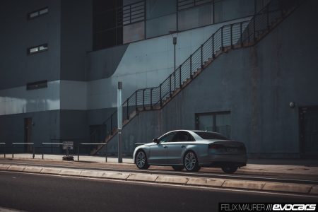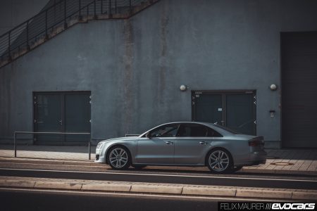 Nun, beinahe 20 Jahre später, stehe ich vor dem imaginären Nachfolger. Die S8-Abzeichen an Front und Heck, unverkennbare Merkmale des Top-of-the-range-Modells aus der Audi-Produktreihe, gibt es immer noch, die Seitenlinie und Form der Fenster ist fast unverändert, doch in Breite und Länge hat der S8 der Baureihe 4H ordentlich zugelegt im Vergleich zum 1994 erstmalig vorgestellten A8 4D. Zu Anfang mochte ich den 4H nicht, er war mir zu groß, zu unförmig, zu überladen. Das Facelift vor knapp vier Jahren tat ihm gut, es straffte die Karosserie, verlieh ihm Kraft auch im Stand. Die mattsilberne Lackierung unseres Testwagens (Florettsilber, 5.390 Euro) tut ihr Übriges dazu, ebenso das serienmäßige schwarze Optikpaket, das allerdings für einen Wagen dieser Klasse ein wenig Fehl am Platze wirkt. Wir würden einen dunklen Farbton – Dunkelgrün zum Beispiel, siehe oben – mit hellen Akzenten bevorzugen.