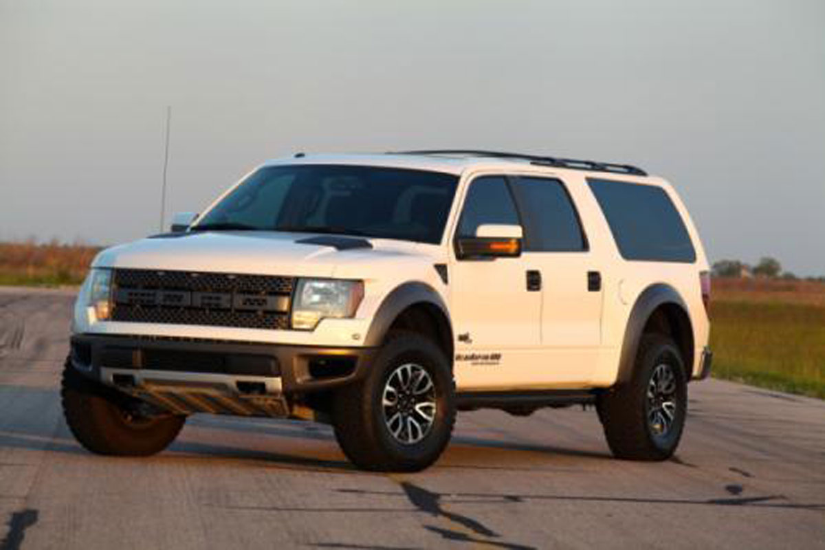 Für Besitzer eines F-150 SVT Raptor der aktuellen Generation, bietet der amerikanische Tuner Hennessey Performance nun eine Abdeckung für die Ladefläche an, die aus dem Pickup ein vollwertiges SUV machen soll. Rein optisch hinterlässt das Umbaukit einen sehr guten Eindruck, schließt bündig mit der Pickup-Form und könnte als solches auch von Ford selbst angeboten werden. Wo vorher die Ladefläche war, offeriert Hennessey nun auch eine dritte Sitzreihe, lässt den Rest des Innenraums aber unangetastet. Für das auf den Namen „VelociRaptor“ getaufte SUV, steht auch ein 6,2-Liter-V8 mit 610 PS zur Auswahl, der den Wagen dann endgültig vom F-150 von der Stange abhebt. Brembo Bremsen und neue Reifen samt Felgen helfen dabei, den Koloss auch wieder zum stehen zu bringen. Zu Fahrleistungen oder Preisen machen die Amerikaner leider keine Angaben, Bestellungen werden aber ab jetzt entgegengenommen.