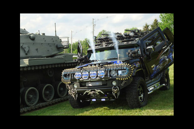 Dann arbeiten wir uns mal von der Front bis zum Heck der Reihe nach durch. Der nördlichste Punkt dieses Ungetüms sind vier blaue, hell strahlende Survival-Rallye-Wüsten-Scheinwerfer. So weit, so normal für einen SUV. Aber gleich dahinter folgt ein dicker Patronengurt, der sich über die gesamte Front spannt. Weiter unten am Schweller finden sich martialisch anmutende Tribals und Totenkopf-Symbole. Die Motorhaube wird verziert von zwei seitlich angebrachten, schweren (und hoffentlich unechten) Miniguns, während der über das Dach schweifende Blick gar nicht genau erfassen kann, was sich dort oben wirklich abspielt. Es scheint sich dabei aber um ein Konglomerat aus Maschinengewehren, Raketen- und Granatwerfern sowie Survival-Kits in grünen Kisten zu handeln. Schließlich weiß man ja nicht, in welchen Krieg man auf dem Weg zum Supermarkt geraten könnte.