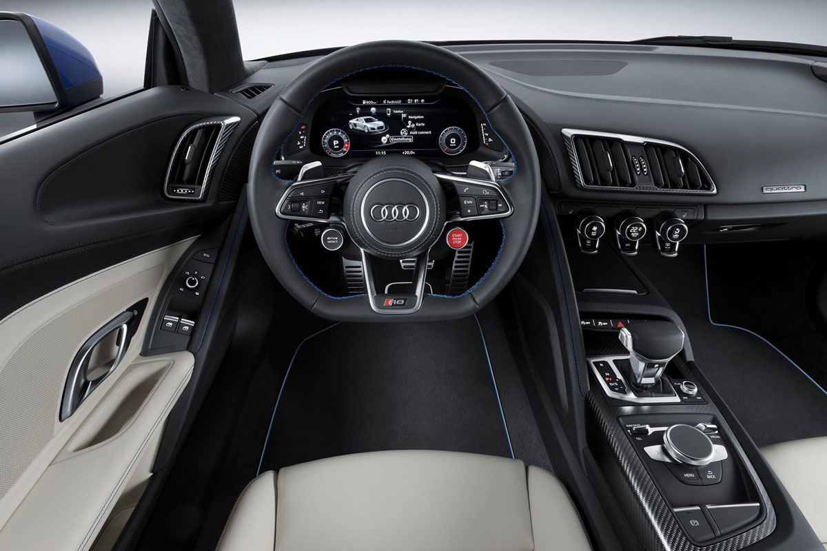 Dass er der schnellste ist, verdankt er nicht zuletzt der bereits im Vorgängermodell verbauten S-tronic mit wie gehabt sieben Vorwärtsgängen, die überdies bei Geschwindigkeiten über 55 Km/h eine Segelfunktion bietet und damit den Kraftstoffverbrauch reduzieren soll. Für letztere Aufgabe sind außerdem ein Start-Stopp-System sowie eine Zylinderabschaltung an Bord. Der Durchschnittsverbrauch soll 11,8 Litern (R8 V10) respektive 12,4 Litern auf 100 Kilometer liegen. Der Allradantrieb quattro ist obligatorisch, er wurde aber im Vergleich zur ersten Generation technisch abgewandelt: An der Vorderachse arbeitet nun anstelle der Viscokupplung eine elektrohydraulische Lamellenkupplung. Damit ist eine Umstellung von 100-prozentigem Hinterradantrieb (für alle normalen Fahrsituationen) bis zu 100-prozentigem Vorderradantrieb im Bedarfsfall möglich. Die stufenlose Variabilität soll für ein besonders agiles Fahrverhalten sorgen.