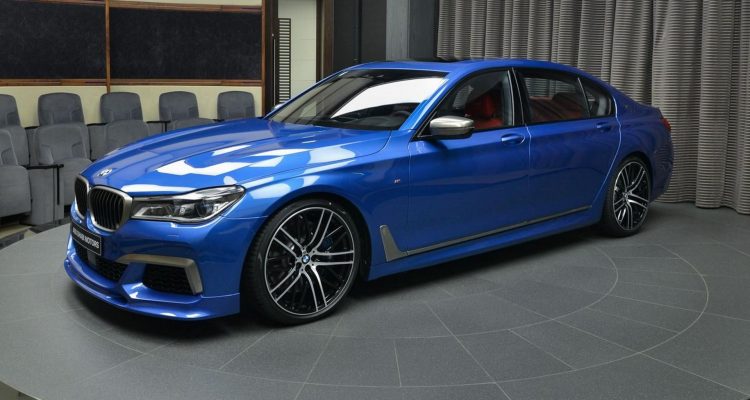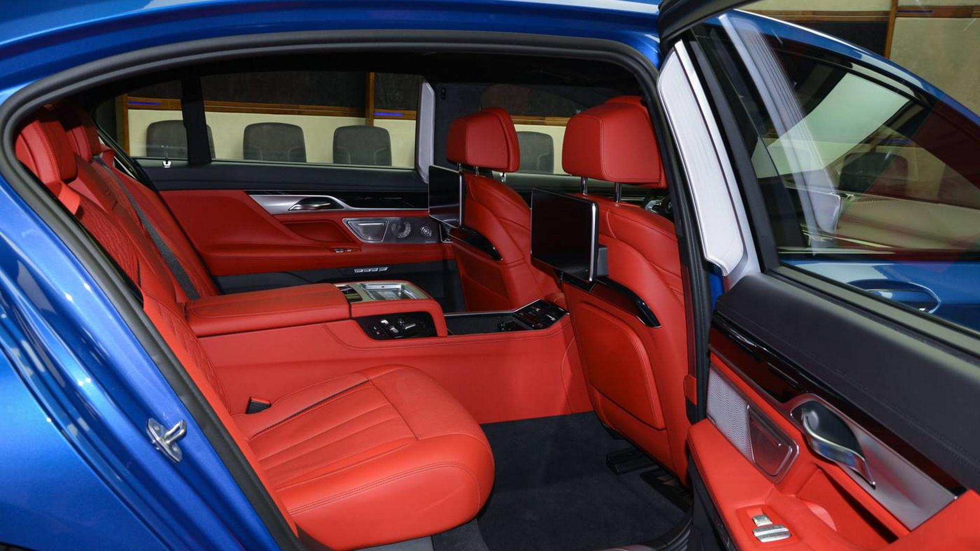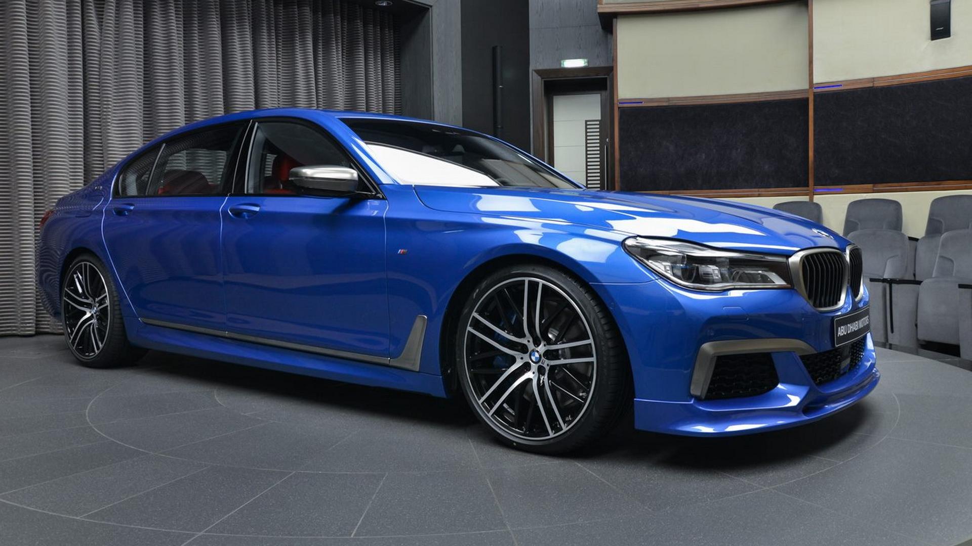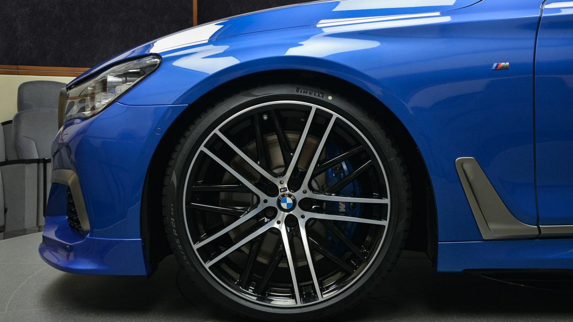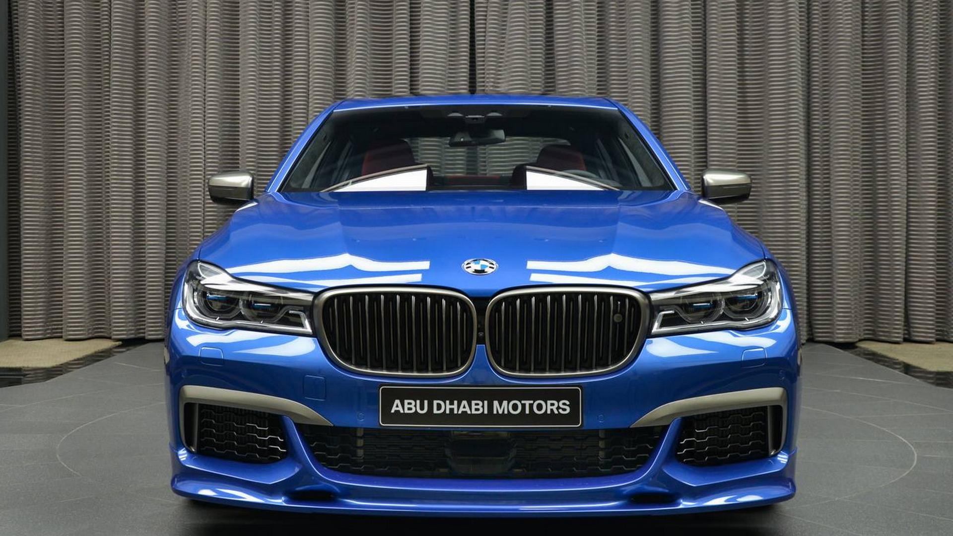 {1} Aber so richtig auffällig ist das Münchner Flaggschiff erst in einer sportlichen Krawallfarbe wie Estoril. An 1er und 3er mittlerweile eine oft gesehene Lackierung, würden hierzulande wohl nur die wenigsten Firmenbosse diesen Farbton wählen. In Abu Dhabi freilich gelten diese Maßgaben nicht. Hier wird gezeigt was gut und teuer ist. Weiterhin wurde ein 3D-Frontspoiler montiert und am Kofferraum des 7ers eine Abrisskante von Alpina montiert. Der Wagen steht auf exklusiven 21 Zoll M Performance Rädern.
