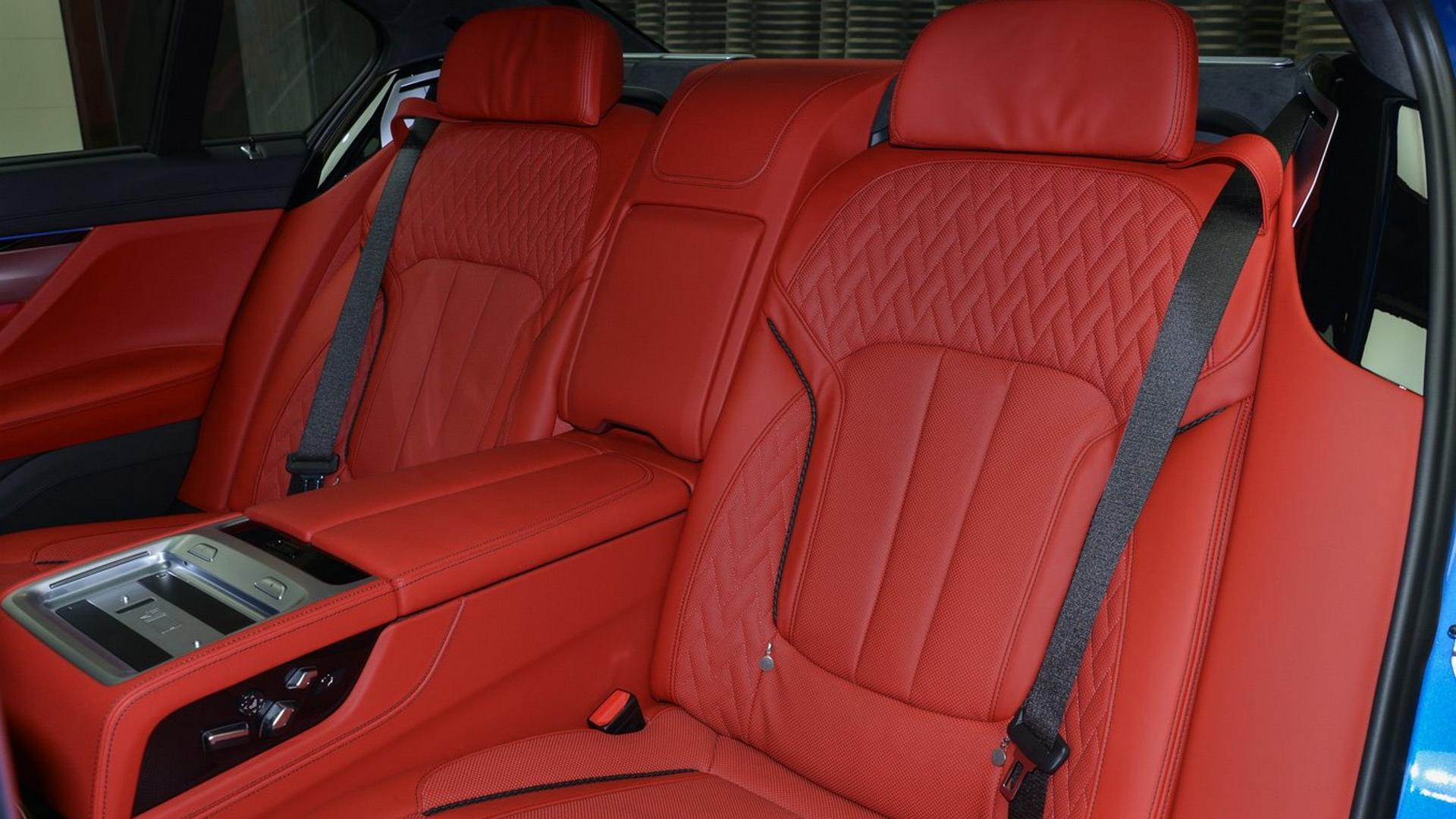 Heftig ist auch der Blick in den Innenraum der 610 PS Luxuslimousine. Hier machten die Herrschaften von BMW Abu Dhabi ein Kreuz bei der individuellen Lederausstattung Merino Feinnarbe Fionarot. Zugegeben: der Kontrast tut im ersten Moment weh, wird auch im zweiten nicht besser aber nach einigen Minuten hat man sich daran gewöhnt. Eines ist auf jeden Fall sicher: auffallen wird dieser BMW 760Li xDrive in jedem Fall!