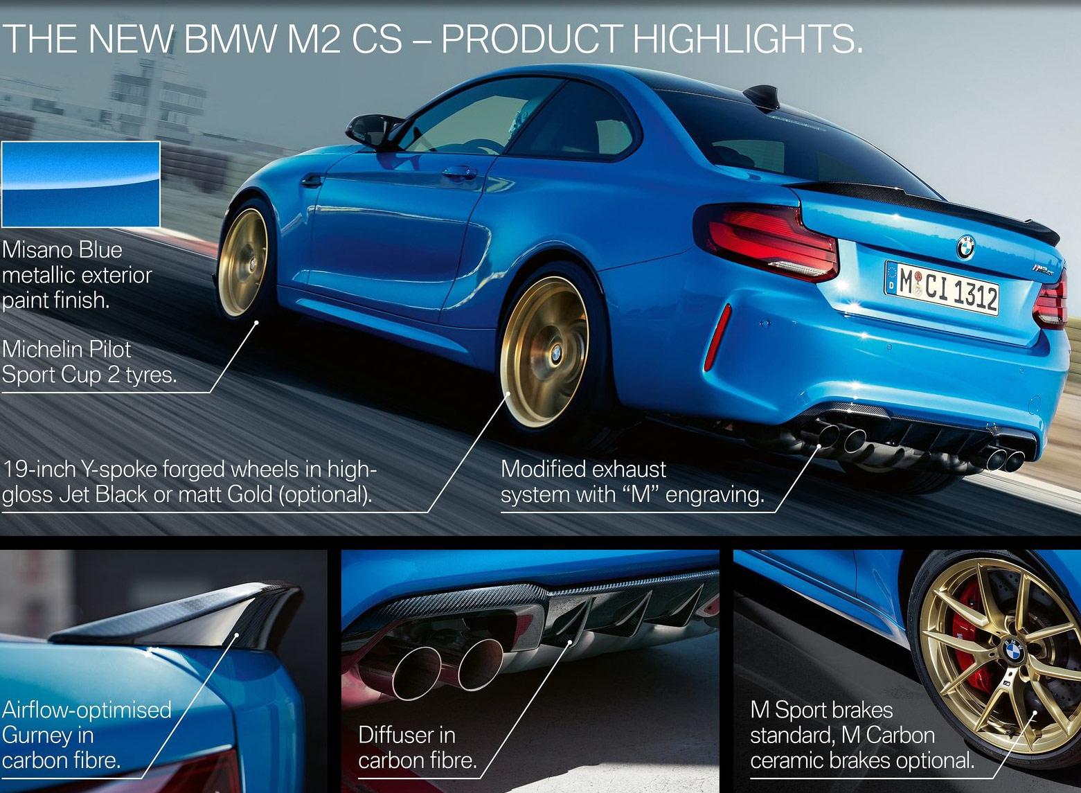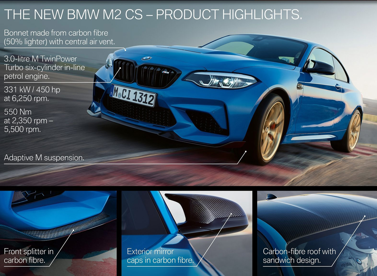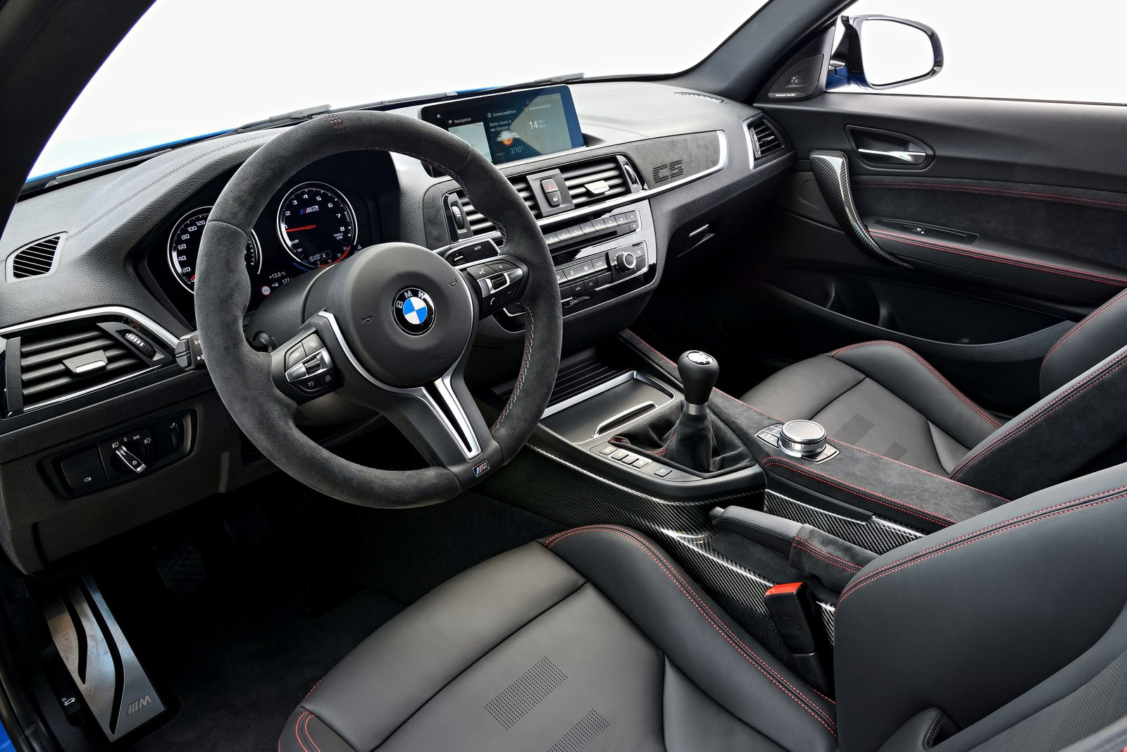{1}Die Zahl ist ein Schlag in die Magengrube! Zum Vergleich: Ein aktueller M2 Competition startet bei 61.900 Euro und ein M4 bei 87.000 Euro. BMW argumentiert den saftigen Preisaufschlag für den M2 CS locker weg: Carbon-Motorhaube, Carbon Heckspoiler, Dach aus kohlenstofffaserverstärktem Kunststoff und ein Heckdiffusor aus Sicht-Carbon. Der S55B30-Motor wird um 40 PS auf 450 PS aufgeblasen (wobei das maximale Drehmoment von 550 Nm unverändert bleibt) und die M Sportbremse ist Serie sowie rot lackiert. Klebrige Michelin Sport Cup 2 Semislicks gehören genauso zum CS, wie auch ganz viel Alcantara und feine Schalensitze. Als Bonus oben drauf gibt es sogar das M-Driver’s Package für 280 km/h Topspeed und ein Fahrertraining.
