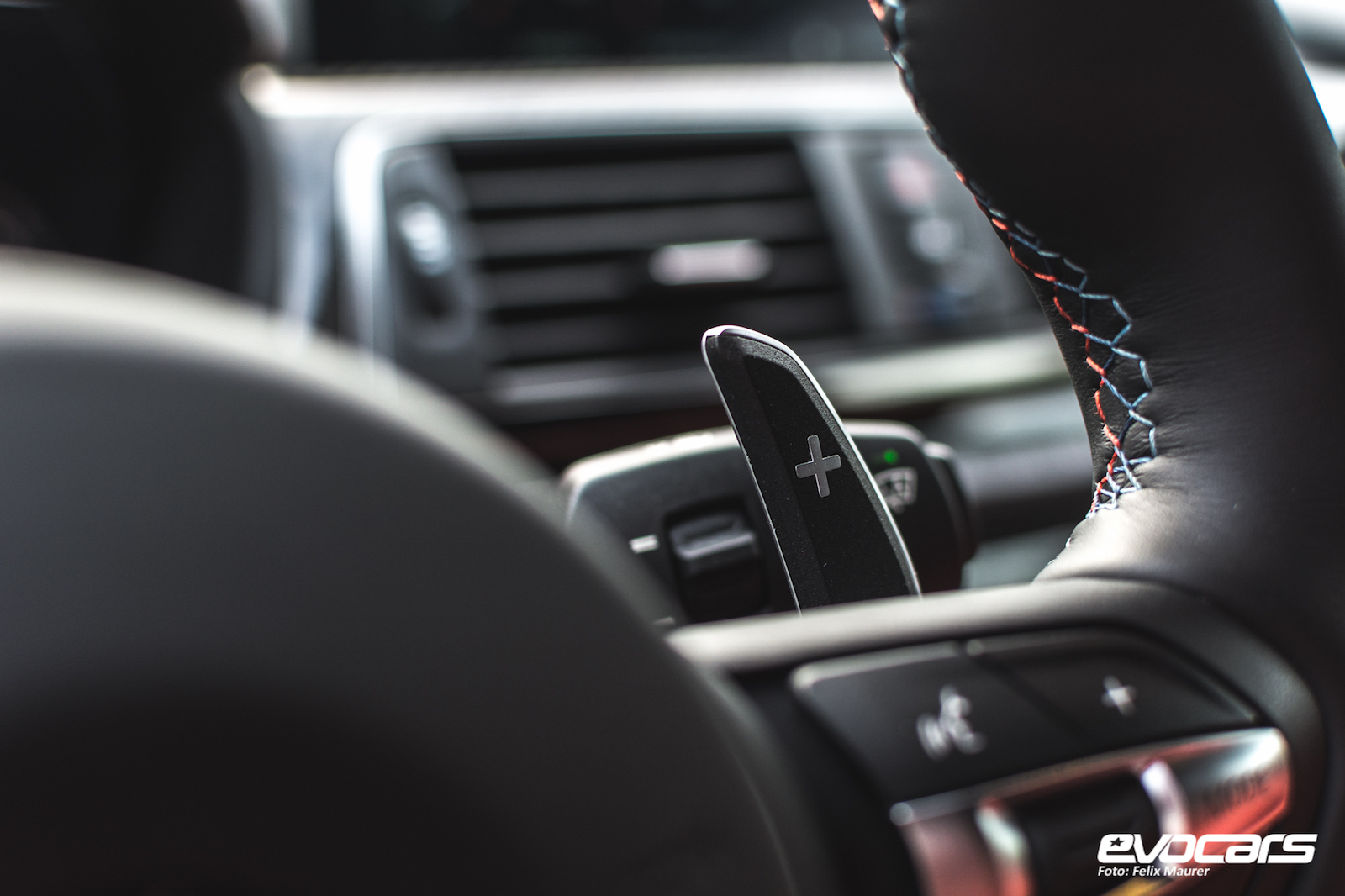 Und wir wären im Antriebs-Kapitel schon beinahe auf die 100-Prozent-Wertung gekommen, wenn uns die Presseabteilung nicht mit einem Doppelkuppler (3.900 Euro Aufpreis) versorgt hätte. Denn das, liebe Leute, können andere besser. Im Unterschied zu Konkurrenzprodukten von Audi, Porsche oder Mercedes verfügt das M-DKG nicht über einen Kriechmodus, was Einparken in engen Parklücken zur mittleren Tortour werden lässt. Das hat nichts mit Sportlichkeit zu tun, sondern ist einfach Mist. Dass man bei laufendem Motor im Leerlauf und (!) angezogener Handbremse keine Tür aufmachen kann, ohne ständig von Gongs und Warnhinweisen darauf aufmerksam gemacht zu werden, das Auto gegen Wegrollen zu sichern, kann man ebenfalls nur als Bug, aber nicht als Feature deklarieren. Zumal sich die Parkbremse mangels Knopf (das wäre ja zu einfach gewesen) nur bei ausgeschaltetem Motor aktiviert.