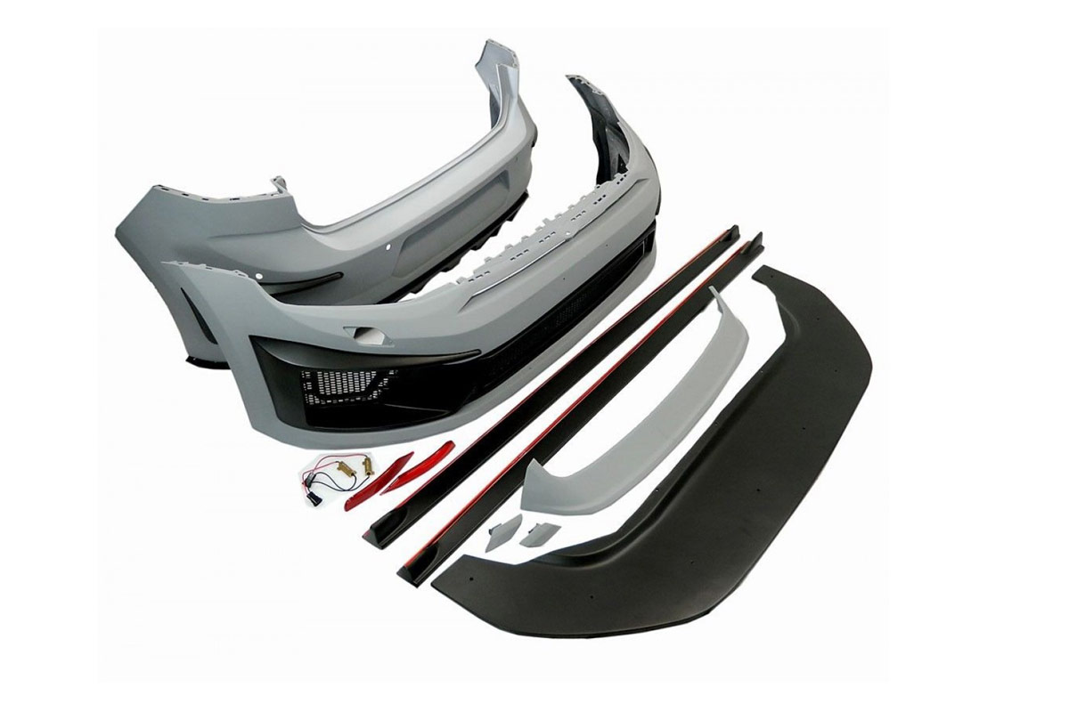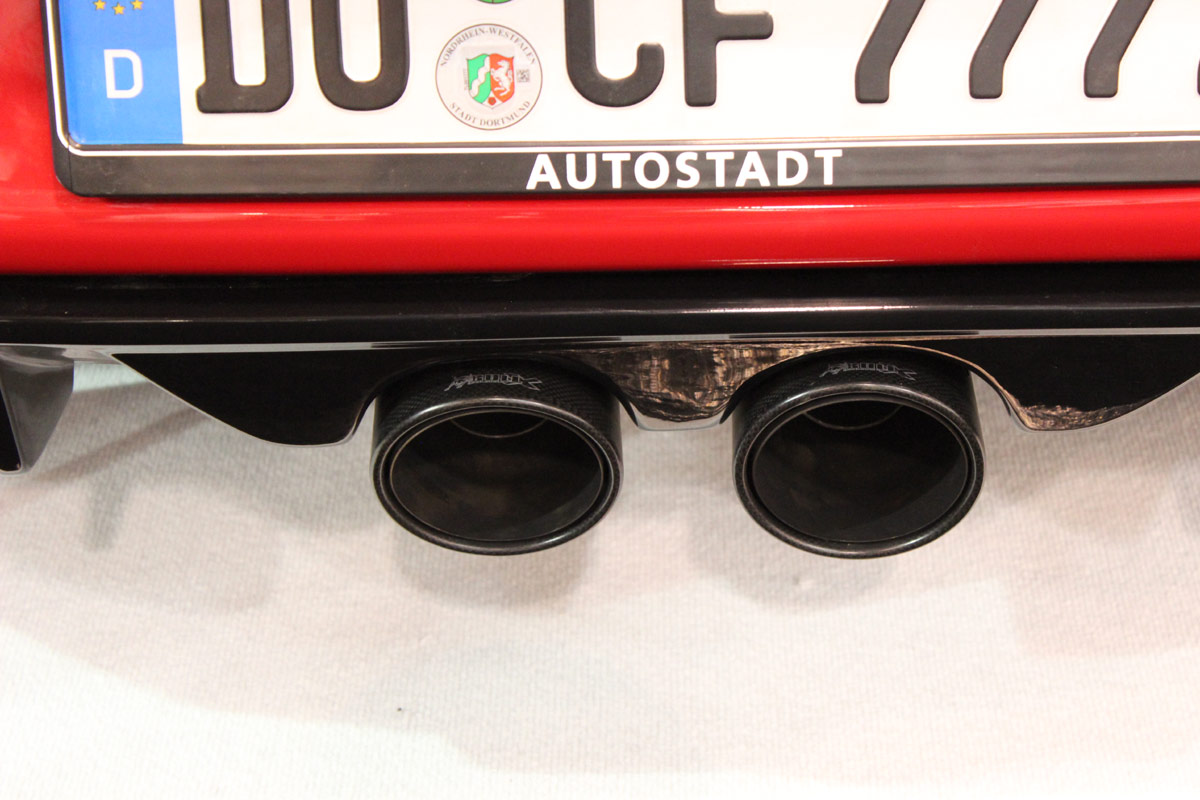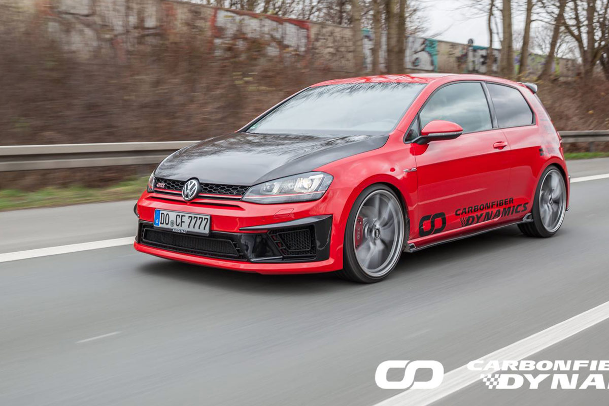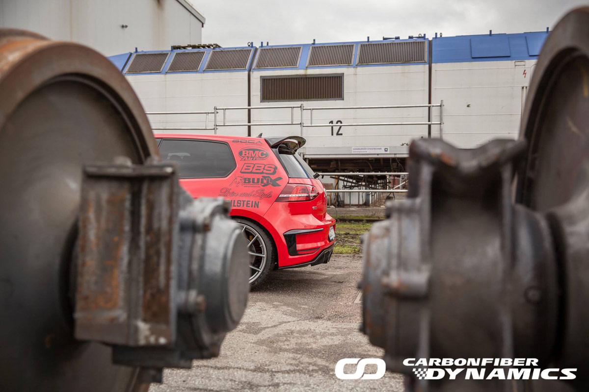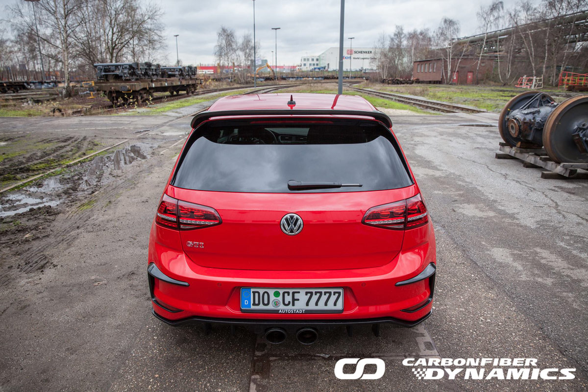 {1}Gefertigt wird das aus ABS-Kunststoff bestehende Bodykit von der Firma Scope Carbon, vertrieben wird es in Deutschland von Carbonfiber Dynamics aus Dortmund. Geizeigt haben die Jungs das Bodykit unter anderem auf der Essen Motor Show 2015, wo man sich einen guten Eindruck von Frontschürze, Seitenschwellern du Heckschürze machen konnte. Das R400 Style genannte Bodykit kommt mit einem TÜV-Gutachten und setzt eine bei den Endrohren mittig zusammengeführte Abgasanlage voraus. Passen soll das Kit ansonsten aber für den normalen Golf VII ebenso wie für GTI und R.