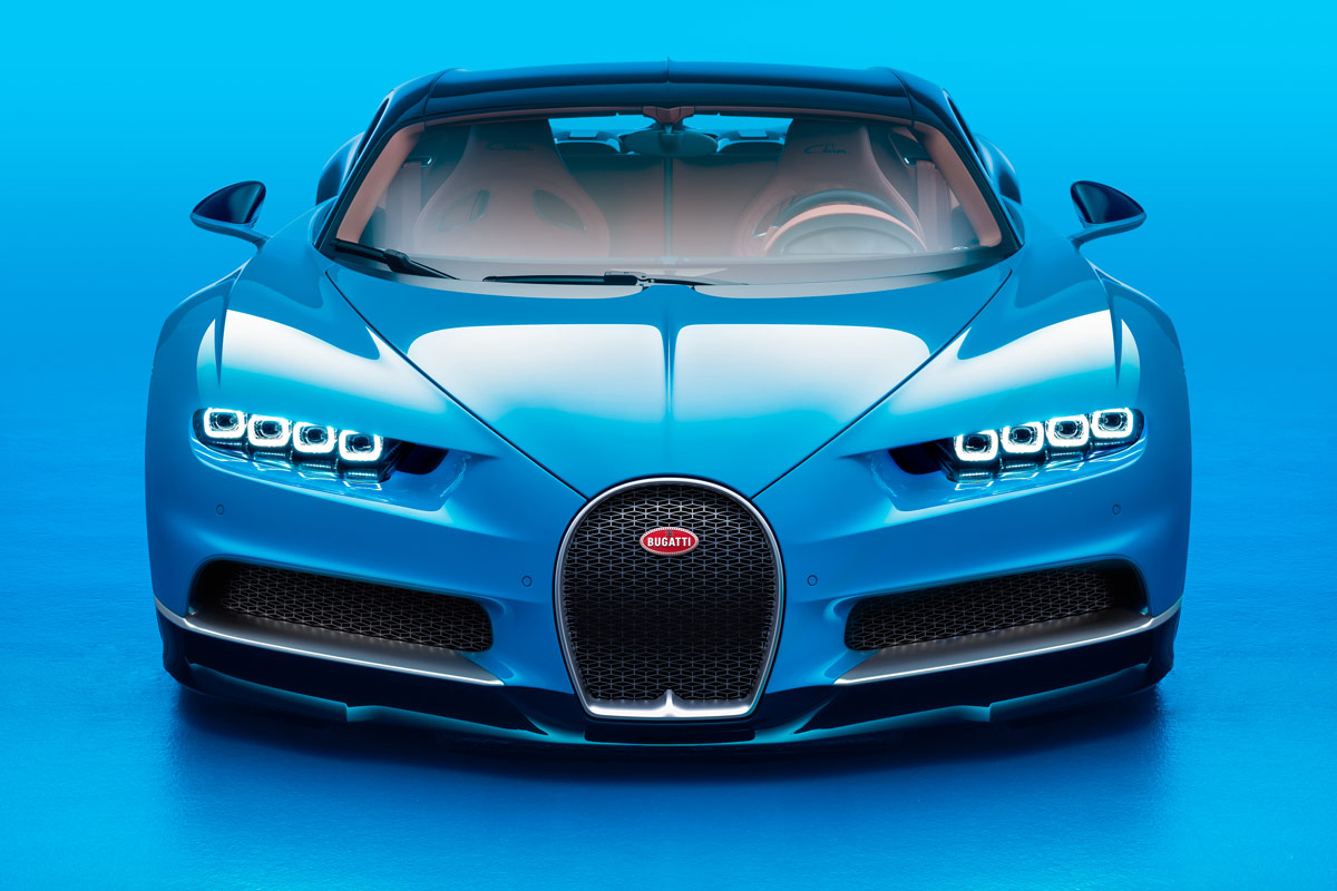 Um das einzigartige Acht -Augen-Design an der Front des Chiron zu unterstützen, verbaut Bugatti die mit einer Höhe von gerade einmal 90 mm flachsten Voll-LED-Projektionsscheinwerfer, die es bislang für ein Automobil auf der Welt gibt. Jeder Scheinwerfer verfügt über ein eigenes Steuergerät, das die LEDs hinter den von filigranen Aluminium-Armen fixierten Hauptlinsen ansteuert. Die acht äußeren Leuchtquadrate bestehen aus Lichtleitern und sorgen für Stand- beziehungsweise Tagfahrlicht. Ein Chiron ist von vorn immer an diesen acht Leuchtquadraten erkennbar. Dass auch bei den Scheinwerfern nicht an hochwertigen Materialien gespart wird, beweisen die aus Sicht-Carbon gefertigten Blenden.