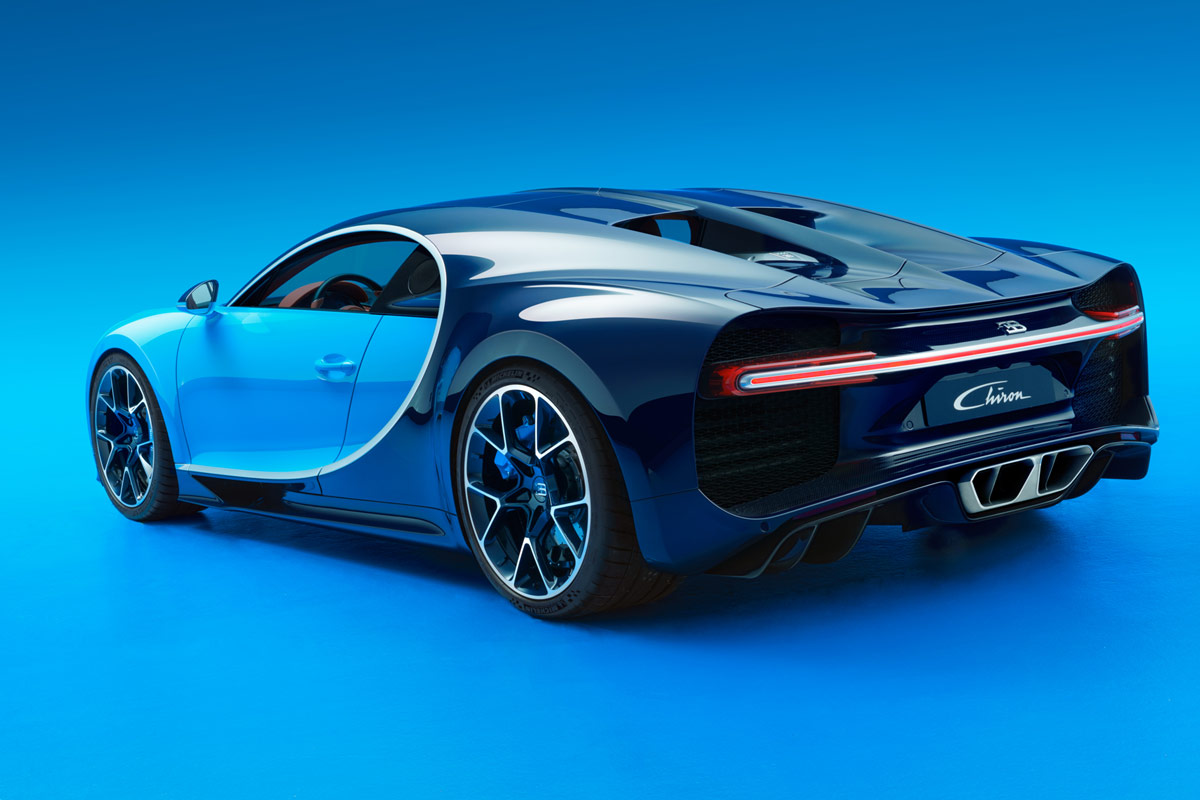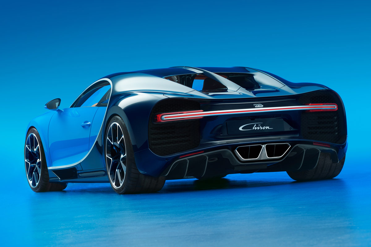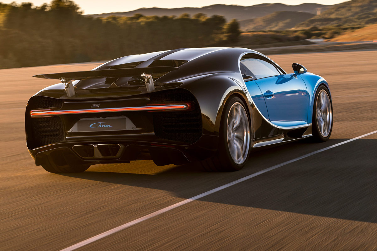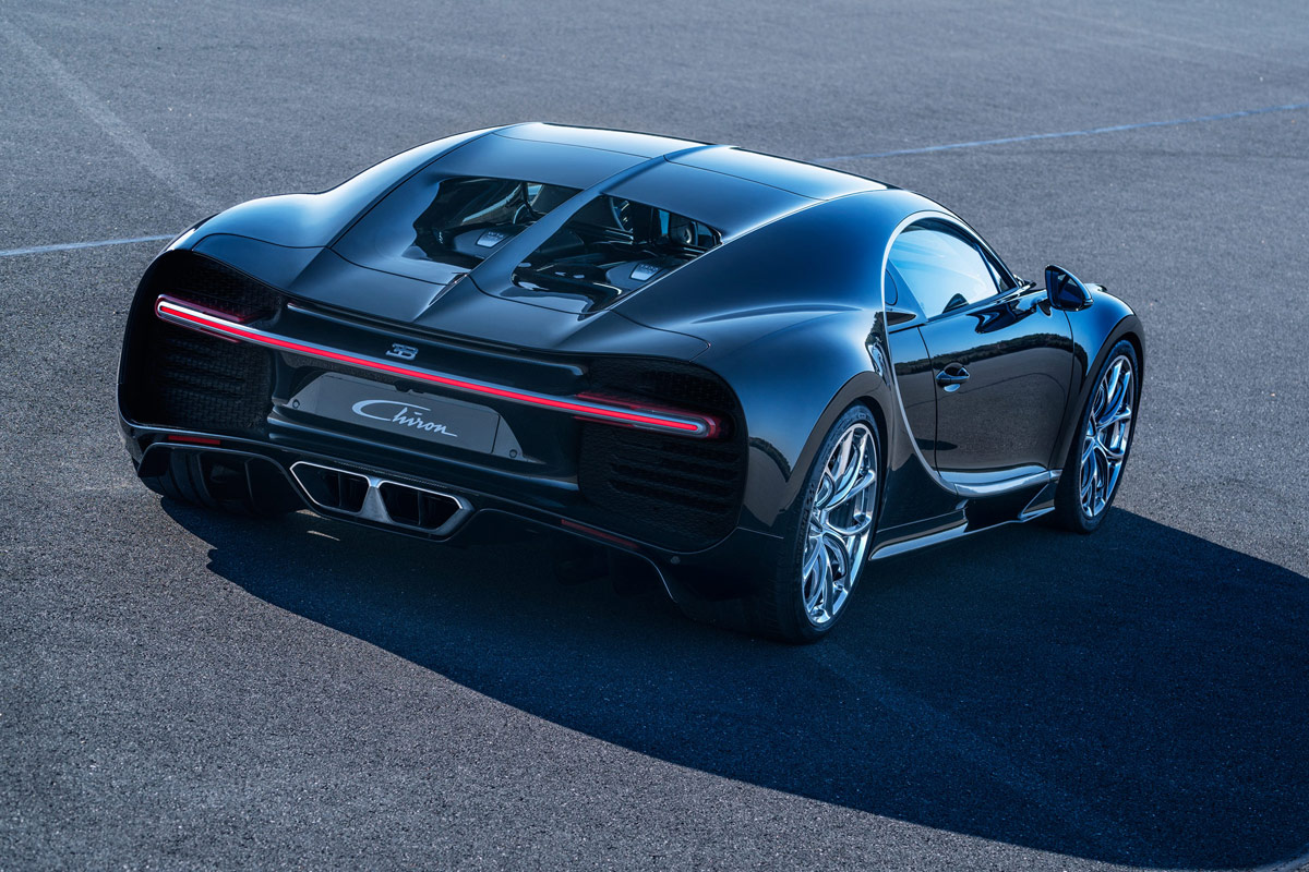 Der adaptive Heckflügel des Bugatti ist einzigartig. Er arbeitet beim Chiron in vier Positionen: komplett eingefahren, leicht ausgefahren in der Top Speed-Position, komplett ausgefahren in der Handling- und Autobahn-Position mit jeweils angepasster Flügelneigung und in der Air Brake-Position zusätzlich nach vorne aufgestellt. Die Anpassung von Flügelhöhe und -winkel erfolgt fahrsituationsabhängig und vollautomatisch. Seine hocheffiziente Konstruktion ermöglichte den Verzicht auf einen zusätzlichen Spoiler, was im Ergebnis zu einem geringeren Widerstand und einer Gewichtseinsparung führt.