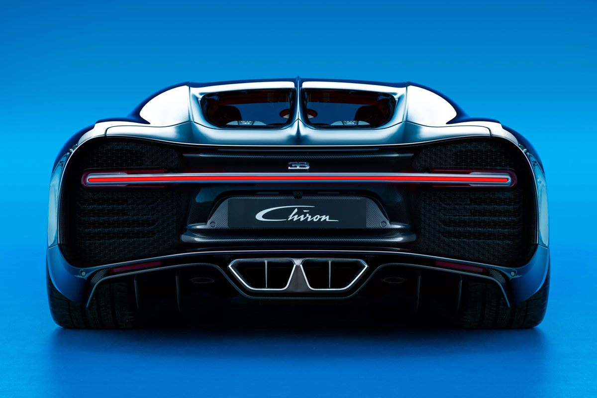 Das Fahrzeugheck mit seiner umlaufenden Abrisskante ist das deutlichste Beispiel dafür, dass beim Chiron die Form den Regeln der Performance folgt. Die Gestaltung ist maßgeblich dem geringeren Luftwiderstand, der höheren Motorleistung, der neuen Höchstgeschwindigkeit und den Anforderungen der Wärmeableitung aus dem hinteren Fahrzeugbereich geschuldet: Der Sogeffekt hinter dem Heckbereich ermöglicht ein Abziehen der im Motorraum angestauten heißen Luft.