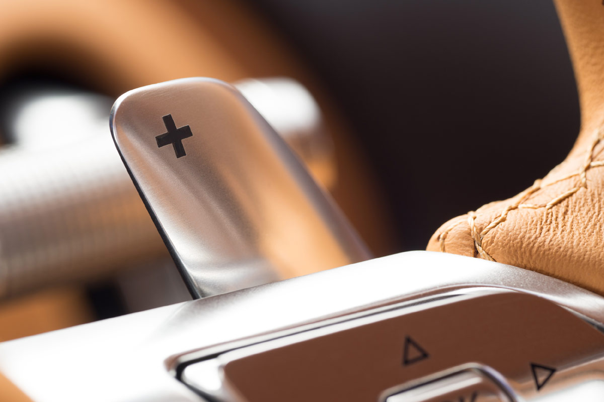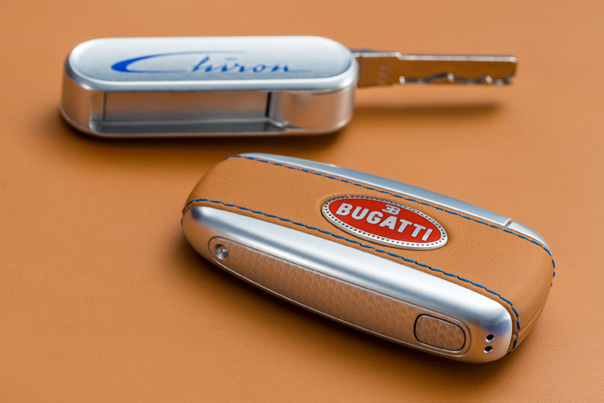 Auch für die beiden Zündschlüssel des Chiron haben die Entwickler jeweils eigene Ablageorte kreiert. Der Hauptschlüssel für den Betrieb des Supersportwagens in allen Fahrmodi bis zu einer Geschwindigkeit von 380 km/h arbeitet mit Keyless Go-Funktion und rastet in der Instrumententafel rechts neben dem Lenkrad ein, um auch bei besonders sportlicher Fahrweise sicher verstaut zu sein. Der Chiron-Schlüssel ist ein eleganter und wertvoller Handschmeichler geworden. Er wird aus Aluminium gefertigt und ist mit dem Leder und natürlich passenden Ziernähten der Innenausstattung des entsprechenden Fahrzeugs bezogen. In die Oberfläche der Vorderseite des Schlüssels ist das Bugatti-Logo eingelassen, das wie das Front-Emblem am Kühlergrill in derselben Manufaktur aus massivem Silber und Emaille von Hand gefertigt wurde.