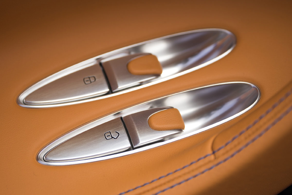 Gleichzeitig findet im Interieur das Designthema der Bugatti Linie ihren stärksten Ausdruck. Das als schwungvoll stilisierter Anfangsbuchstabe aus Louis Chirons Unterschrift entlehnte offene Oval, das die Seitenansicht des Boliden prägt, wird im Fahrgastraum als Trennlinie zwischen den symmetrischen Einheiten für Fahrer und Passagier thematisiert. Das Lichtband in C-Form wächst als erhabenes Grafikelement über die Fronthaube in den Fahrgastraum hinein und geht nahtlos in die Armaturentafel über. Von hier fließt es weiter über die Armauflage zwischen den Sitzen bis zur Rückwand. Dort steigt es zum Dachhimmel auf und läuft vorn am Rückspiegel aus. Die homogen ausgeleuchtete und dimmbare Lichtspange ist der längste Lichtleiter im Automobilbau. Doch damit nicht genug. Sie wird zudem von einem Rahmen eingefasst, der in einem aufwändigen Prozess aus einem Block Aluminium herausgearbeitet wurde, und ist allein für sich selbst ein wunderbares Schmuckstück.