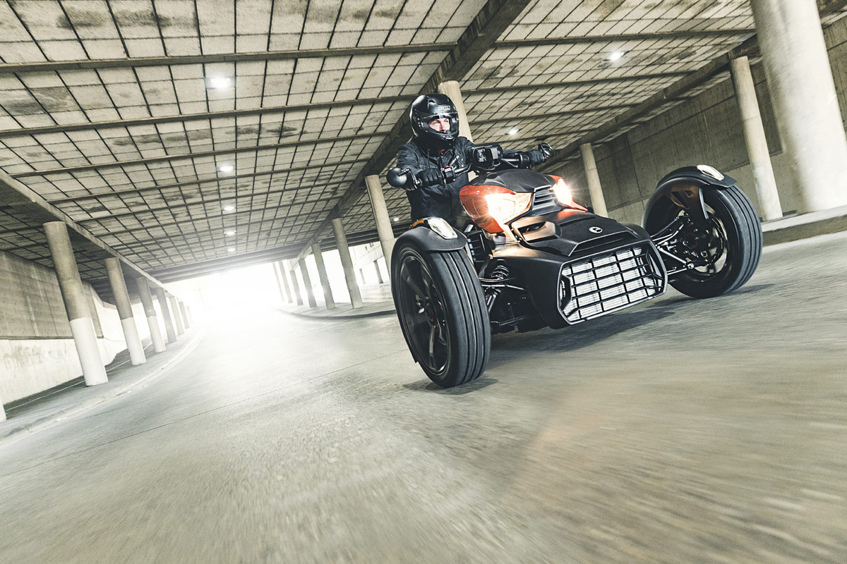 Angetrieben wird der Ryker wahlweise von einem 600 ccm und 50 PS oder 900 ccm und 82 PS starken Zwei- bzw.- Dreizylinder. Letztgenanntes Aggregat schiebt den nur 285 Kilogramm leichten Can-Am Ryker in 8,5 Sekunden bis Tempo 100. Beim Sprint auf Tempo 50 indes dürfte das Spaßgerät die Stärken des Automatik-Getriebes (CVT) optimal ausspielen können und somit dürfte sogar der eine oder andere Sportwagen an der Ampel das Nachsehen haben. Also: Am Gasgriff drehen und ab geht die wilde Hatz. Kuppeln und Schalten entfallen. Mit an Bord sind dafür ABS und eine Stabilitätskontrolle. In Kombination mit dem für einen versehentlichen Wheelie zu schweren Vorderbau heißt das natürlich: Hier gibt’s Spaß mit Netz und doppeltem Boden.