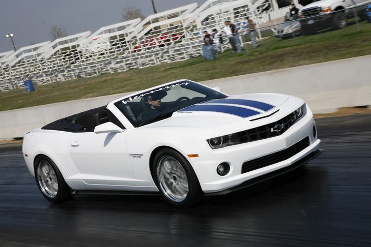 Auf dem deutschen Markt noch gar nicht zu haben, fahren in den USA bereits die ersten Tuning-Varianten des neuen Chevrolet Camaro herum. Allen voran der von US-Tuner Hennessey aufgemöbelte Frischluft-Ballermann mit knapp 600 PS. Ein Kompressor hilft dem verbauten 6,2-Liter-V8 mächtig auf die Sprünge und verhilft dem Aggregat zu rund 170-Zusatz-PS. Außerdem wurde der Ansaugtrakt optimiert, damit der die Brennräume noch besser mit Frischluft versorgt werden können. Nach der Kraftkur soll das HPE600 genannte Camaro Cabrio in etwas mehr als vier Sekunden auf 100 km/h beschleunigen und die Viertelmeilen-Distanz in zwölf Sekunden abhaken können. Um nicht nur geradeaus sicher unterwegs zu sein, verbaute Hennessey außerdem ein KW-Gewindefahrwerk 20 Zoll große Michelin Pilot Super Sport-Gummies.