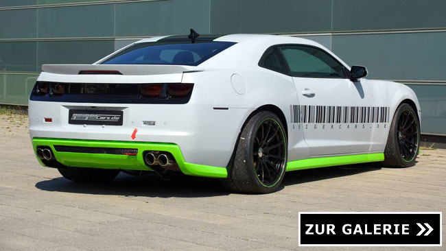 Der mit einem LS9-Kompressor, einem großen Ladeluftkühler, geschmiedeten Kolben, bearbeiteten Zylinderköpfen und einer neuen Kurbel- und Nockenwelle bestückte Camaro soll den Sprint auf Tempo 100 in 3,7 Sekunden erledigen und stramme 338 km/h Topspeed schaffen. Um diesen Fahrleistungen gerecht zu werden verbaut GeigerCars zudem ein KW-Fahrwerk mit verstellbaren Stützlagern, Stabis aus dem Motorsport, sein Team versteift die Hinterachse und verbaut standfestere Bremsen. Außerdem werden noch 285 Millimeter messende Gummis vorn und 335er hinten auf 19 bzw. 20 Zoll große Alus montiert. Für adäquaten Sound soll der Sportauspuff sorgen, Kotflügelverbreiterungen unterstreichen die sportliche Optik.