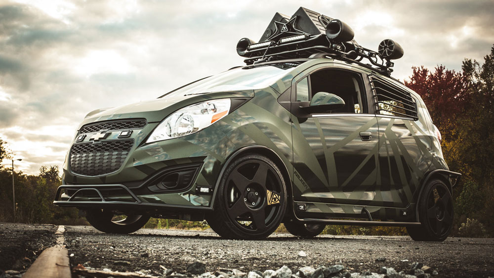 Der Chevrolet Spark gehört nicht eben zu den Autos, an die man denkt, wenn man nach einem passenden Fahrzeug für Krisengebiete gefragt wird. Die Designabteilung von „Enemy to Fashion“ möchte das ändern (wenn auch nur im Spaß) und hat anlässlich der weltgrößten Tuningmesse SEMA einen Spark für Militäreinsätze „präpariert“.