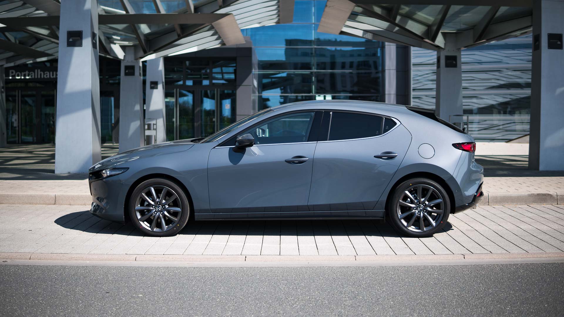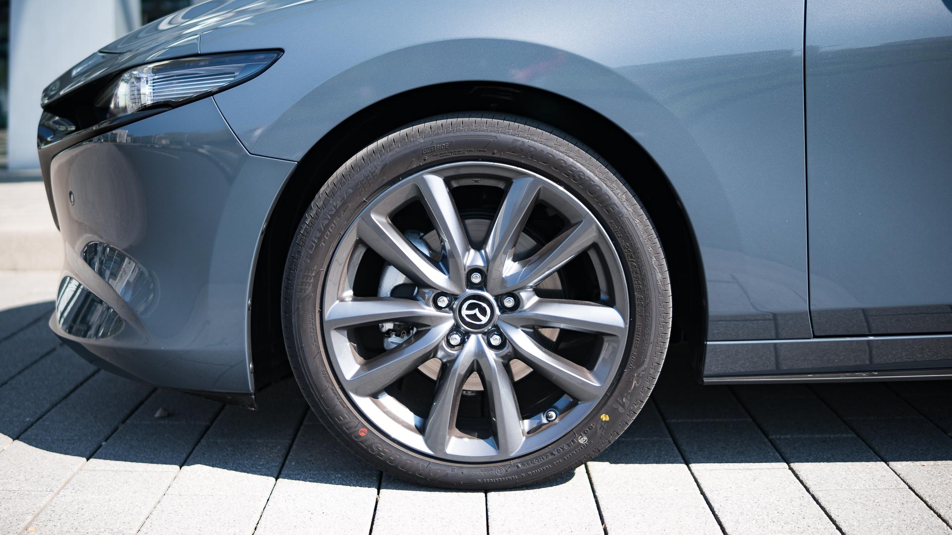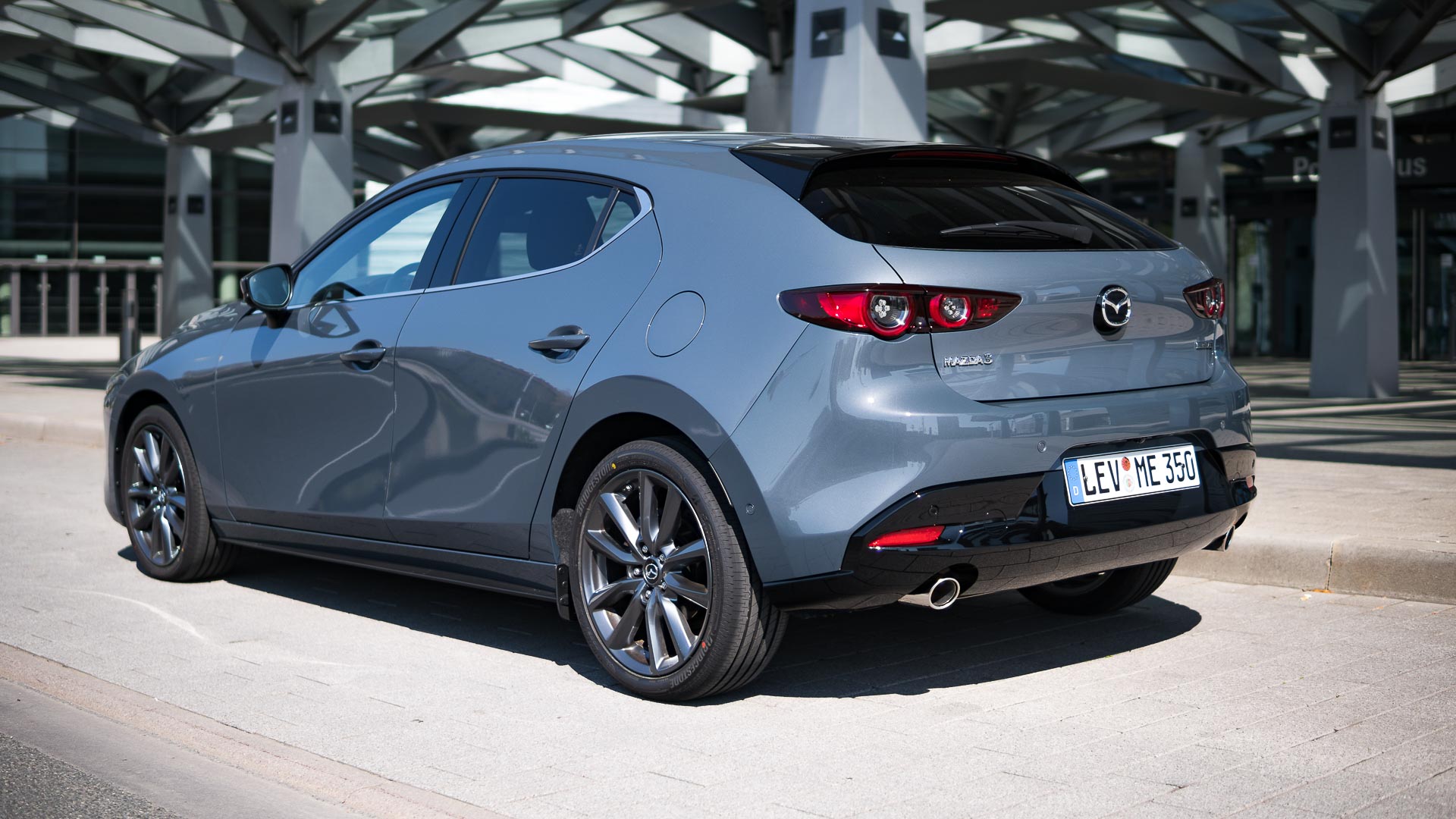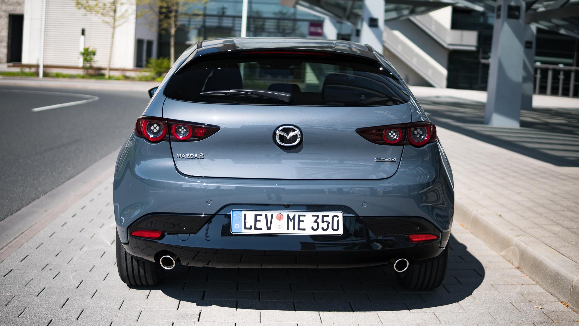 Optisch ist der Japaner schon einmal ein wirklich guter Wurf. Manch einem mag die lange Front nicht gefallen und auch das feiste Heck trifft nicht jeden Geschmack sofort – doch gerade in der von uns gefahrenen Kombination in der Sonderfarbe Polymetal Grau Metallic in Kombination mit den schwarzen Chromelementen des Design-Pakets und den dunklen 18“-Felgen ist der Mazda 3 ein echter Hingucker: Grimmig, sportlich an der Front und doch schnörkellos und klar. Die Schokoladenseite ist aber eindeutig das Heck. Kräftig ausmodelliert, mit wunderschön gezeichneten Heckleuchten und elegant kraftvollen Chrom-Doppelendrohren.