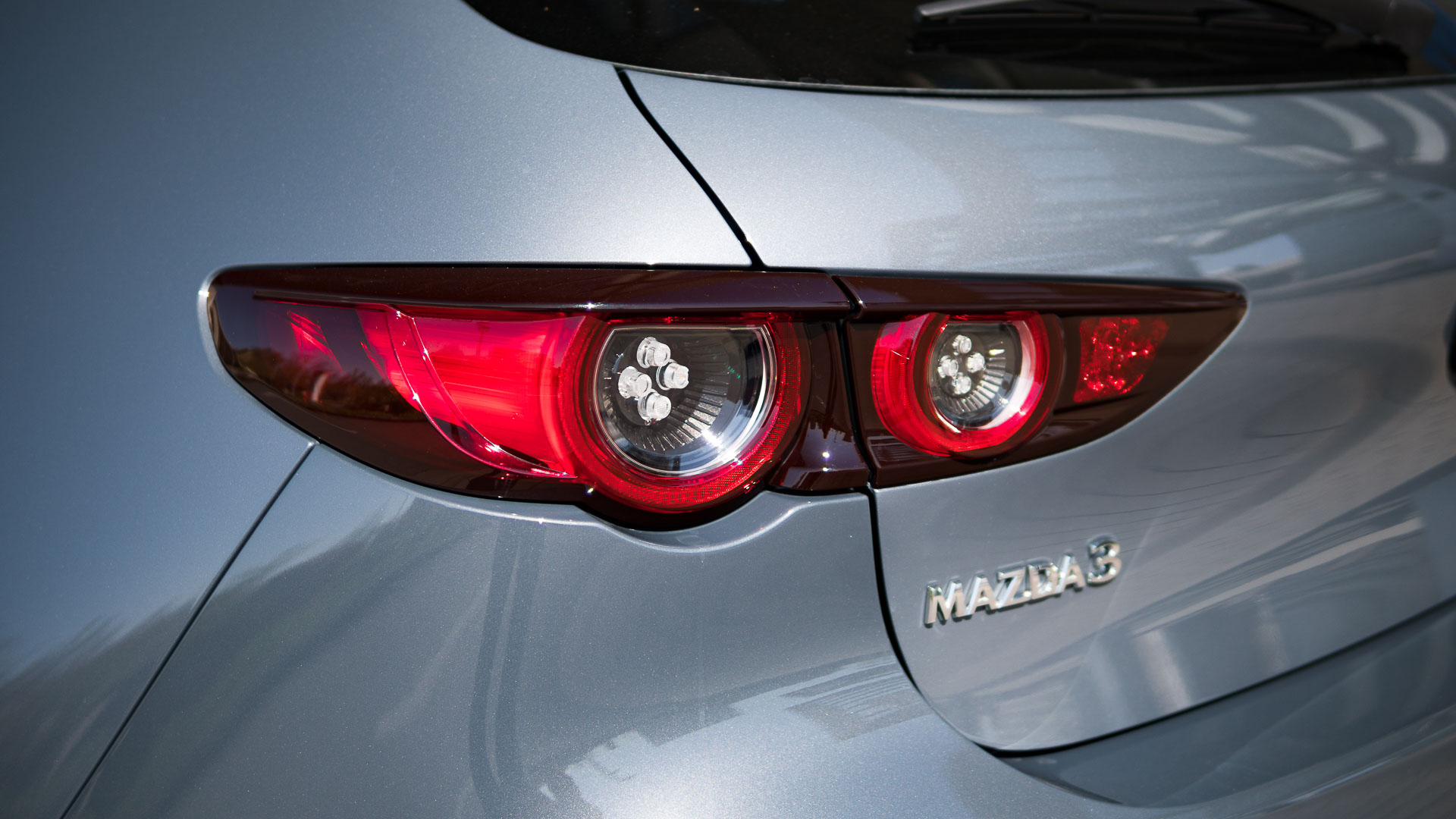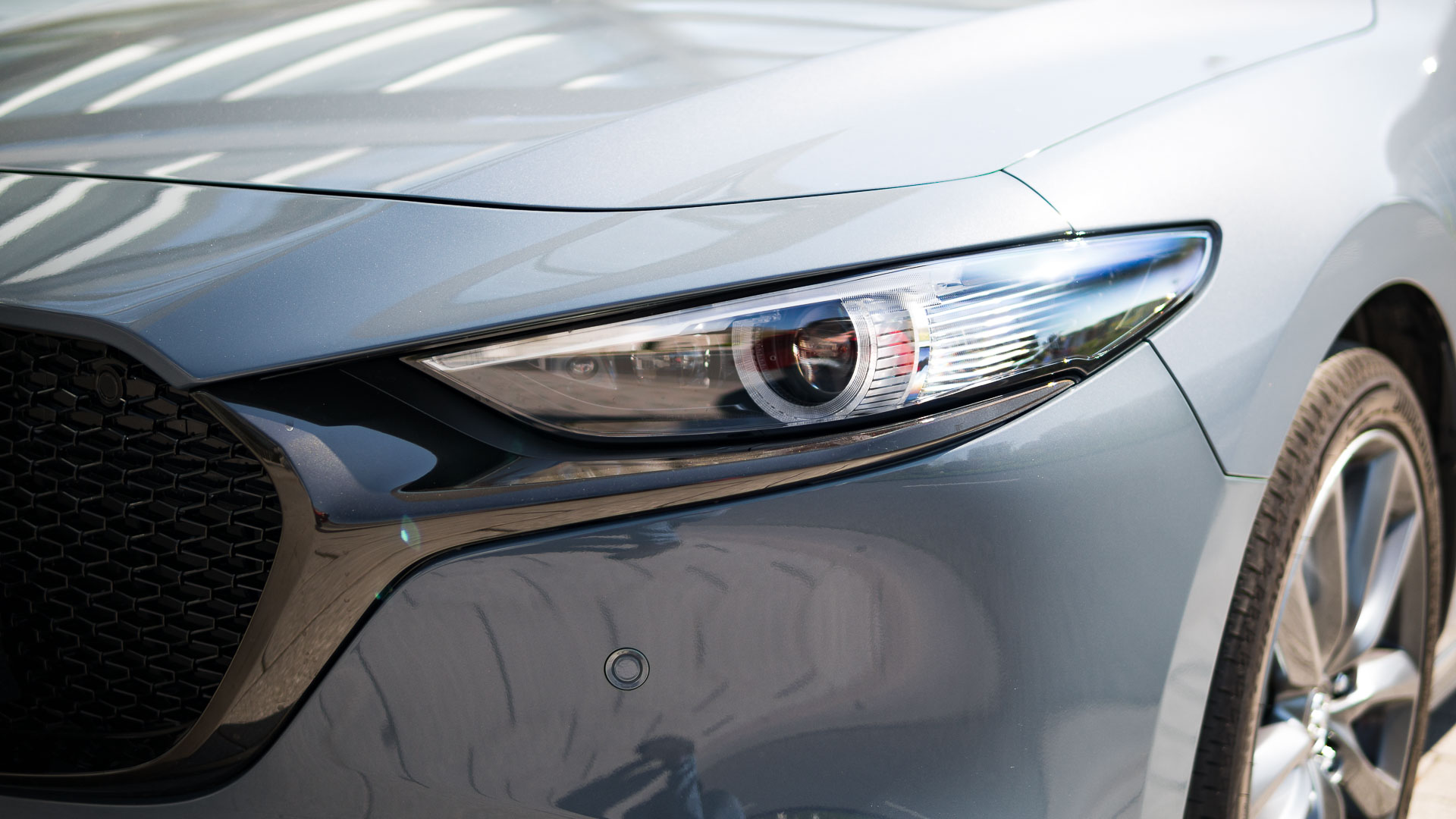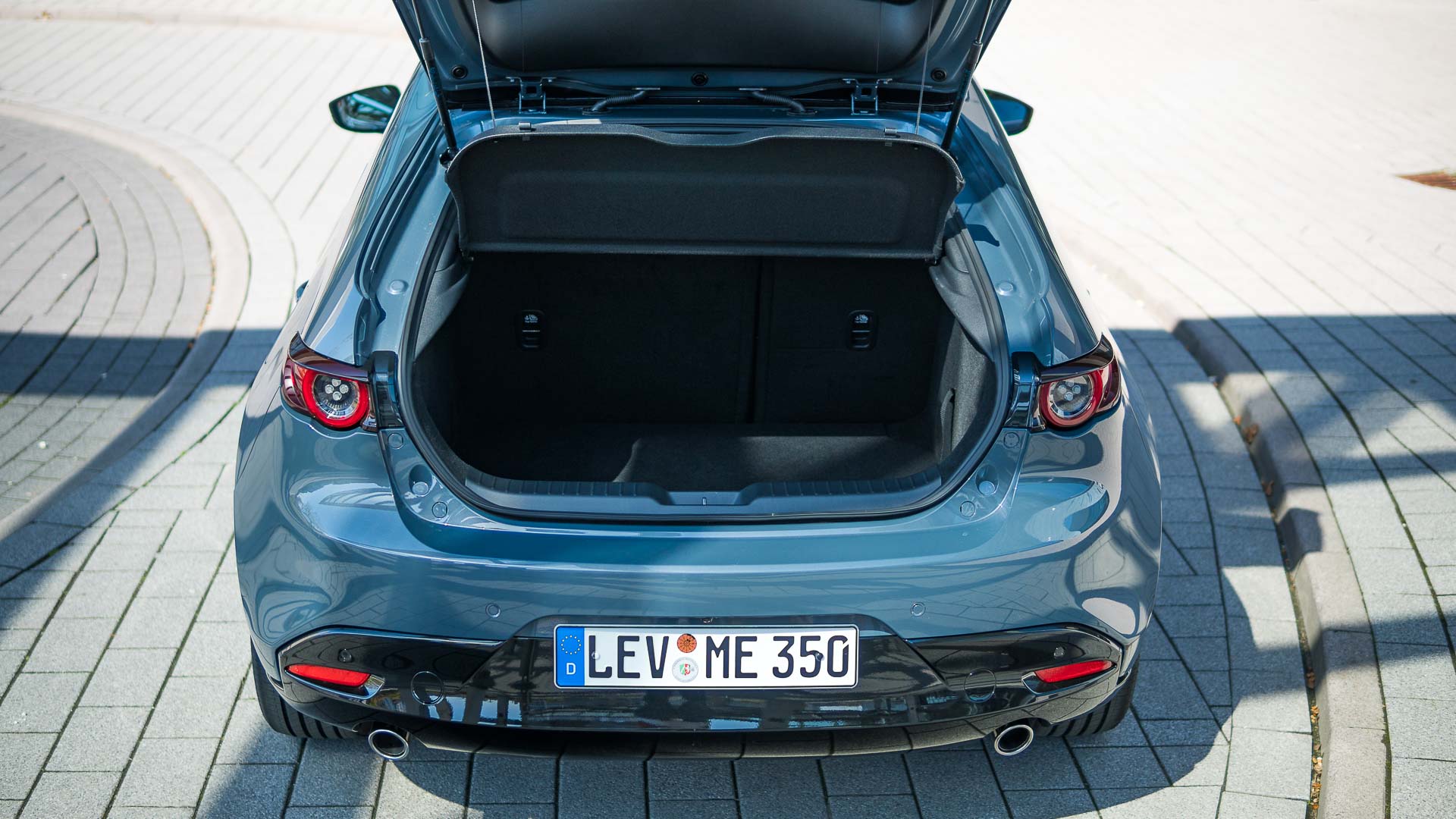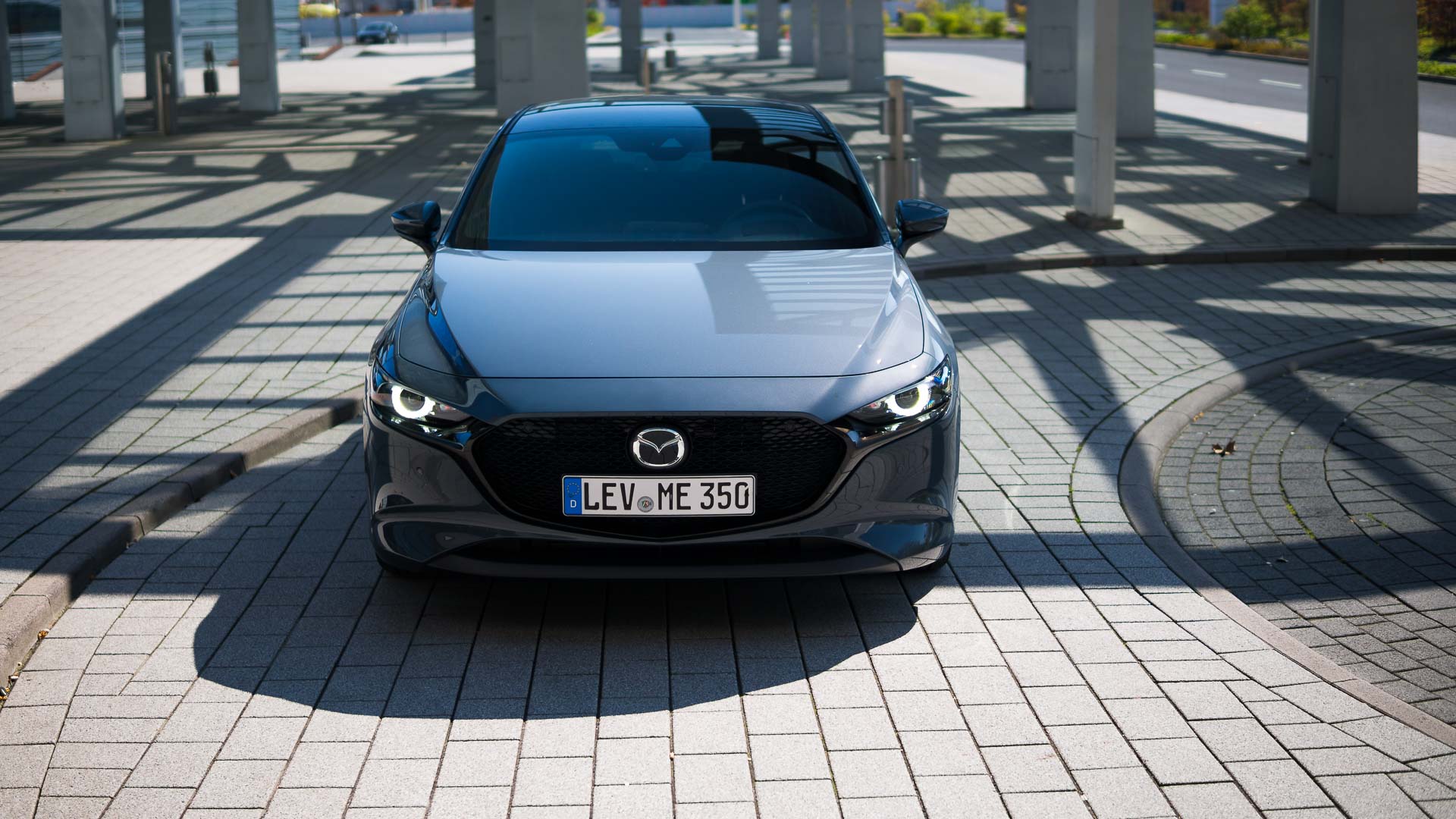 Optisch ist der Japaner schon einmal ein wirklich guter Wurf. Manch einem mag die lange Front nicht gefallen und auch das feiste Heck trifft nicht jeden Geschmack sofort – doch gerade in der von uns gefahrenen Kombination in der Sonderfarbe Polymetal Grau Metallic in Kombination mit den schwarzen Chromelementen des Design-Pakets und den dunklen 18“-Felgen ist der Mazda 3 ein echter Hingucker: Grimmig, sportlich an der Front und doch schnörkellos und klar. Die Schokoladenseite ist aber eindeutig das Heck. Kräftig ausmodelliert, mit wunderschön gezeichneten Heckleuchten und elegant kraftvollen Chrom-Doppelendrohren.