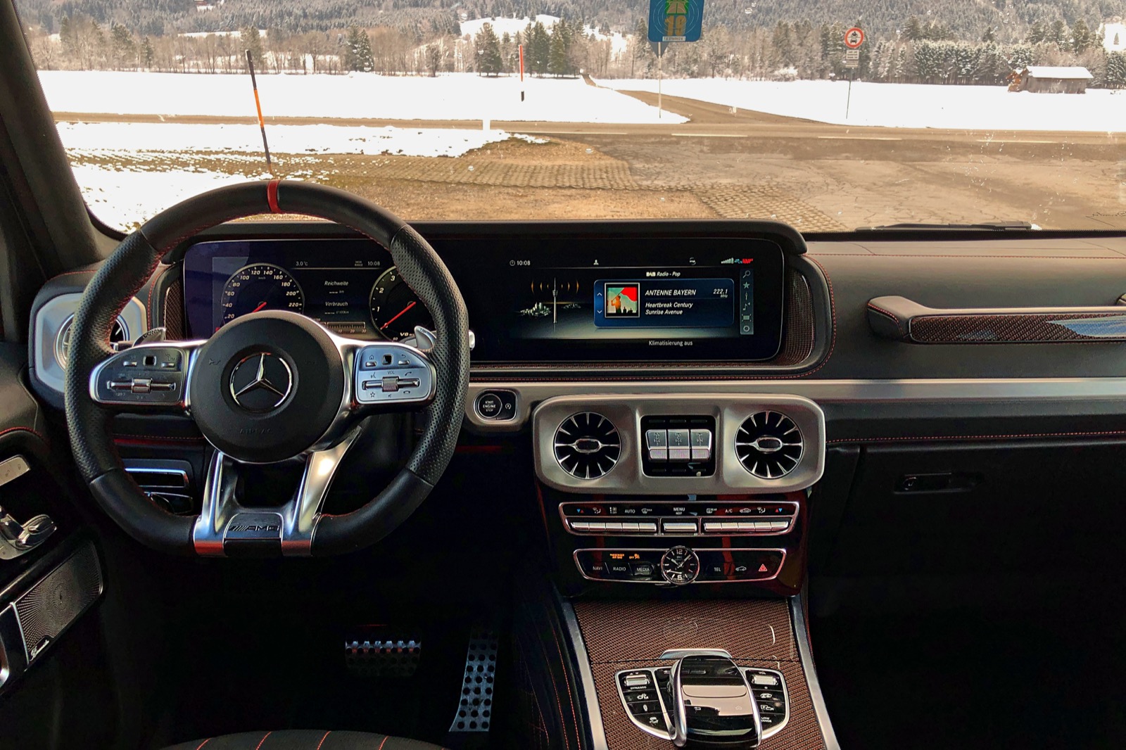 Auf den limitierten Autobahnen der Eidgenossen war also genügend Zeit, sich näher zu kommen. Und um den tiefsitzenden Fragen aller Leser zuvorzukommen: Ja, auch der neue G ist noch ein G. Mit wenigen Ausnahmen. Alle Türen fallen herrlich ins Schloss, auch wenn sie spürbar leichter geworden sind. Die Sitzposition ist immer noch so erhaben wie im Vorgänger. Das endlich schön gestaltete Armaturenbrett, das es glücklicherweise auch noch mit analogen Anzeigen zu bestellen gibt, ist nach wie vor so schmal gehalten. Die Frontscheibe steht herrlich steil, man schaut wie eh und je auf die beiden Blinker am Ende des Bugs.