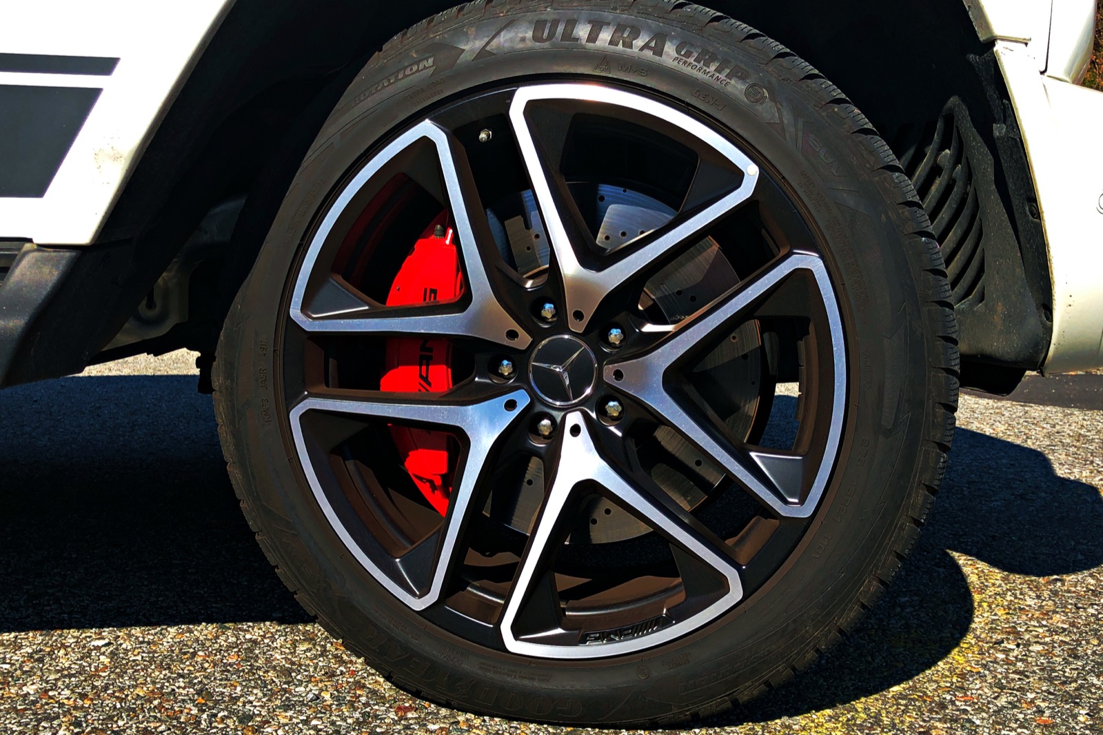 Vielmehr sorgte die Ausgangskonfiguration einer G-Klasse in vollem AMG-Ornat für gewisse Bedenken, aber: Wir wollten es ja nicht anders, siehe oben. Die 21-Zoll-Felgen samt entsprechender Bereifung im Niederquerschnitt sehen mehr nach Tuningbude denn ernstzunehmendem Geländewagen aus. Und so fühlen sie sich auch an. Nichts für ungut, doch mit einem W463 sollte man Bordsteine hoch und runter fahren können, wie es dem Fahrer beliebt. Weil sie zu dem, was dieses Auto abseits befestigter Straßen kann, einen städteplanerischen Furz darstellen. Doch stattdessen kapitulierten die dünnwandigen Goodyear bereits bei unserer stets beliebten REWE-Einfahrt, sodass wir beim nächsten Mal lieber mit Schritttempo auf die Parkfläche fuhren. Die Bordsteinautomatik schärft beim Einparken den Blick nach hinten rechts, damit die sündhaft teuren Aluminiumteile keine Kampfspuren davontragen. Und zu guter Letzt warnt die Einparkhilfe optisch und akustisch, kommt man der bösen, sechs Zentimeter hohen Betonkante zu nahe. Ist das noch G?