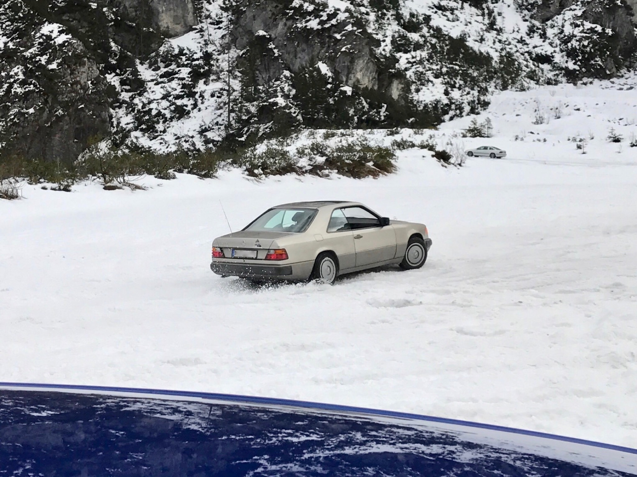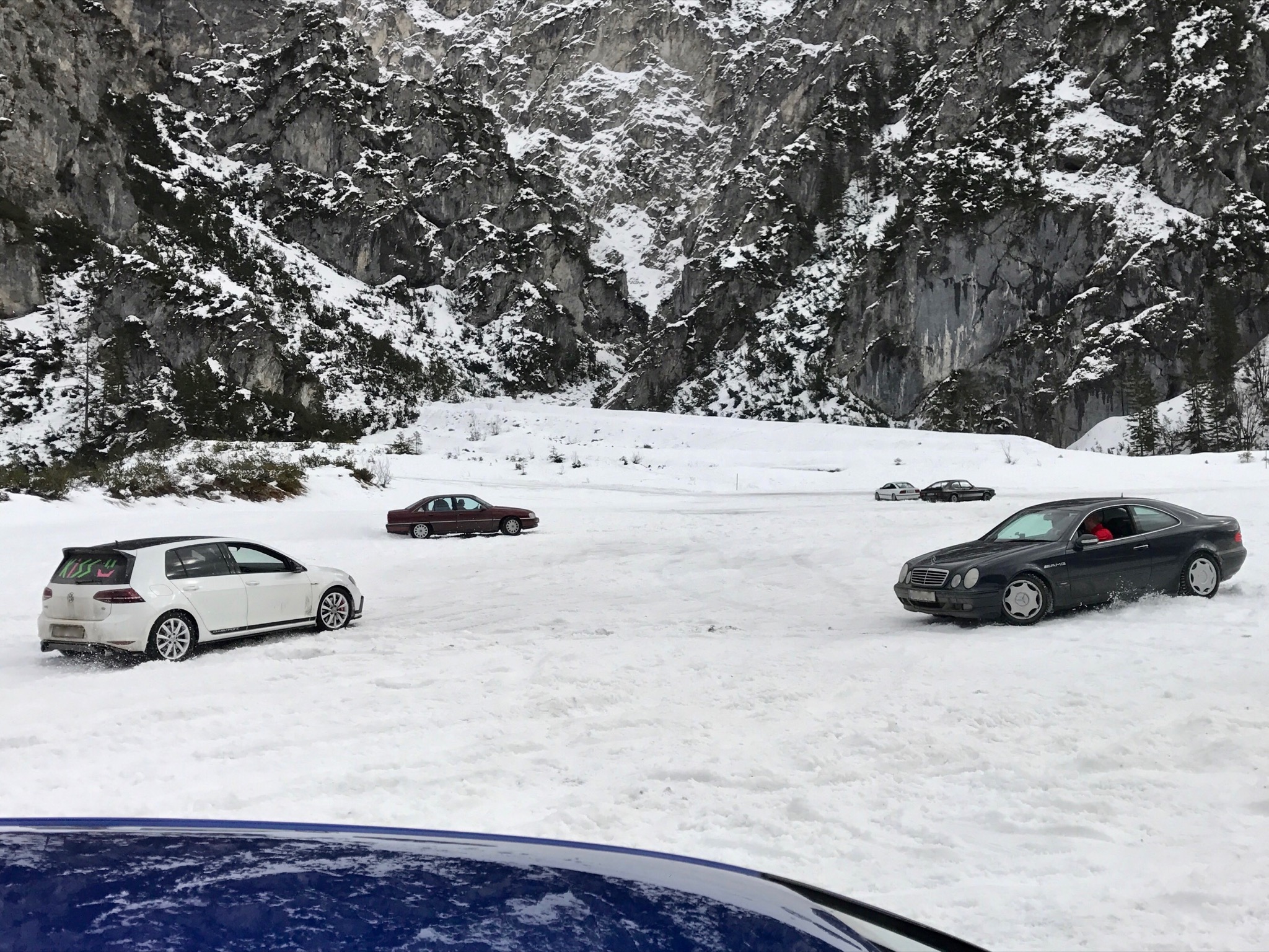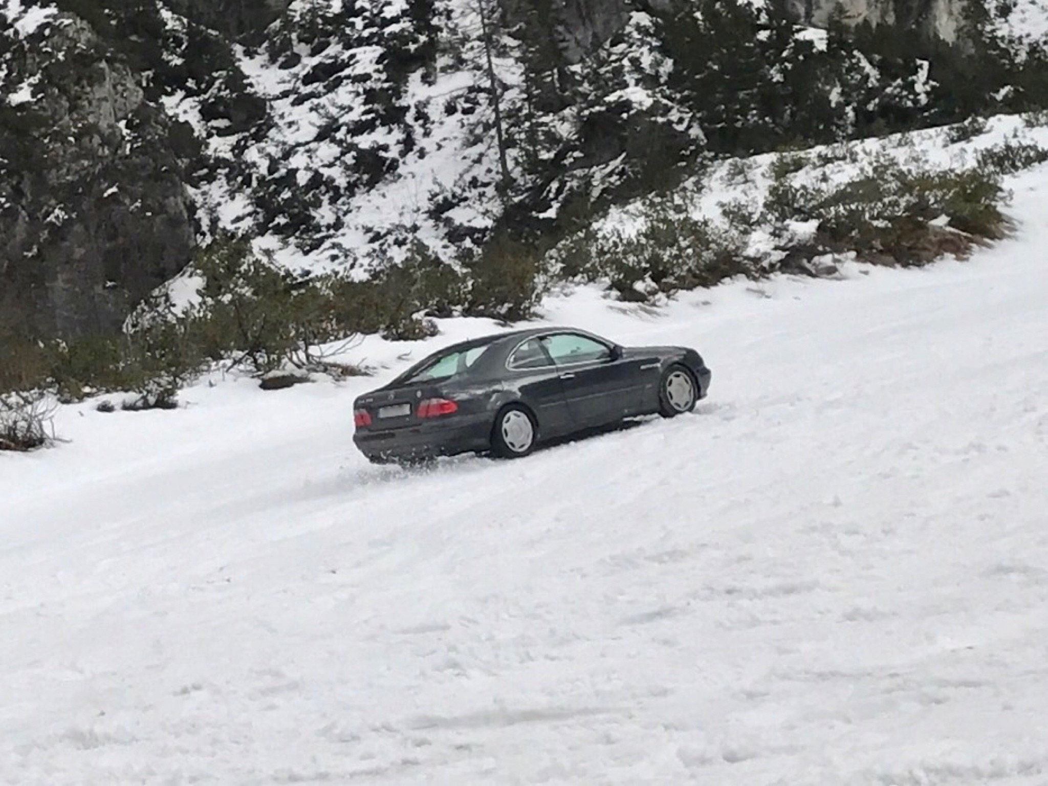 Die A6-Besatzung war derweil zu dem Schluss gekommen, ihren fahrbaren Untersatz am nächsten Tag besser auf dem hoteleigenen Parkplatz stehen zu lassen – ein Fehler, wie sich später herausstellen sollte. Denn an diesem Tag ging es ins slowenische Planica und ausgerechnet dort fanden wir ihn letzten Endes: den Schnee! Zwar lag er nur auf einem abgesperrten Parkplatz, der uns von einigen vollkommen vertrauenswürdigen slowenischen Parkwächtern als „Audi-Teststrecke“ verkauft wurde – und das zog: innerhalb weniger Sekunden war die erste Hälfte der Truppe kopflos in ihre Autos gestürmt. Bis zum Mittagessen wurden hier freudig Kreise gedreht, die Traktion der unterschiedlichen Allrad-Konzepte verglichen und nebenbei noch ein kleines Feuer gelöscht, das den angeranzten C 230 ansonsten vollständig in Besitz genommen hätte.