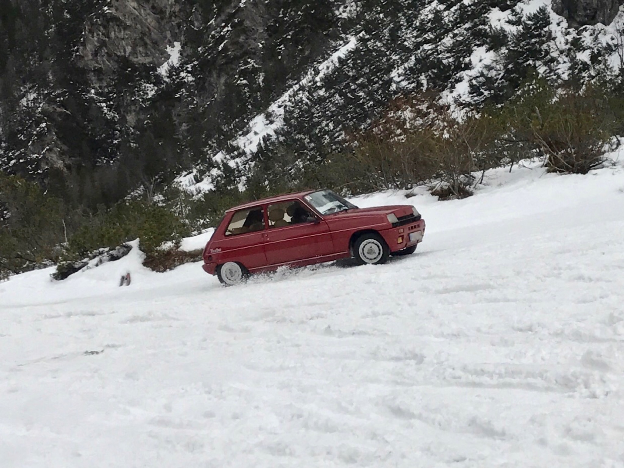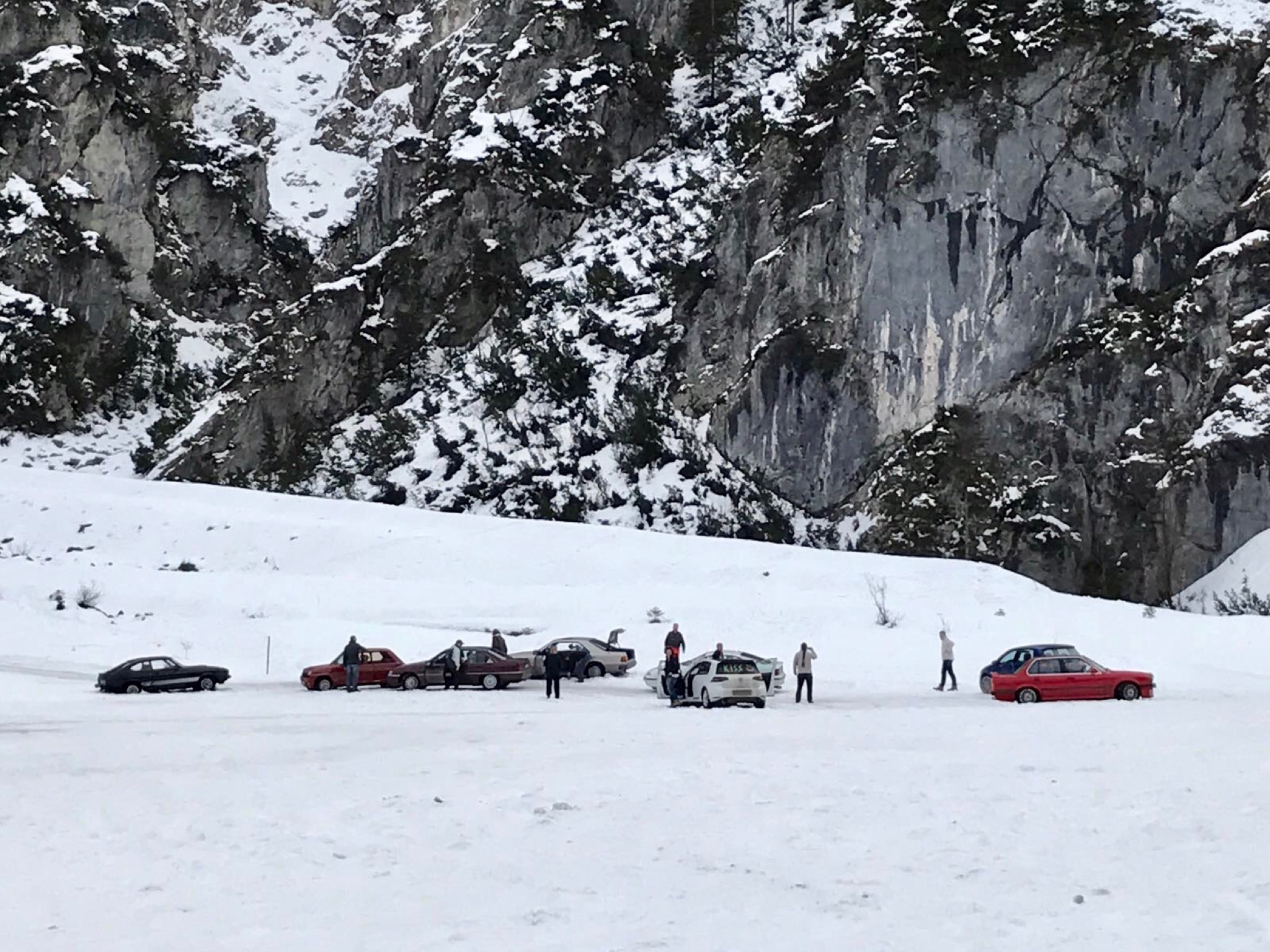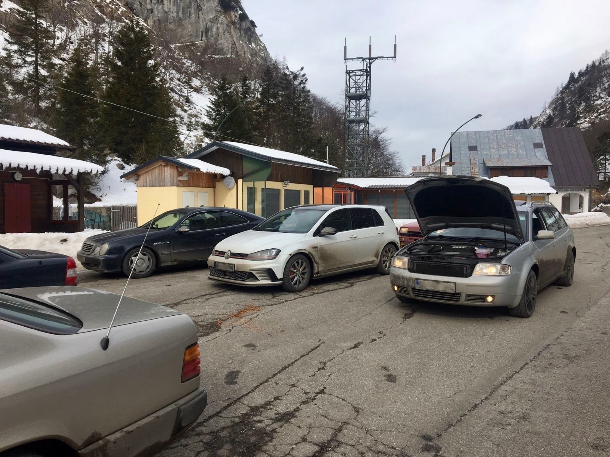Die A6-Besatzung war derweil zu dem Schluss gekommen, ihren fahrbaren Untersatz am nächsten Tag besser auf dem hoteleigenen Parkplatz stehen zu lassen – ein Fehler, wie sich später herausstellen sollte. Denn an diesem Tag ging es ins slowenische Planica und ausgerechnet dort fanden wir ihn letzten Endes: den Schnee! Zwar lag er nur auf einem abgesperrten Parkplatz, der uns von einigen vollkommen vertrauenswürdigen slowenischen Parkwächtern als „Audi-Teststrecke“ verkauft wurde – und das zog: innerhalb weniger Sekunden war die erste Hälfte der Truppe kopflos in ihre Autos gestürmt. Bis zum Mittagessen wurden hier freudig Kreise gedreht, die Traktion der unterschiedlichen Allrad-Konzepte verglichen und nebenbei noch ein kleines Feuer gelöscht, das den angeranzten C 230 ansonsten vollständig in Besitz genommen hätte.
