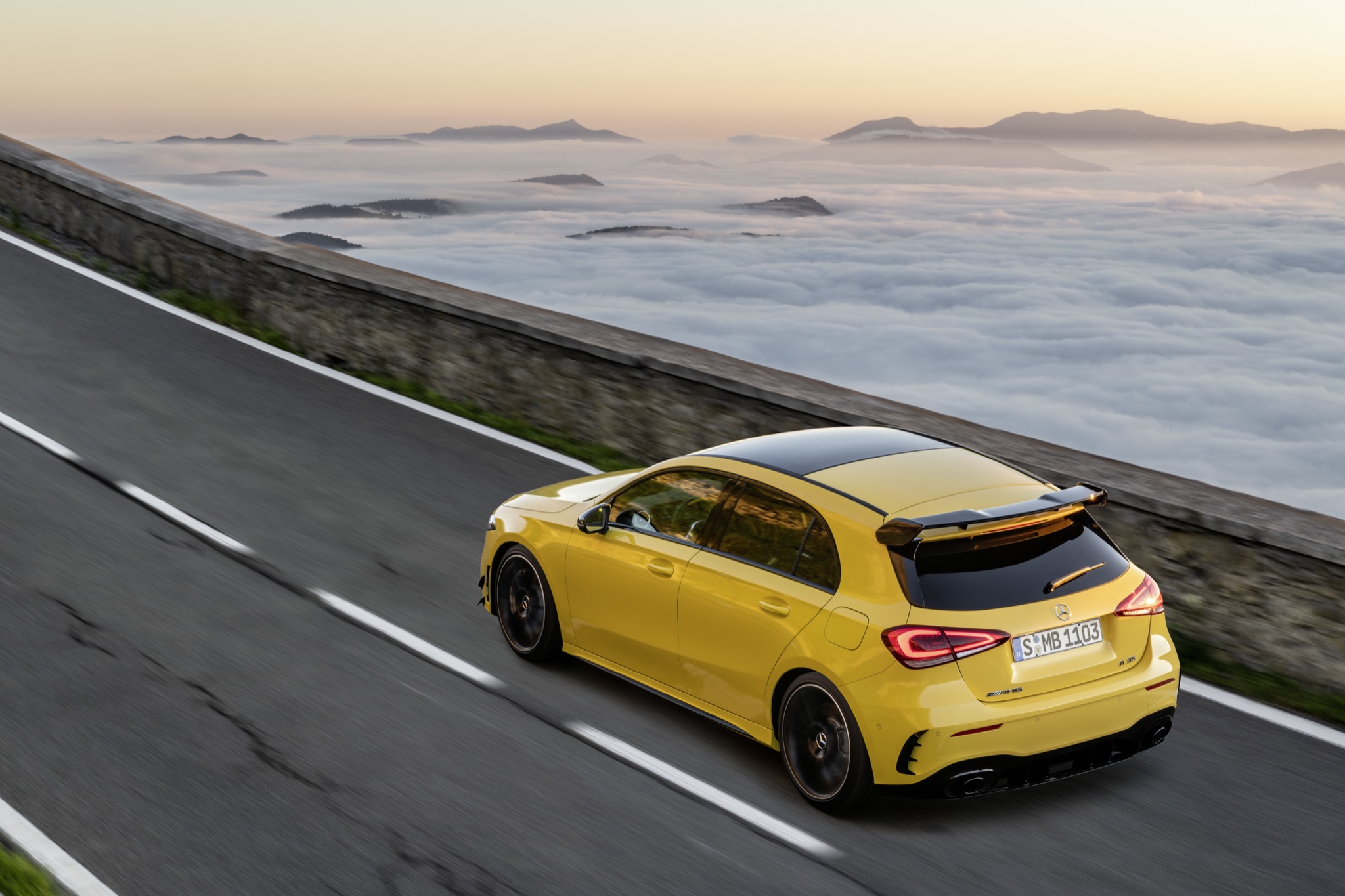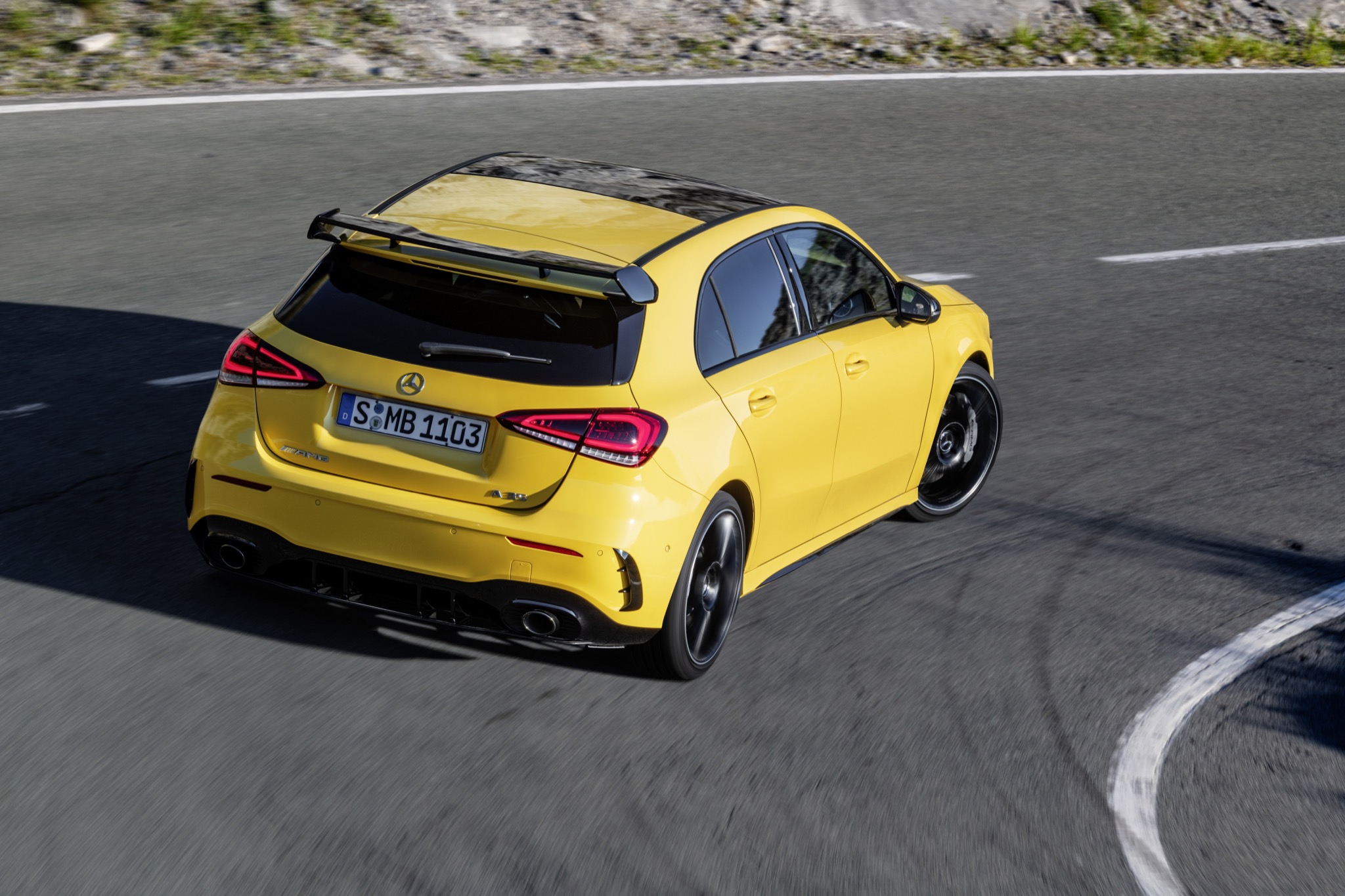 {1}Der lässt optisch schonmal nichts anbrennen! Mindestens so angriffslustig wie sein Vorgänger präsentiert sich der kleinste AMG, wobei ihm die Kriegsbemalung unserer Meinung nach deutlich besser steht als dem etwas rundlichen Vorgänger. Passend dazu wurde Sonnengelb für die Lackierung der Pressefahrzeuge ausgemacht, was in Verbindung mit vielen schwarzen Akzenten für einen aggressiven Gesamteindruck sorgt. Einige Elemente kennt man bereits aus der optional für die Standard-A-Klasse erhältlichen AMG-Line, andere wiederum sind individuell nur für den A 35 erhältlich. So beispielsweise die seitlichen Flics an der Front, der große angedeutete Diffusor am Heck samt zwei runden Endrohren der AMG-Klappenanlage und nicht zuletzt der große feststehende Flügel am Dachabschluss, den Mercedes-AMG technisch korrekt, aber etwas untertrieben „Abrisskante“ nennt.