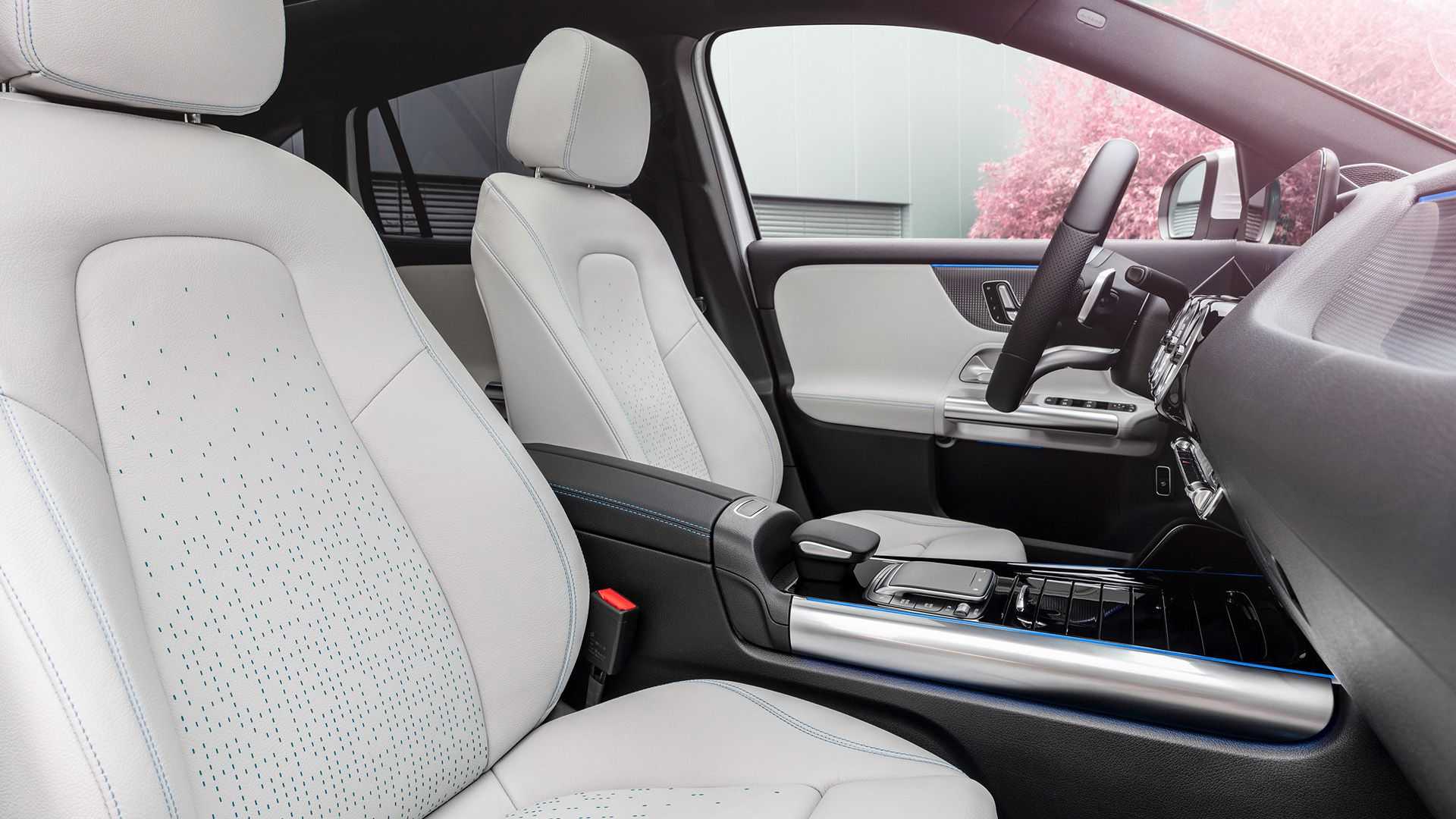 Gesteigert ist auch die Wertigkeit des Innenraums im EQA. Auch er vertraut auf das MBUX-Bediensystem und verziert das Armaturenbrett mit hinterleuchteten Flächen und roségoldenen Akzenten. Moderne wie nachhaltige Stoffe und eine feine Lederauswahl komplettieren das edle Ambiente des kleinen Stromers.