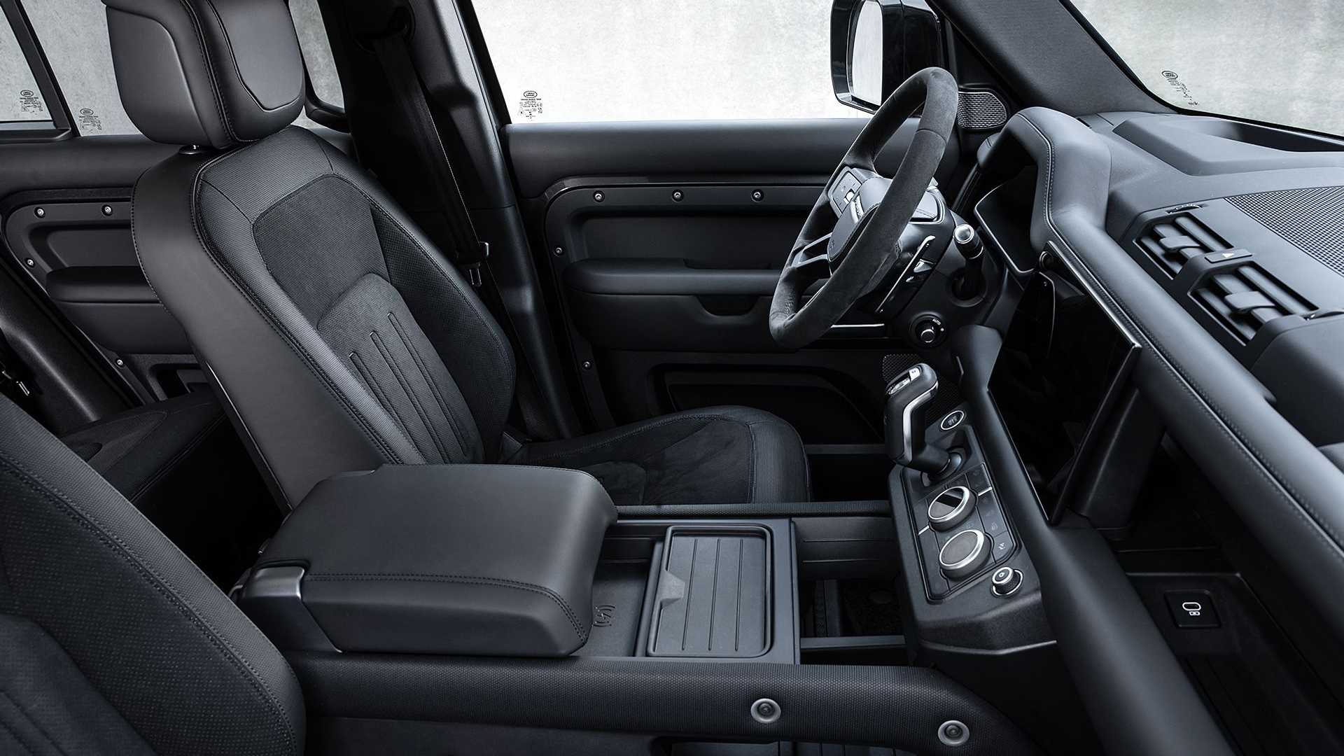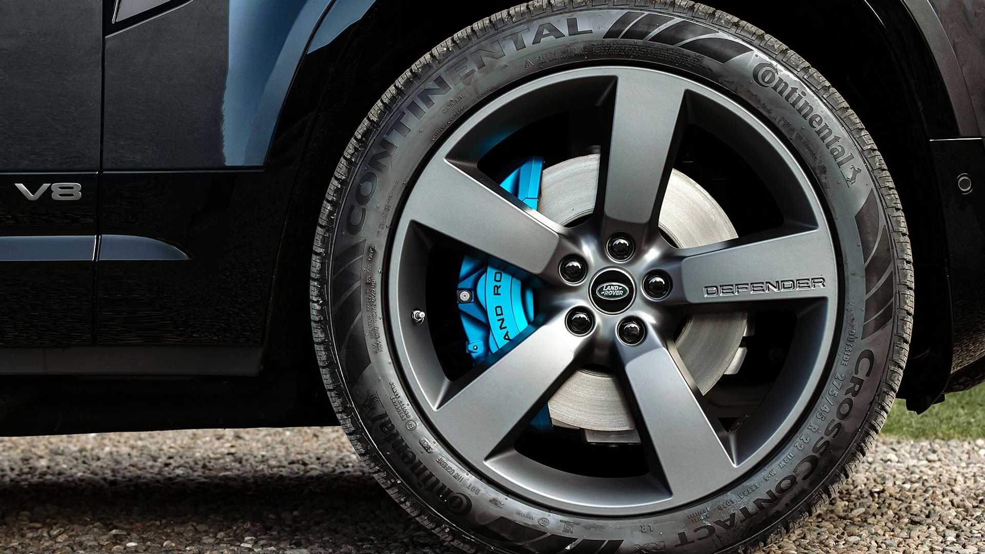 Auch auf der Straße sorgt er dank neuer Feder-Dämpfer-Abstimmung für mehr Dynamik. Der Gierregler der aktiven Hinterachs-Sperre wurde neben Geländefähigkeit überdies auf Performance abgestimmt. Stärkere Stabilisatoren, eine mächtige Bremsanlage mit blauen Sätteln und 22-Zoll-Felgen halten den V8-Defender noch besser auf Kurs.