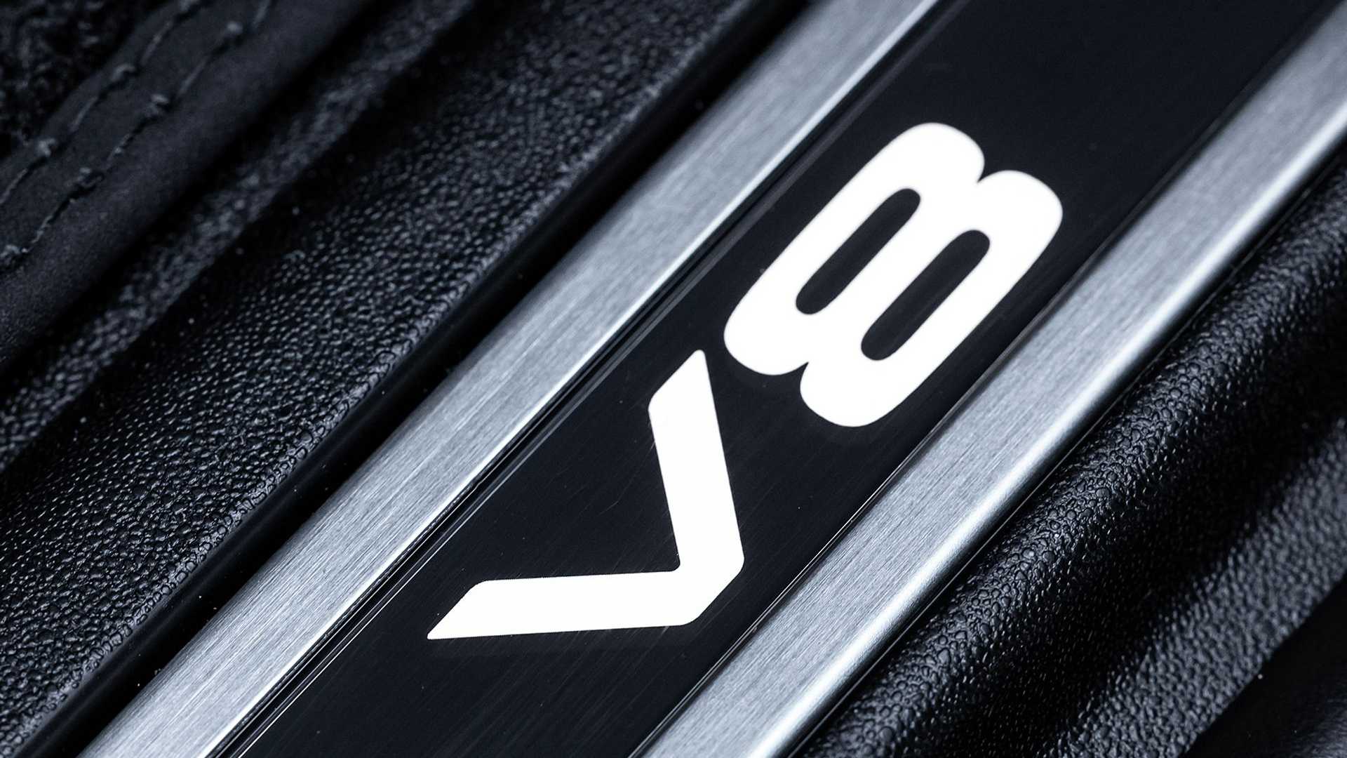 Optisch gibt es ebenfalls einige V8-Besonderheiten. Neben drei Farben, zwei jeweils mit kontrastierend schwarzem Dach, kommt innen edles Windsor-Leder zum Einsatz. Alcantara am Lenkrad und satinierte Alu-Schaltpaddles erzeugen Sportgedanken. V8-Signets finden sie ebenfalls als Abzeichen der motorischen Macht.