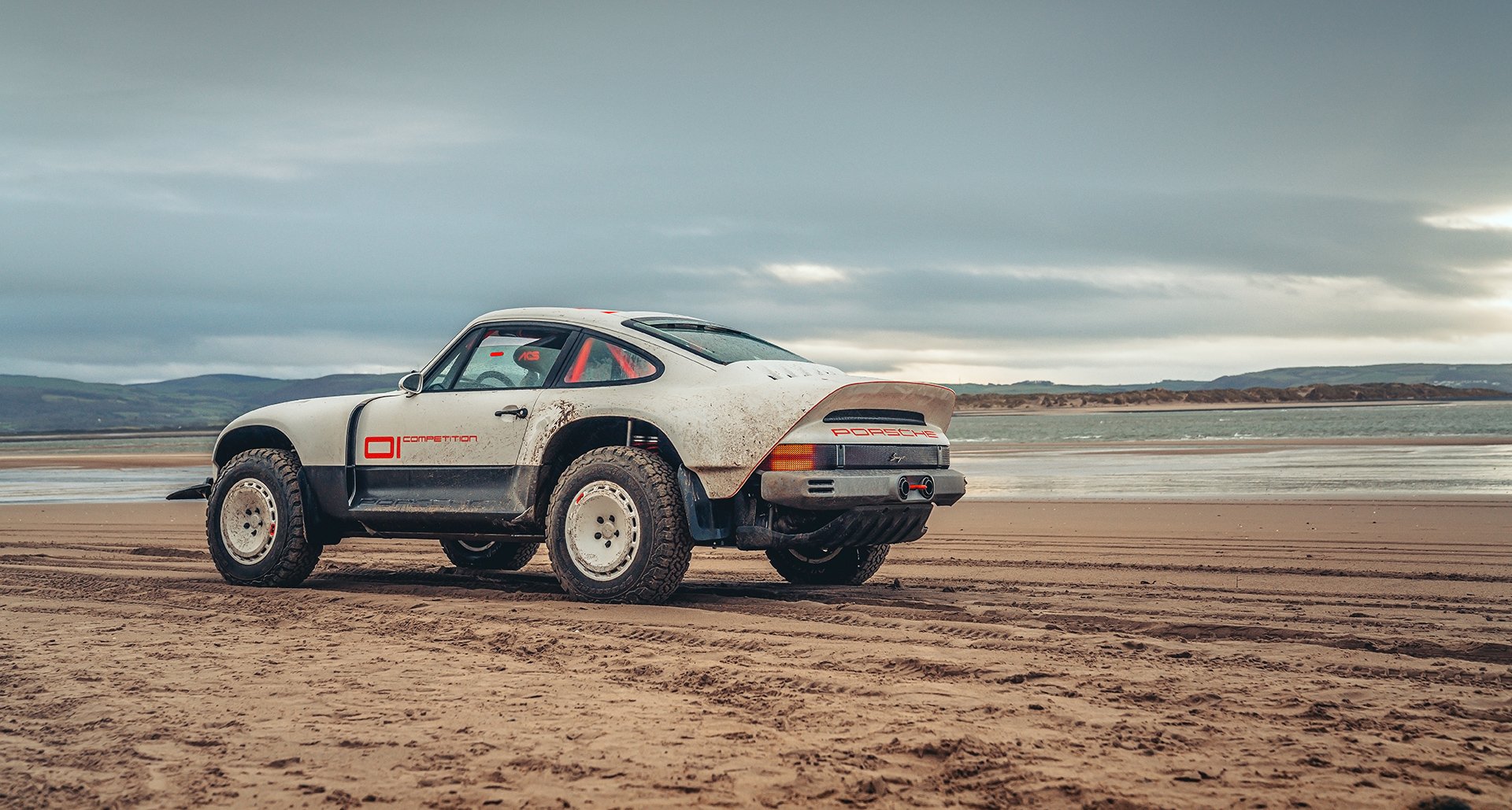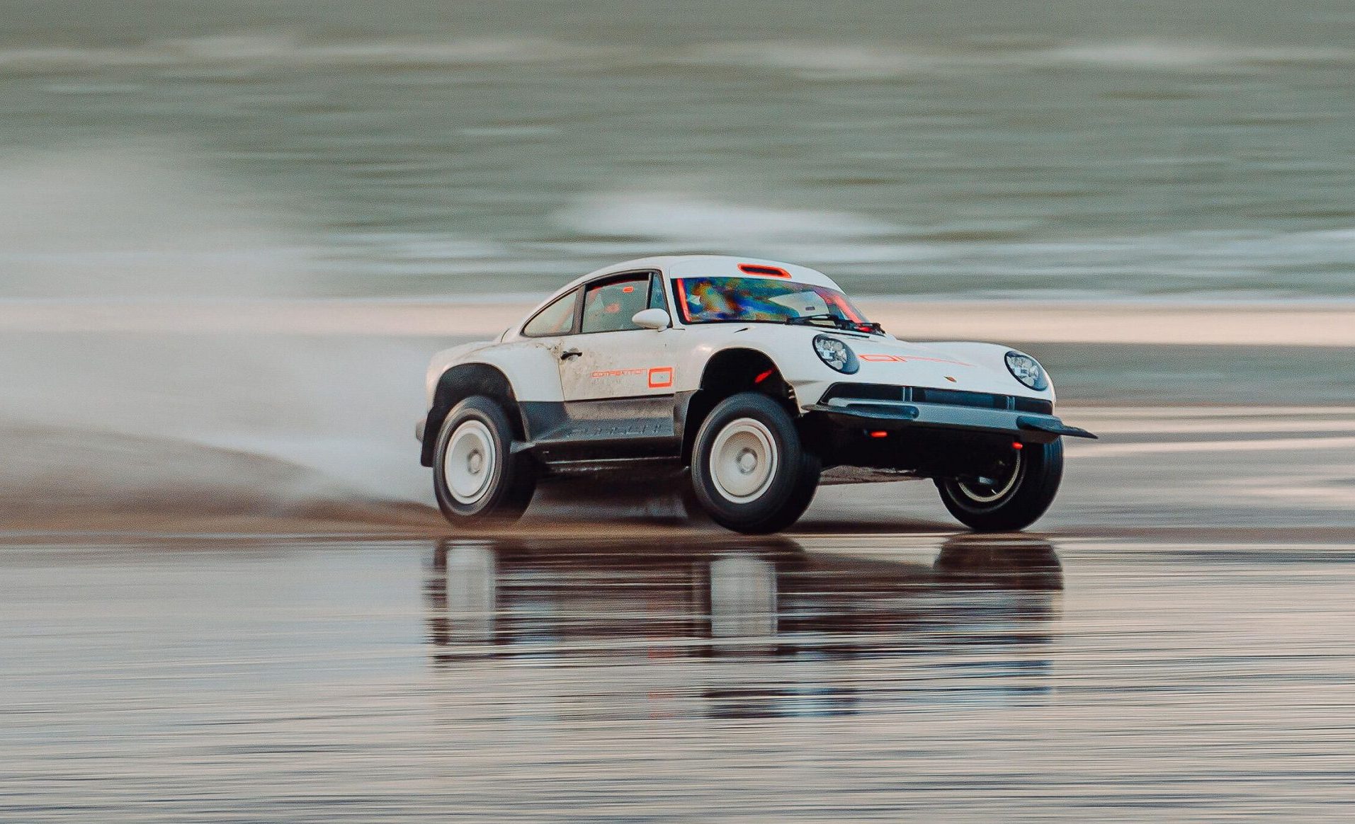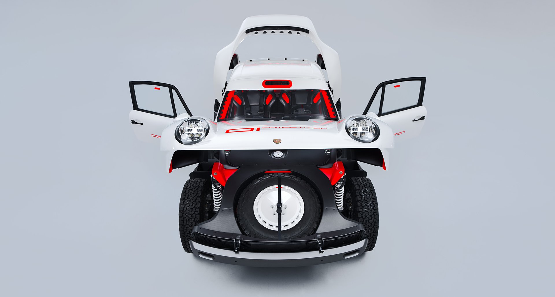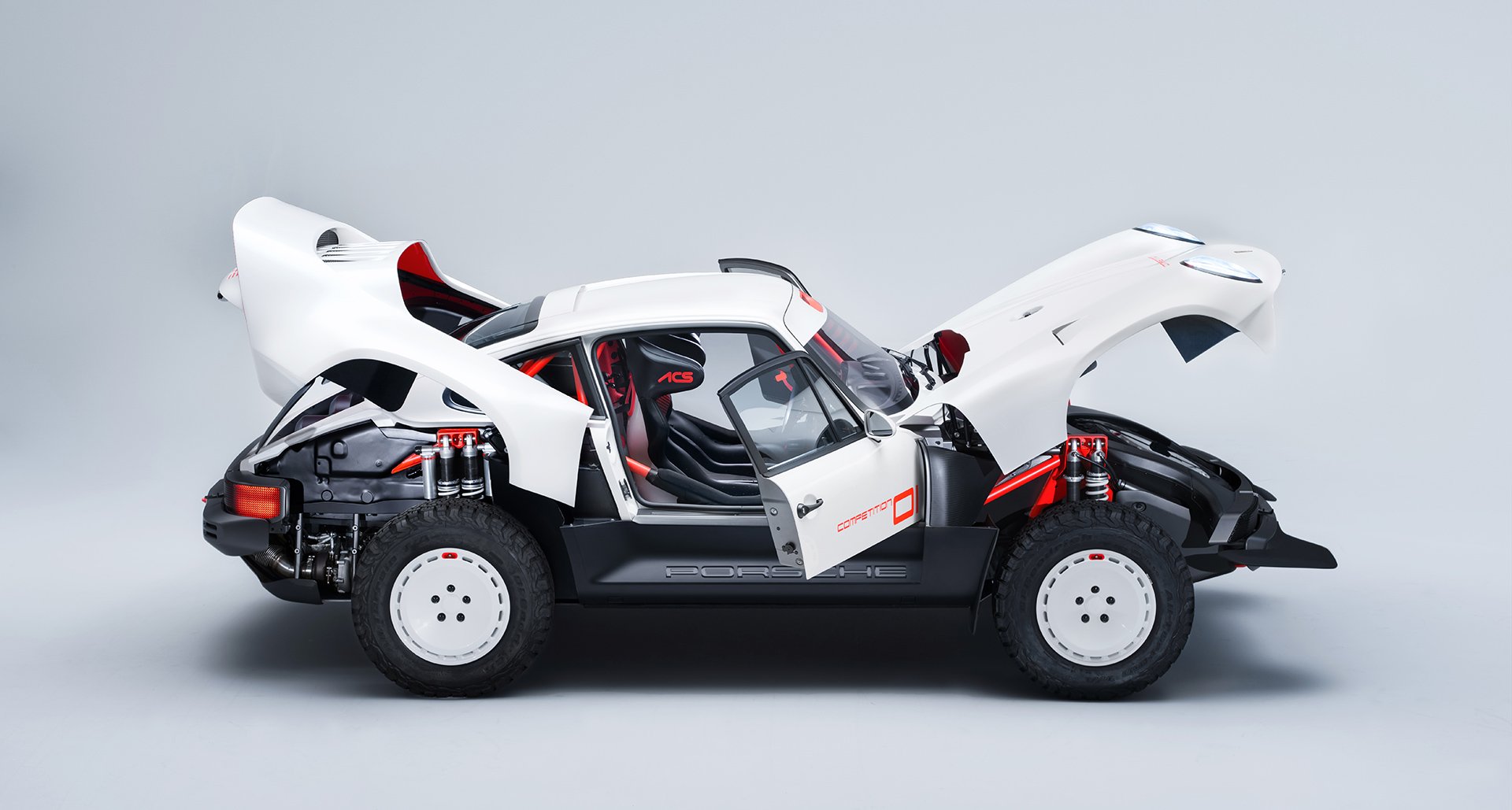 {1}Man nehme einen 964er-911 aus dem Jahre 1990 als Basis. Dann versteife man das Chassis, baue alles ein, was man auf einer Paris-Dakar oder Baja 1000 so brauchen kann. Soll heissen: acht Dämpfer etwa, Vierkolben-Monoblock-Stahlbremsen, FIA-Überrollkäfig. Schliesslich gebe man noch einen Bi-Turbo-3,6-Liter-Boxer mit 450 PS und 570 Nm maximalem Drehmoment hinzu.