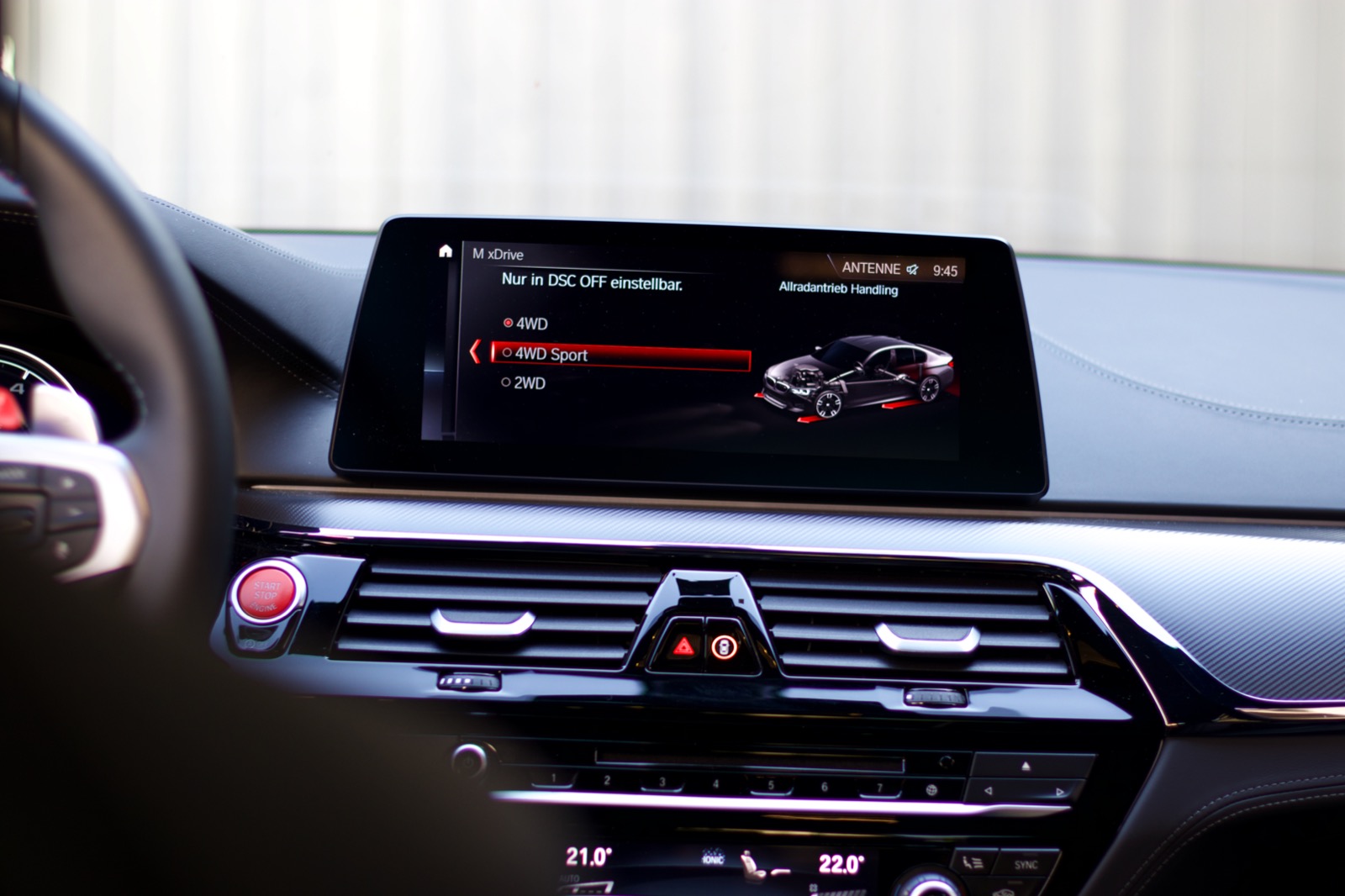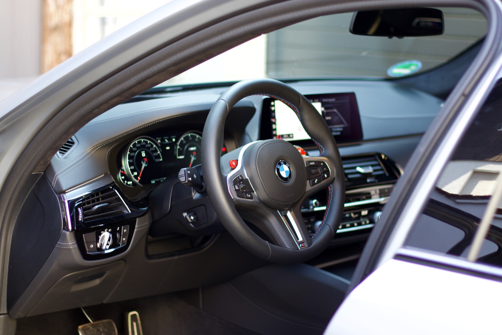 Ganz und gar nicht der Erheiterung feilbieten wollen wir den Innenraum des M5 Competition. Der glänzt in bester und gewohnter Fünfer-Manier mit hoher Verarbeitungsqualität und mehr als ordentlicher Materialauswahl. Die Ergonomie sowie die M5-eigenen roten Wahltasten am Lenkrad stehen diesem Niveau nicht nach. Einzig die Kopfstützen der ansonsten fabelhaften und zigfach verstellbaren Sportsitze fielen mit dem Härtegrad derer italienischer Kleinstwagen negativ auf.