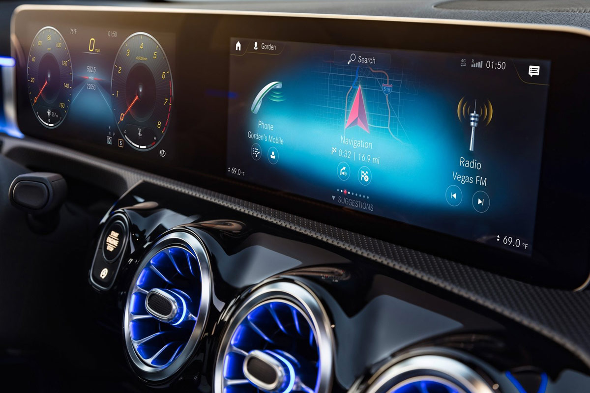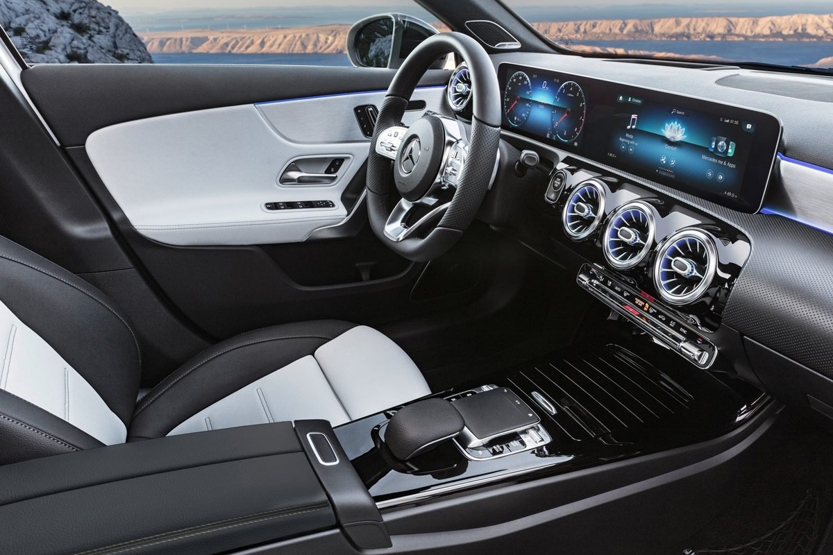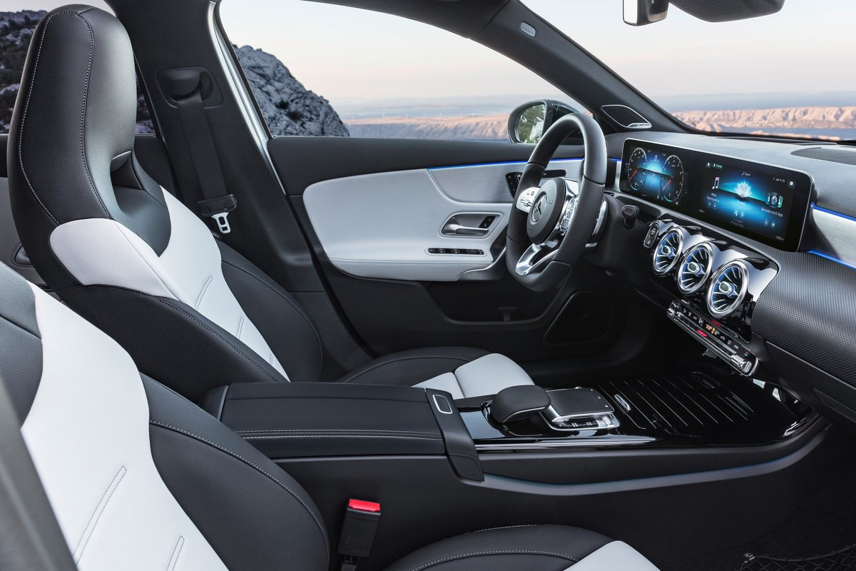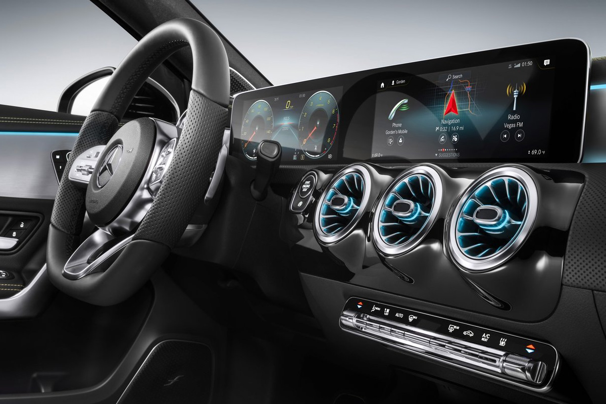 Zwei 10,25-Zoll-Bildschirme sind optional verfügbar und sorgen für S-Klasse-Feeling im kleinsten Spross aus Stuttgart. Dabei setzt die A-Klasse erstmals auf das neue Mercedes MBUX (Mercedes Benz User Experience) System, dessen Aufbau an ein Handybetriebssystem erinnert und dass mit regelmäßigen Updates auf dem aktuellsten Stand gehalten werden soll. Das MBUX-System der A-Klasse soll überdies mit einer intuitiven und intelligenten Sprachbedienung gesteuert werden können. Ob es jedem gefällt, dass die eingebaute „Künstliche Intelligenz“ sich die Route des Nachhausewegs merkt oder weiß wen wir an bestimmten Zeiten anrufen bleibt abzuwarten.