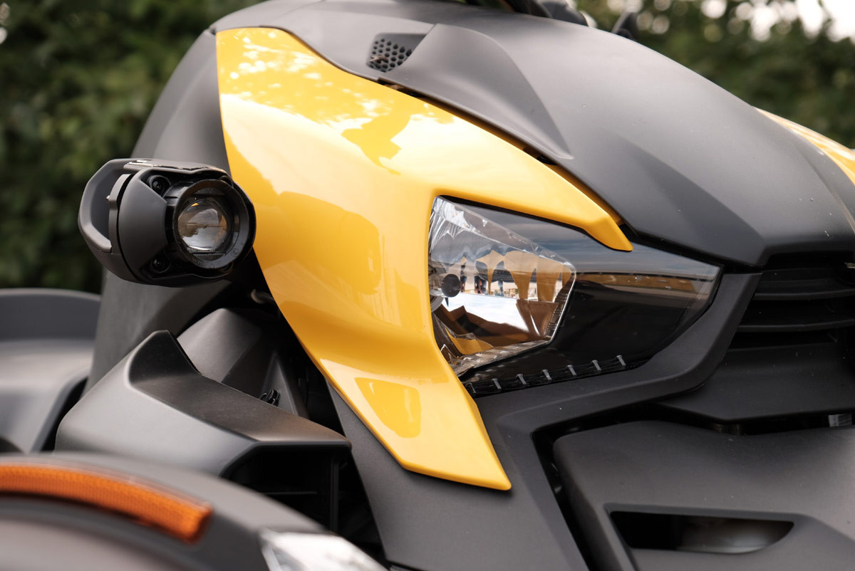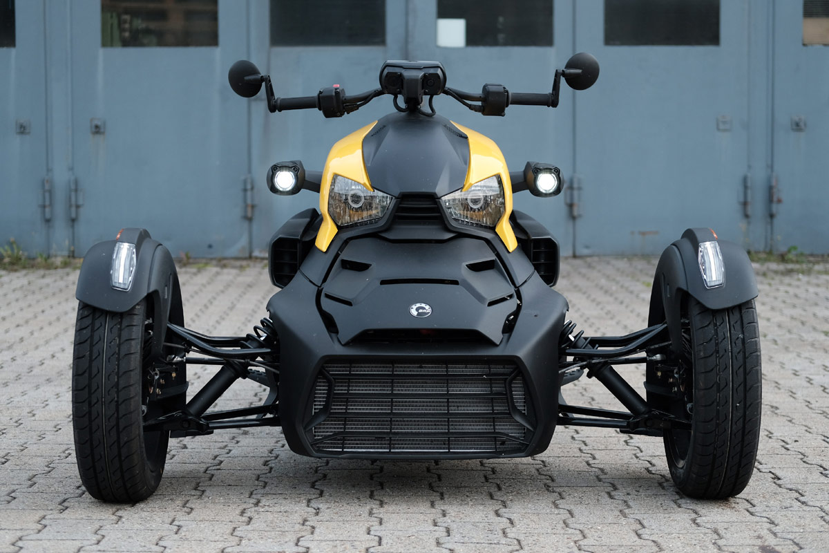 Das Kärrele ist ein Dreirad, 2,35m lang, 1,50m breit und 1,00m hoch. „Kärrele“ ist dabei schon sehr verniedlichend, denn immerhin bringt der Ryker 270kg auf die Waage. Doch schauen wir uns den Ryker mal genauer an: Flach über den Boden geduckt, mit weit geöffnetem Kühlerschlund, grimmig dreinschauend mit den beiden außenliegenden LED Scheinwerfersatelliten funkelnd (die innenliegenden Halogenscheinwerfer dienen nur dem Fernlicht) und mit gelben Bodypanels geschmückt, wirkt der Ryker wie eine Kreuzung aus Batmobil und Wespe. Also durchaus ein dynamisches Erscheinungsbild, dieser Ryker.