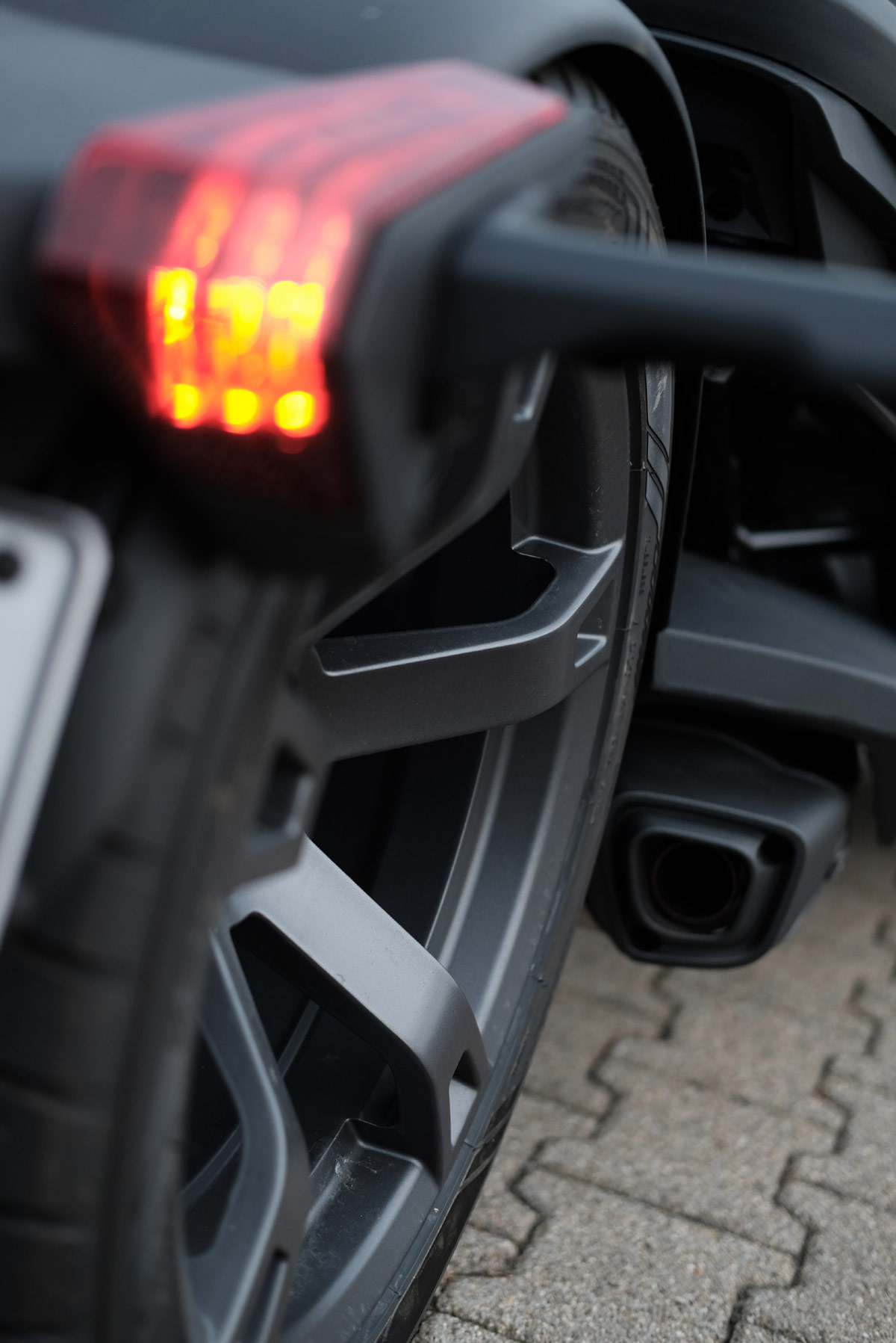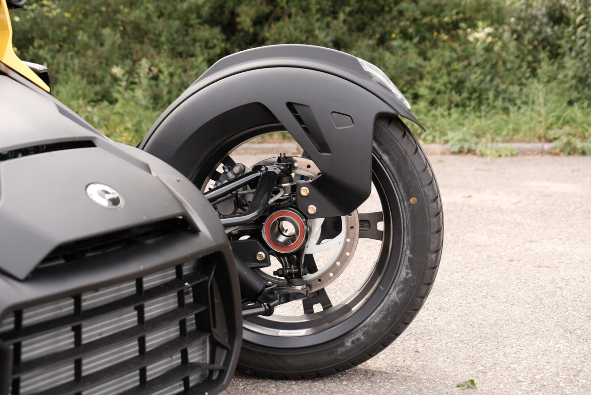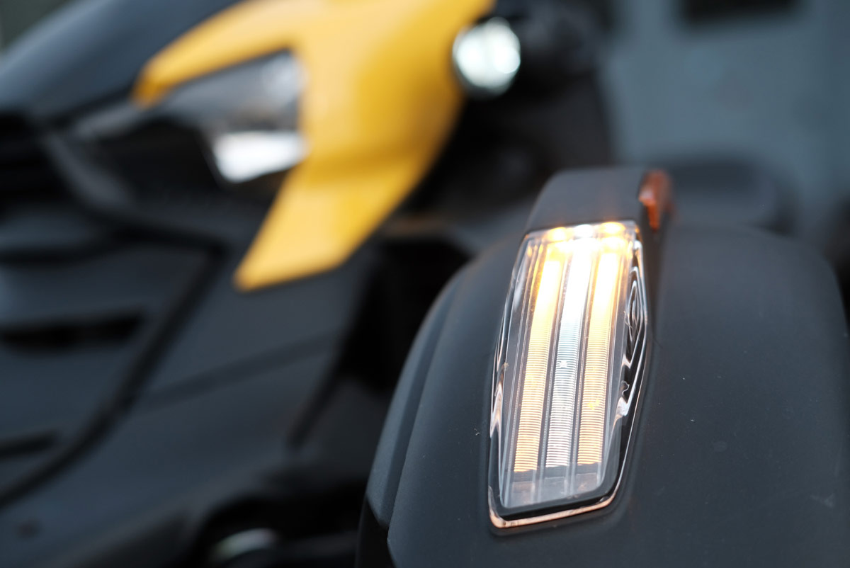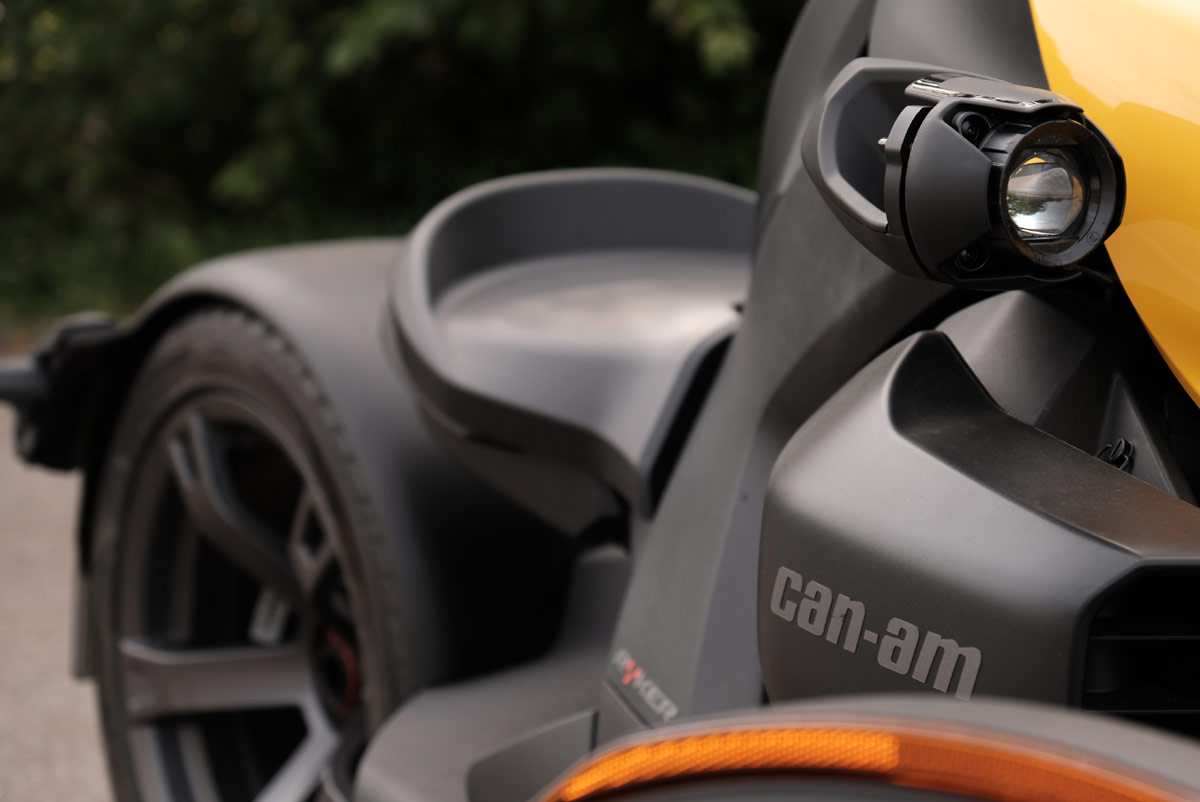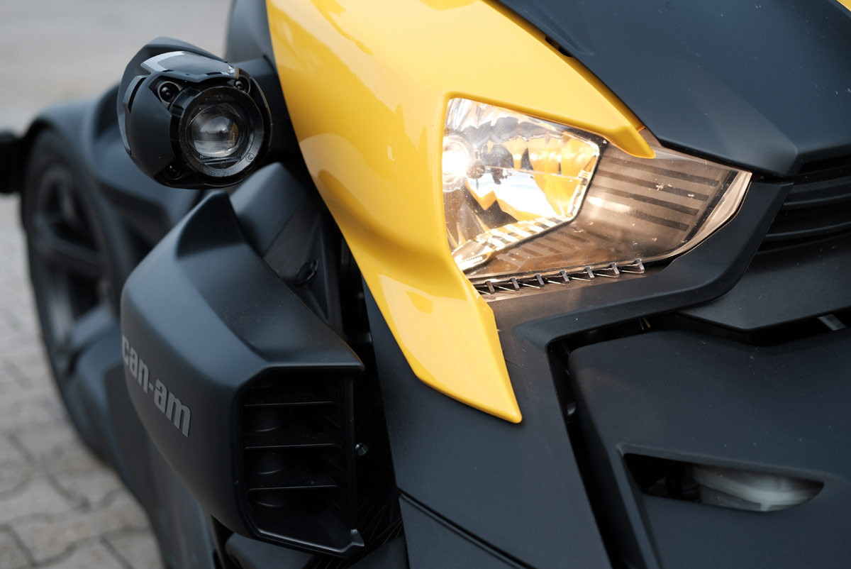 Das Kärrele ist ein Dreirad, 2,35m lang, 1,50m breit und 1,00m hoch. „Kärrele“ ist dabei schon sehr verniedlichend, denn immerhin bringt der Ryker 270kg auf die Waage. Doch schauen wir uns den Ryker mal genauer an: Flach über den Boden geduckt, mit weit geöffnetem Kühlerschlund, grimmig dreinschauend mit den beiden außenliegenden LED Scheinwerfersatelliten funkelnd (die innenliegenden Halogenscheinwerfer dienen nur dem Fernlicht) und mit gelben Bodypanels geschmückt, wirkt der Ryker wie eine Kreuzung aus Batmobil und Wespe. Also durchaus ein dynamisches Erscheinungsbild, dieser Ryker.