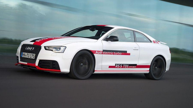 Die Reaktion auf das demnächst auf der AMI in Leipzig (31. Mai bis 8. Juni) stehende Exemplar dürfte kaum anders ausfallen: Es basiert auf dem Audi RS5 Coupé, der normalerweise den altbekannten 4.2 V8 FSI mit 450 PS hinter seinem Wabengrill trägt. Mit dem Zusatz „TDI“ geht Audi nun den Weg, den bereits BMW mit dem M550d beschritten hat: Ein Dreiliter-Diesel garniert mit zwei Turboladern, soweit so gut (dieser leistet z.B. im A7 313 PS und 650 Newtonmeter Drehmoment). Das eigentliche Schmankerl haben sich die Bayern allerdings zum Schluss aufgehoben. So gesellt sich zu den zwei Ladern ein dritter, rein elektrisch betriebener Lader, der für den unteren Drehzahlbereich zuständig ist und so das Wörtchen „Turboloch“ endgültig aus dem Diesel-Vokabular streichen soll.